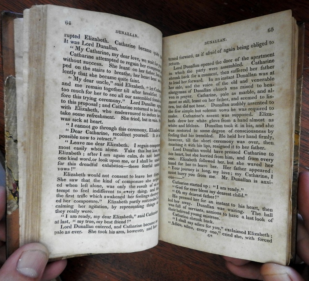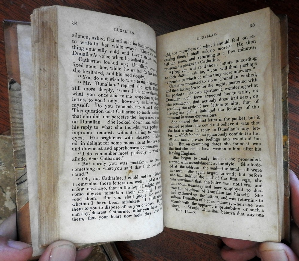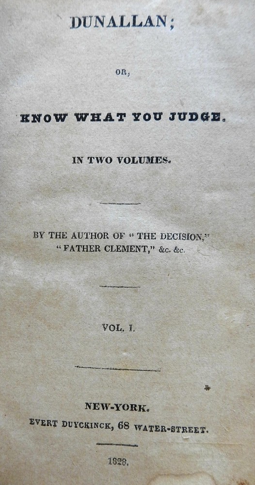 Dunallan Know What You Judge 1828 Grace Kennedy Duyckinck rare set leather books Dunallan Know What You Judge 1828 Grace Kennedy Duyckinck rare set leather books (Old Books, Literature, Female Authors, Grace Kennedy, Scottish Lit, Leather Books). Dunallan; or, Know What You Judge, by Grace Kennedy. Published 1828, New York by Evert Duyckinck. 2 Volumes, 288, 288 pages. Text in English. Rare American imprint in nice period bindings typical of the era. Period 1/2 leather bindings, smooth spines, gilt bands, gilt title lettering on contrasting black leather labels, marbled covers. Bindings remain clean, tight, and sound. Text blocks well uniformly age browned with scattered spotting, never offensive. Set remains well preserved and attractive on the shelf. Leather remains supple. Set displays a pleasing and unique age patina and is in nice antiquarian condition, the age flaws easy to overlook or forgive. Please review photos for more detail and our best attempt to convey how this antique item survives. Books Measures c. 6" H x 3 7/8" W. [B577].
