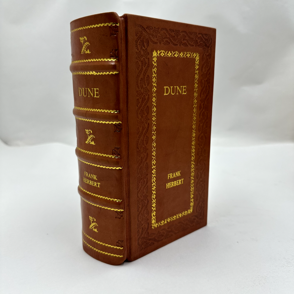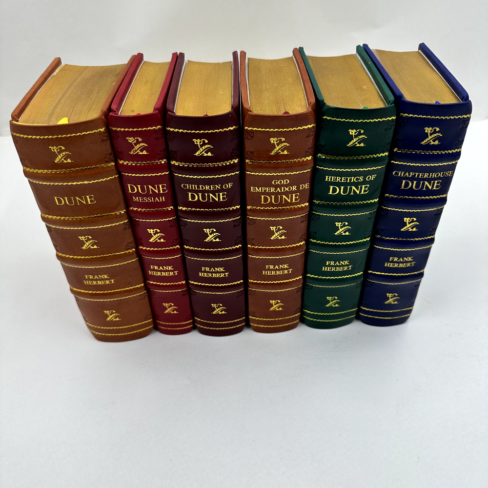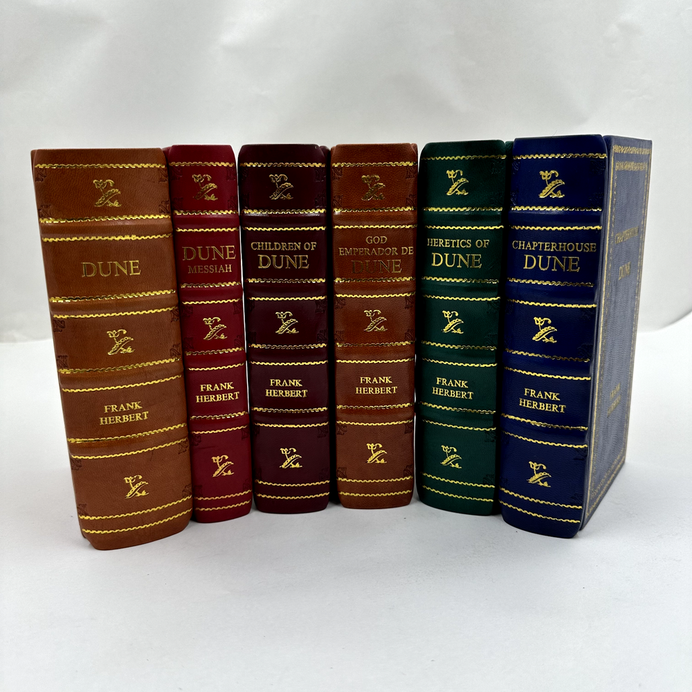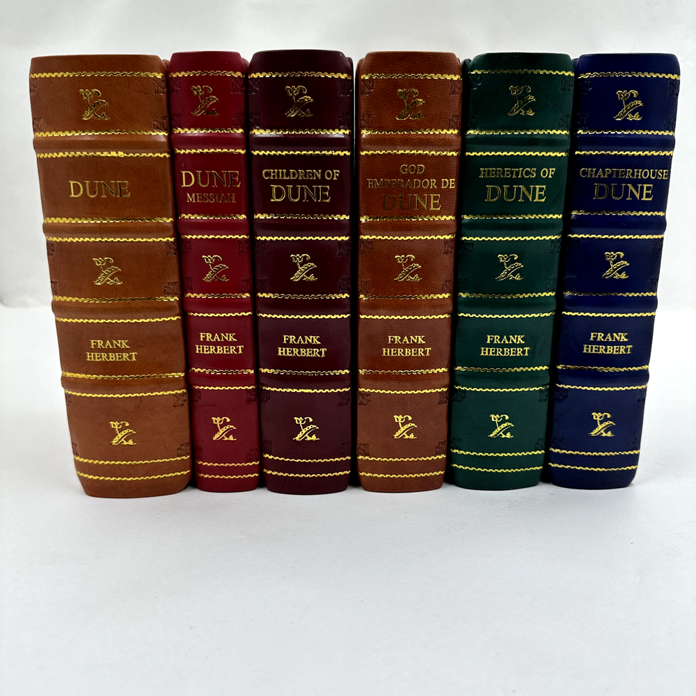 GYAN BOOKS INTRODUCING A REMARKABLE LEATHER-BOUND EDITION, METICULOUSLY CRAFTED BY THE ESTEEMED INSTITUTION " RARE BIBLIO". This title holds the distinction of being a Bestseller, highly praised by readers across the GLOBE. We are thrilled to present this literary gem exclusively to our elite readers, meticulously encased in our one-of-a-kind Premium Leather Binding . Following your order, we purchase the book from the original publisher/distributor and embark on the process of rebinding to elevate this book to a Luxurious Reading Style. A UNIQUE LEATHER-BOUND BOOK FOR ELITE READERS/COLLECTORS OF OLD RARE AND BESTSELLING BOOKS. For the Binding, we use GENUINE LEATHER , graced with opulent GOLDEN LEAF DETAILING on the SPINE , FRONT COVER , AND BACK COVER , ADDED BY EDGE GILDING . ABOUT US ★ We deal into reprinting of the master pieces crafted by authors around the world. ★ We are proud to say that we have a collection of over 25 million books and our collection includes books that are as old as 200 years and hence are considered as RARE BOOKS. ★ We are pioneer in this field having experience of 40 years. ★ We also undertake printing and Leather Binding jobs of other books. ★ Thesis printing and Leather Binding is one of our important Service ★ Many publishers and author approach us for their books to bind in our Unique leather binding format for their special customers. ★ Our craftsmen are active in this job since generations. ★ Restoration of old books is our expertise ★ We are known by our Customization options. ★ We have many leather color options in our bucket. ★ The whole process is done manually so that it gives you the same feeling of old book. OFFERS & SPECIALIZATION: ★ SPECIAL DISCOUNT FOR BULK ORDERS, PLEASE CONTACT US. ★ CHOOSE ANY LEATHER COLOR OF YOUR CHOICE WITHOUT ANY EXTRA CHARGES, JUST CLICK ON IMAGES FOR OPTIONAL COLORS AND INFORM US YOUR CHOICE THROUGH MAIL WITH COLOR CODE. ★ WE OFFER A DIVERSE RANGE OF LEATHER COLORS, INCLUDING RED , GREEN , BLUE , BLACK, MAGENTA , YELLOW , TAN . WE ALSO OFFER MULTI-COLOR LABELS WITH THESE BEAUTIFUL BOOKS ON SPECIAL REQUEST. ★ AN ORIGINAL LEATHER IS BEING USED FOR BINDING THIS BOOK WITH GOLDEN LEAF PRINTING AND DESIGNING ON SPINE, FRONT AND BACK OF THE BOOK WITH EDGE GILDING . Points to note before booking order: ★ In case of multi volume sets, please note that the above listing is for a single volume only. (To order multiple volumes, please contact us separately). ★ We urge you to appreciate that our Leather-Bound Books are Genuine works of art and are Handcrafted by our Professional Craftsmen. Thus, requiring time and care to reach the pinnacle of excellence. ★ We Prepare the Book after receiving the Order. ★ We request you to understand that these leather-bound books are work of art and hence require time to go through different process to be the master pieces that they are. ★ We usually take 40 business days as handling time to dispatch shipment. We consider special request for a special occasion. ★ Craftsman based in India, prepared this book and shipped from different stock locations around the Globe. Product Details: - ★ Complete Title: Dune Series 6 Books Collection Set By Frank Herbert (Dune, Dune Messiah,God Emperor Of Dune, Heretics of Dune, Chapter House Dune, Children Of Dune) [Premium Leather Bound] ★ Author: Frank Herbert ★ Language: English ★ No. Of Pages: 2752 ★ Year: 2021 ★ We provide ?Extra customization*? on request with additional charges. ★ We also undertake printing and Leather Binding of all the books. ★ Product Disclaimer: Please be aware that because leather is a natural material, slight discoloration or change in texture may be visible. About the Book: - Dune Series: 6-Book Collection Set by Frank Herbert – Immerse yourself in the epic sci-fi masterpiece that redefined the genre. This complete set includes all six novels in the legendary Dune series, following the rise and fall of empires, complex characters, and the struggle for control over the desert planet Arrakis. A must-have for any science fiction fan or collector!