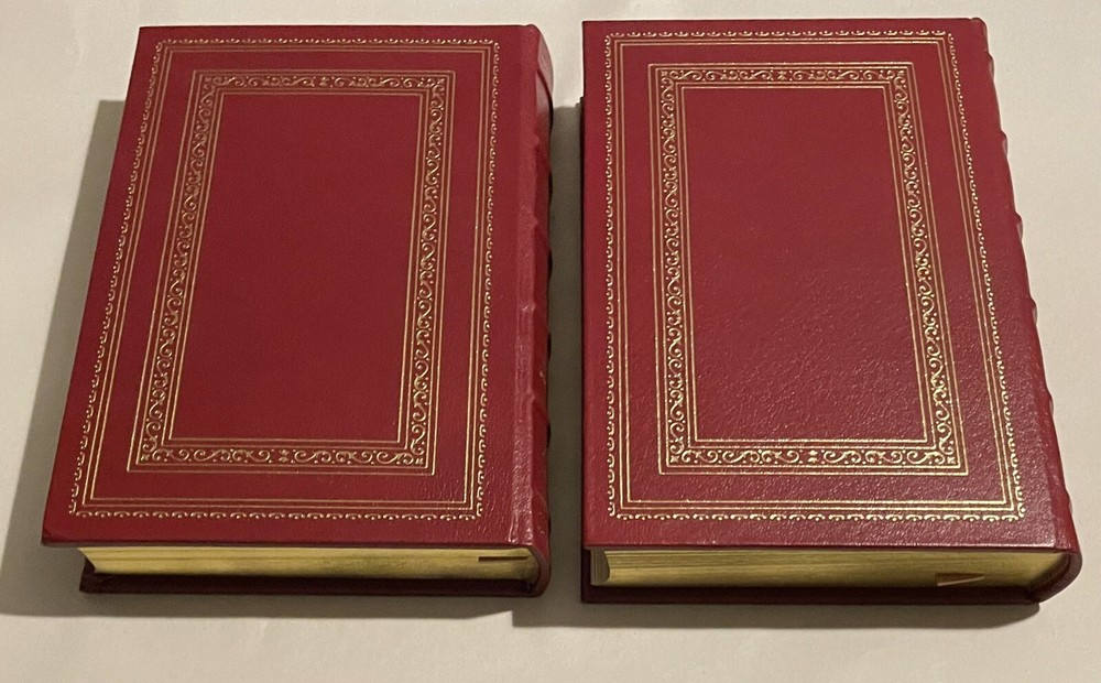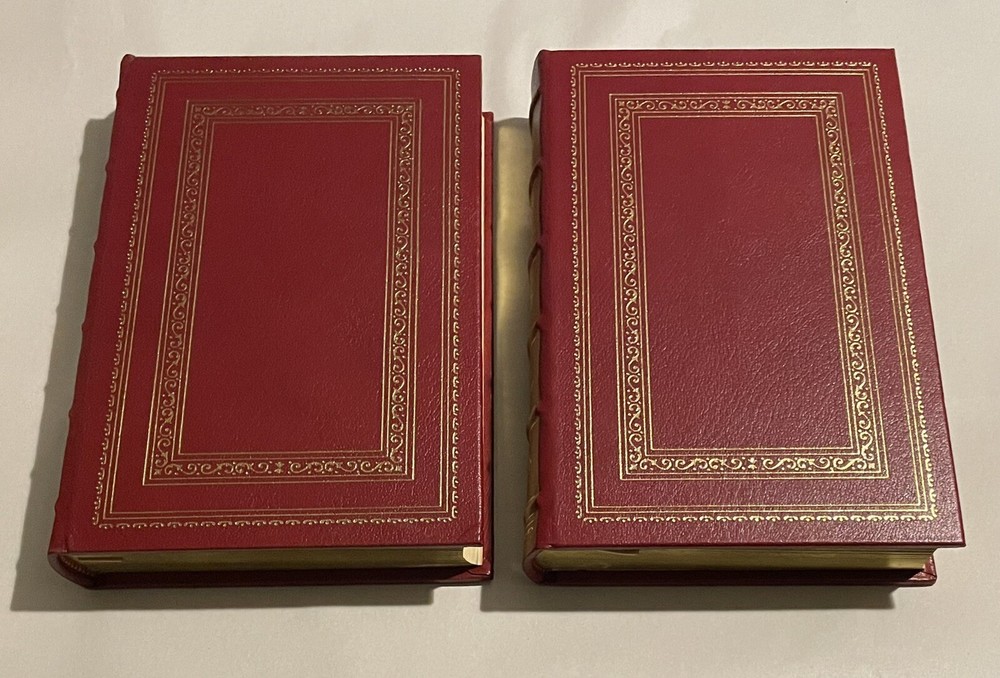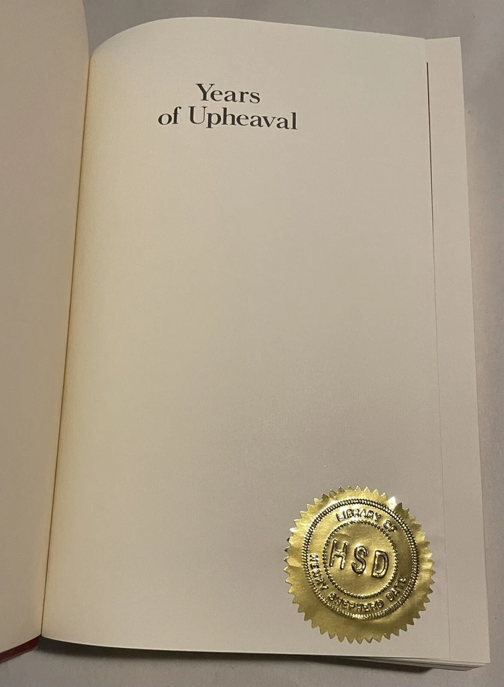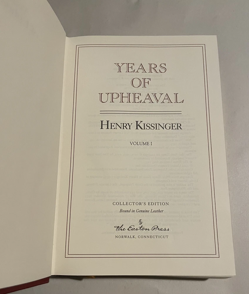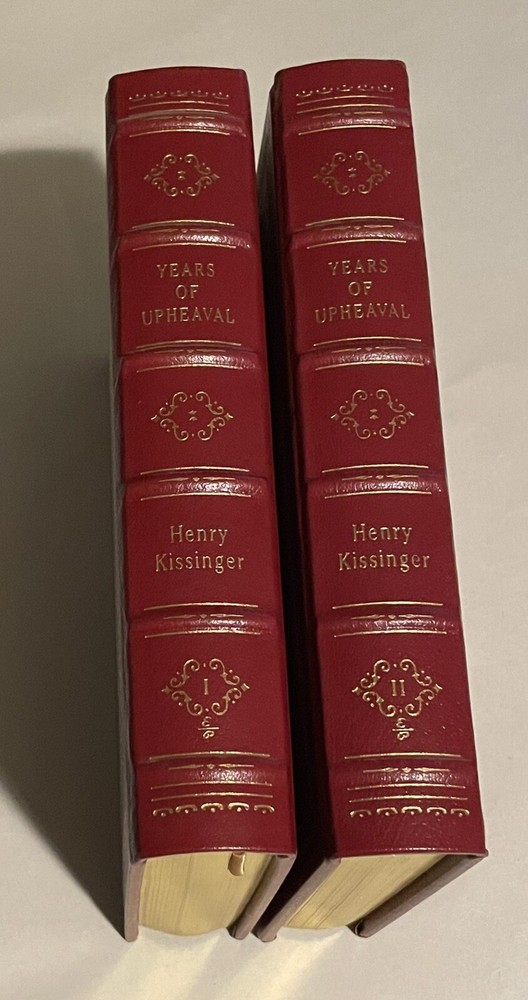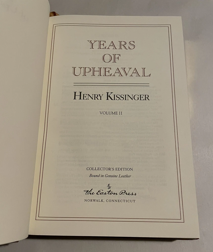 Henry Kissinger: YEARS OF UPHEAVAL (Two-Volume Set) Easton Press Leatherbound Collector's Editions All Easton Press books are made in America by skilled craftspeople. Known for their incredible beauty and durability, these books are bound in premium, hand-selected leather and have decorative accents stamped of 22kt. gold. Archival-quality paper is used, which protects the pages from humidity and dryness. Easton Press books also feature hubbed spines and satin ribbon page markers. Set is in very good condition ( slight edgewear, some wear to gilt on page edges--see photos, no writing inside, previous owner’s gold seal in Volume 1; previous owner’s embossed seal in Volume 2).