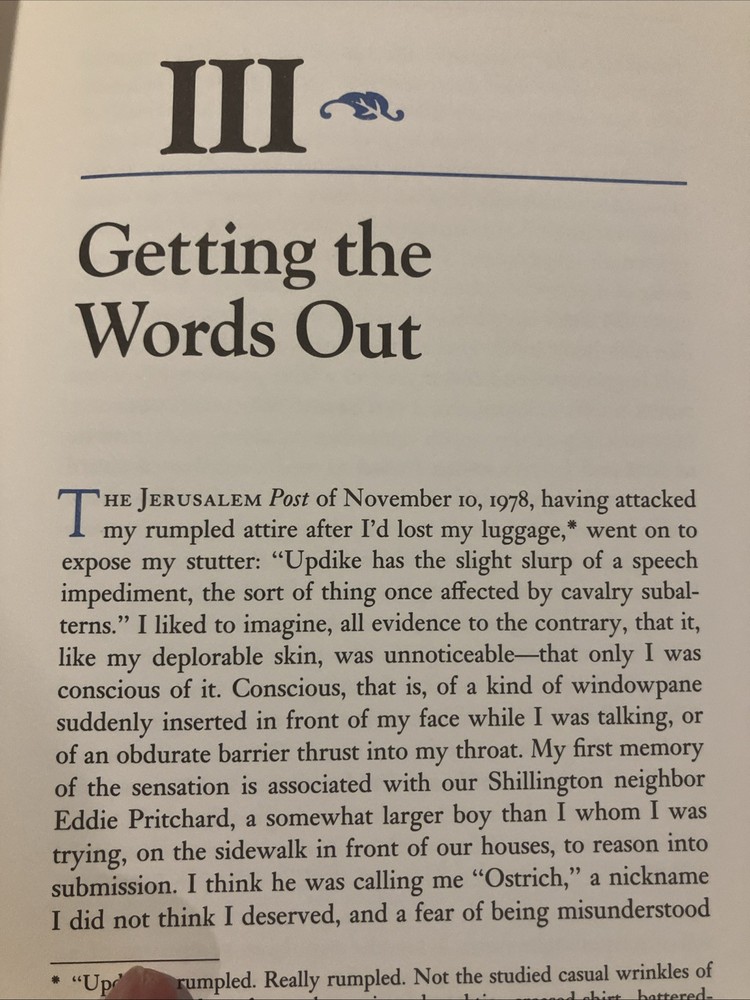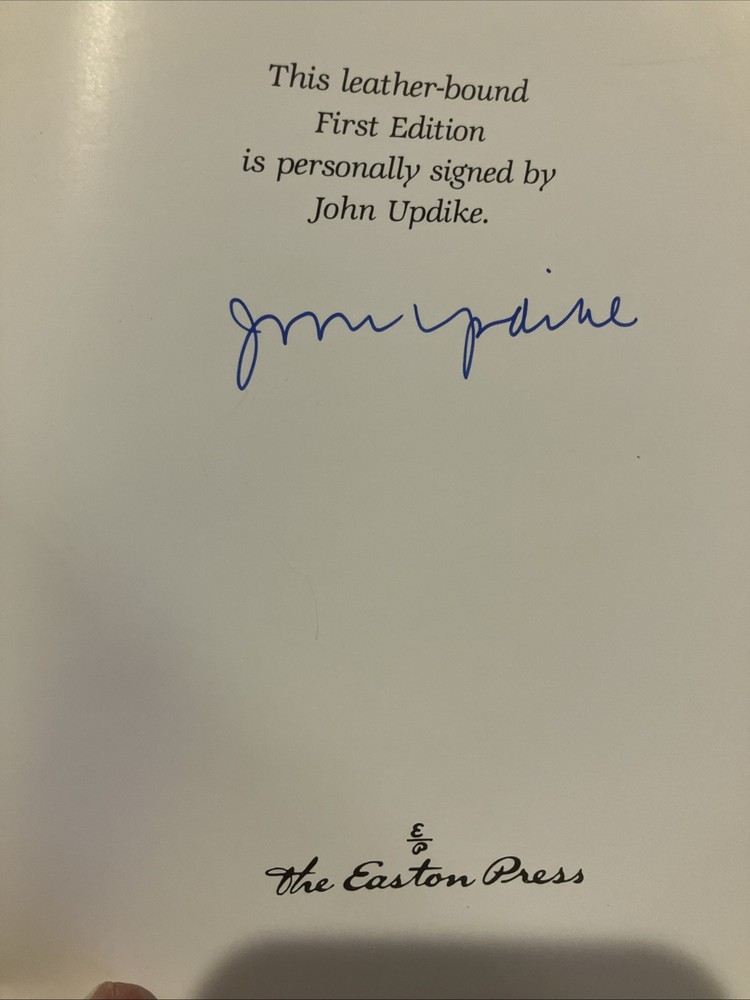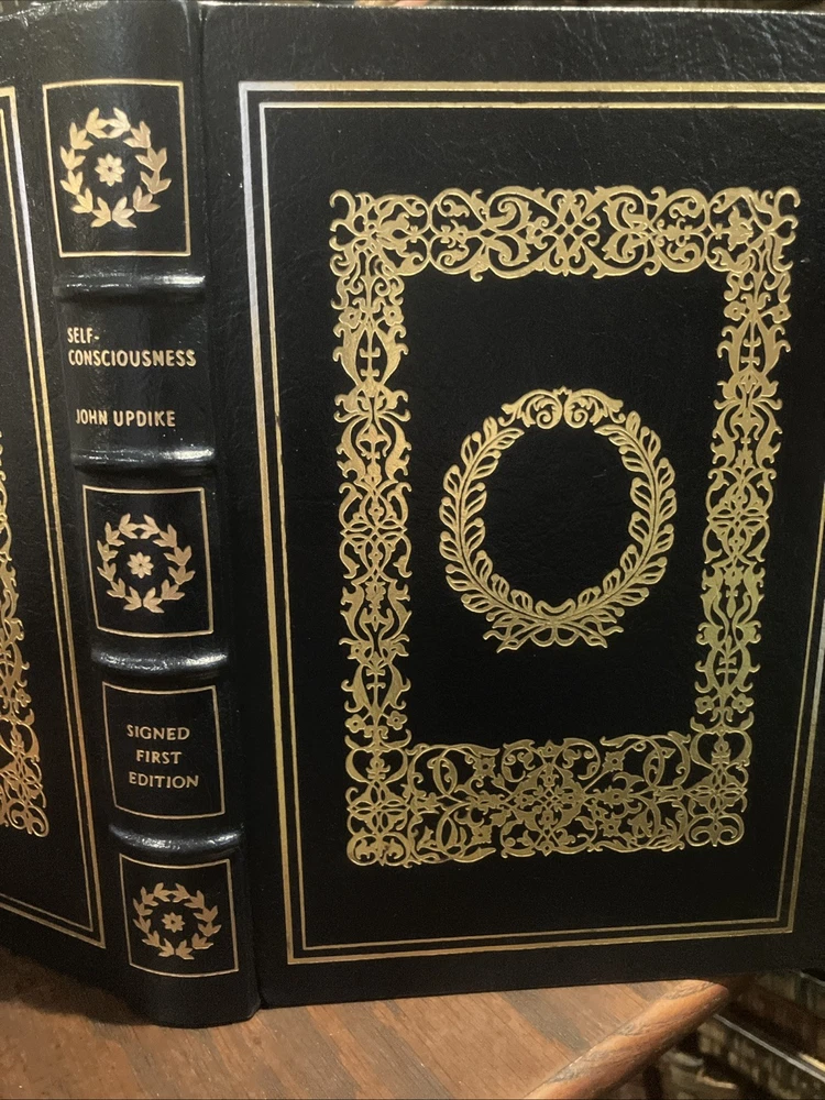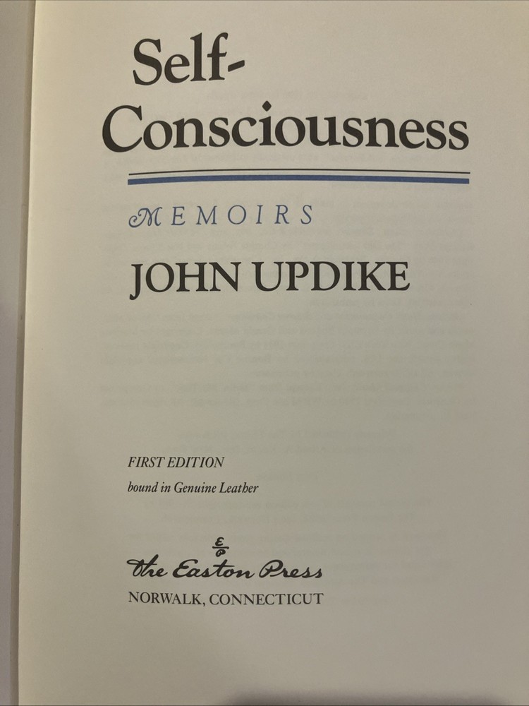 Easton Press leather edition of John Updike's "Self-Consciousness," a COLLECTOR'S edition, a First Edition, Personally signed by JOHN UPDIKE, published in 1989. Bound in hunter green leather, the book has camel tan French moire silk end leaves, a satin book marker, symth-sewn binding, hubbed spine, gold gilding on three edges---in near FINE condition. John Hoyer Updike, who lived from 1932--2009, was an American novelist and short story writer. Updike's Memoirs consist of six Emersonian essays that trace the inner shape of his life from his childhood in Shillington, Pennsylvania up to the age of fifty-five. Updike says in the foreword that he is grateful to numerous Shillingtonians for corrections and additions of detail and his mother and cousin for facts about the Harley Updike family. Updike has been hair-raisingly honest, matchlessly precise, and self-effacingly humorous, taking the reader beyond self-consciousness, and beyond self-importance. Updike says his "veins have been tapped---the lode mined---in over thirty years' worth of prose and poetry. . .a life view by the living can only be provisional." Chapter two is titled: "At War with My Skin," in which Updike says he has been battling psoriasis after an attack of measles in 1938, recalling a few occasions when he was challenged in the brute world of childhood, about his skin. In Chapter 5, "A Letter to My Grandsons," Updike reminds them that "we are all of mixed blood. . .your father is black, the pure black of West Africa and your mother is English---with a dash of Russian, French, German and Dutch. I am a half, a Pennsylvania Dutchman." In the last chapter, Updike says he has been happy for thirty years in New England, from his HARVARD days as an English major to the present. "If I am nice and good, you'll leave me alone to read my comic books, as I love Mickey Mouse, Captain Marvel, and Plastic Man." 257 pages. I offer combined shipping.