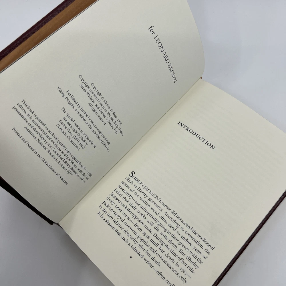 >>> GET IT NOW & ADD IT TO YOUR LIBRARY TODAY! <<< Leather-bound Easton Press collector's edition of The Haunting of the Hill House by Shirley Jackson - ONE VOLUME ONLY (Horror Classics) Condition – Very Good/Excellent; blank bookplate attached to front moire endsheet; no embossed seal/no signatures or markings ; slight shelf wear/marks/scratches/rubbing to page gilt; slight shelf wear/marks/scratches/rubbing/bumps to leather covers; may have some dust from storage; please see all photos for details - photos are part of description; from an adult only smoke & pet free household; owl not included Shipping – boxed USPS Media Mail or Priority Mail (selectable at checkout); no international shipping (please do not ask) Payment – within two days from the listing's end (Best Offer acceptance) unless prior arrangements have been made No Returns/Sold 'As Is' – please contact me if you have any additional questions/issues or with requests for additional pictures >>> GET IT NOW & ADD IT TO YOUR LIBRARY TODAY! <<< *The only true First Editions (1 st Editions) from Easton Press you can be 100% certain about are books with “Signed First Edition " gilt-stamped on the leather spine or “Signed First Edition " printed on the title page and/or on the signature page. It is impossible to tell if any other Easton Press book is a first edition or first printing. Please keep that in mind and if not sure ask sellers for photos proving their claim. **Easton Press does not provide the actual print date in their books. For "Year Printed" the copyright date is listed (oftentimes from the original Heritage Press editions, rights to which were sold to Easton Press), which may or may not indicate an accurate range for manufacture of the book. ***Please note that Easton Press’s term Collector’s Edition is not synonymous with Limited Edition (LE). The only true Limited Editions from Easton Press are copies hand-numbered on the limitation page (i.e. ‘Number 1 of 1200’ or ‘This edition is strictly limited to a quantity of 1200 copies of which this is number 1’). Please keep that in mind and if not sure ask sellers to prove their claim.