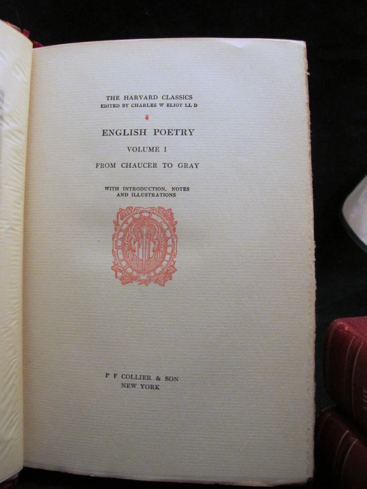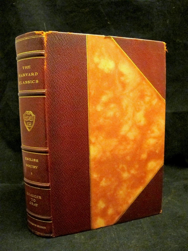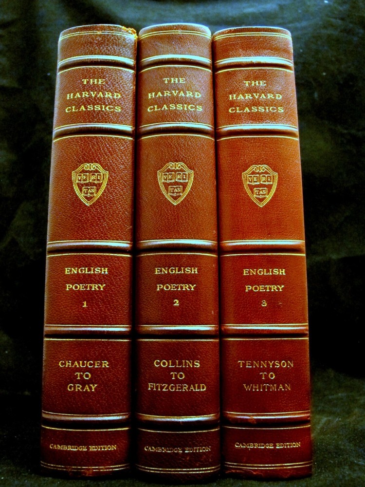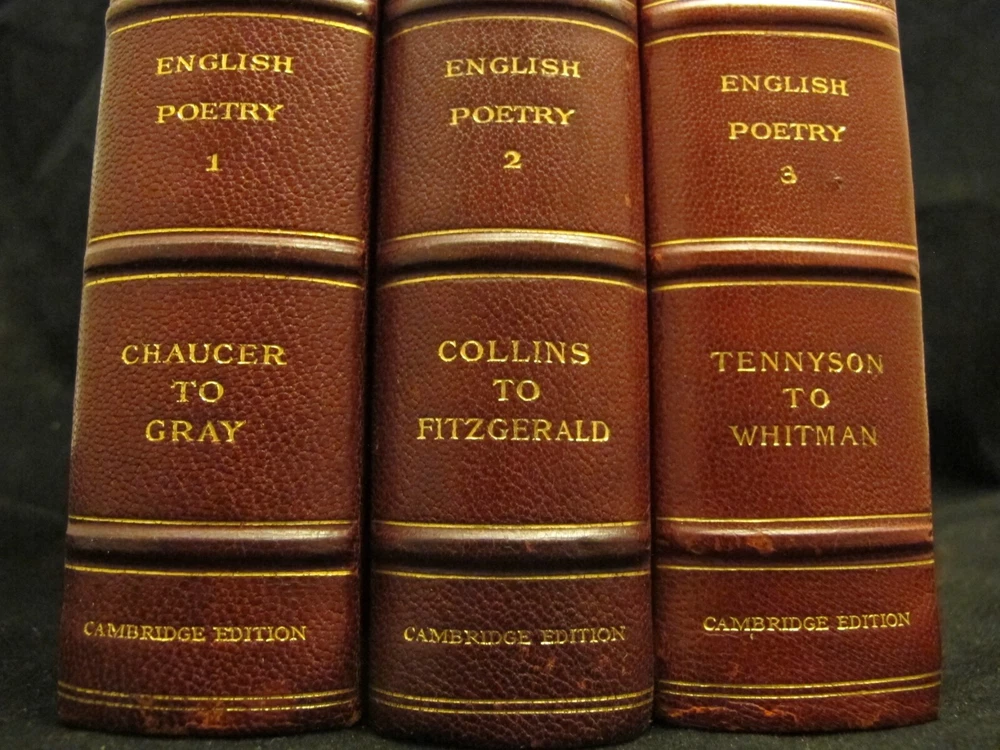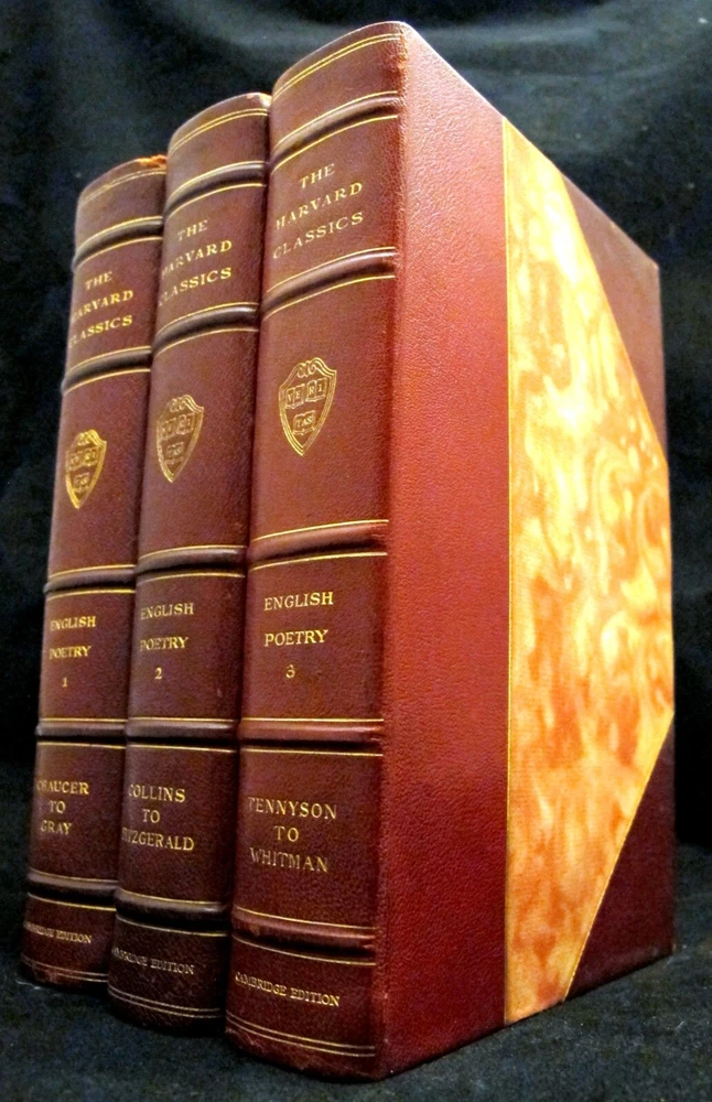 Red, three-quarter, leather bound, hardcovers. Decorated with gilt titles and the Harvard university seal on the spines, gilt page top edge and sewn-in silk bookmarks. Pages watermarked 'Eliot'. End papers are Moire fabric. Illustrated with full page engraved plates with tissue guards. Set is complete in itself, from a larger work, The Harvard Classics. Volume titles: 1. Chaucer to Gray 2. Collins to Fitzgerald 3. Tennyson to Whitman Cambridge edition, in deluxe, polished calf, bindings. Very good condition; rubbing on top edges and some corners, and a few small rubbed areas on the spines. Covers all firmly attached; bindings tight and square, pages clean and bright white. Interiors appear unread, with some pages still uncut. These books are the original deluxe editions that Easton Pressed used to print their modern set--don't waste your time with the new books when you can have the originals! 9.75" x 7.75" ea.