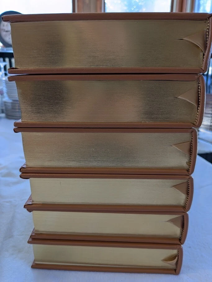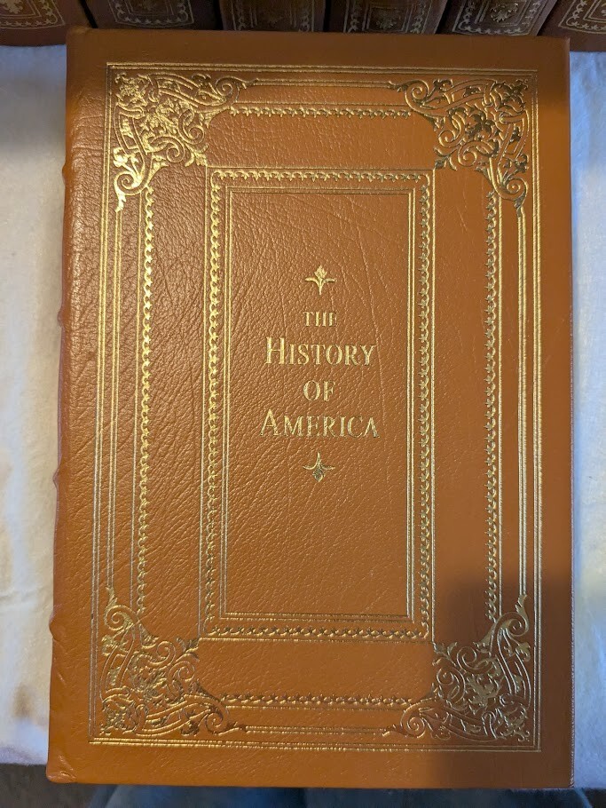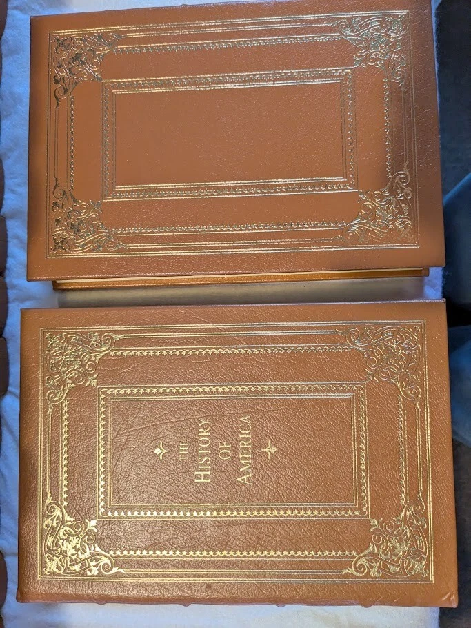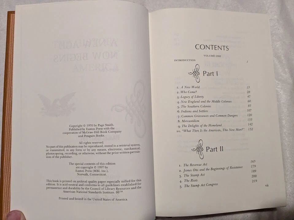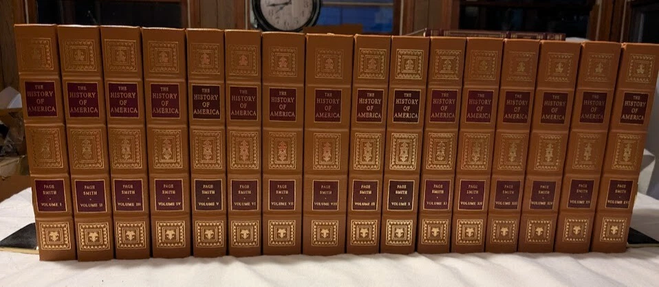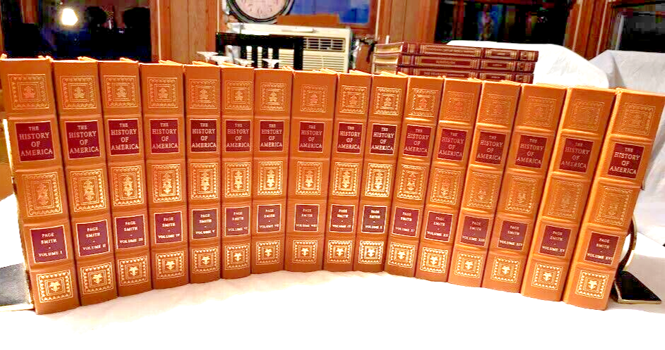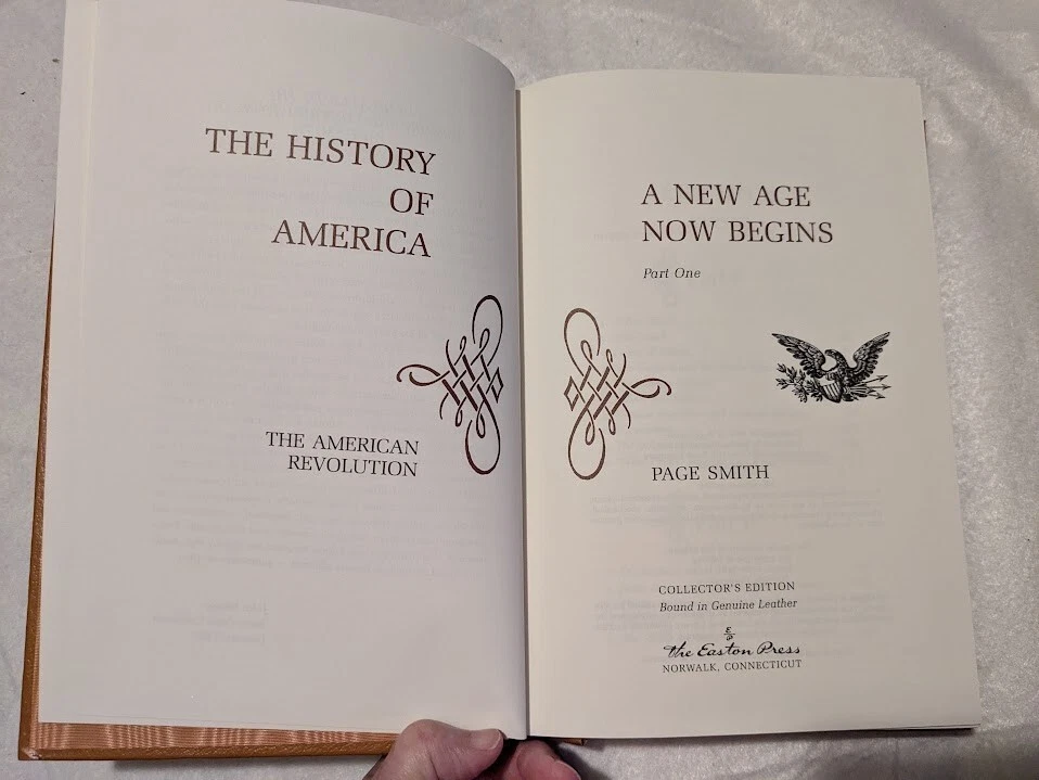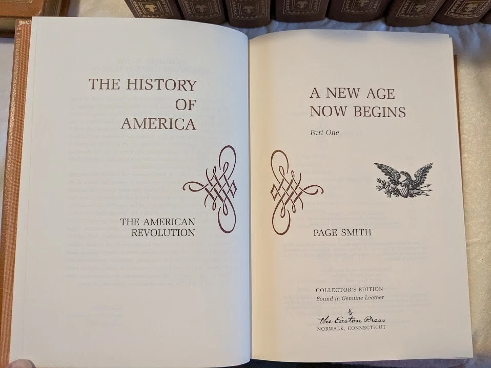 Enter the pages of the 'History of America' by Page Smith, a comprehensive narrative that captures the rich essence of the United States. This 16 volume Collector's Edition by Easton Press is a treasure for history enthusiasts, presenting an elegant leather binding that reveals a sense of classic sophistication.The collection is in English, providing accessibility to a wide audience interested in our nation's past. Published by Easton Press, it stands as a testament to the rich tapestry of American heritage, making it a distinguished addition to any library with an appetite for historical insight. Purchased new. Never used, but has some gilded page color spot variance as illustrated on several volumes. Volume II also includes book edge flaw as noted in attached photo. All 16 volumes include a new unattached bookplate. All Books Feature: * Premium Leather * Silk Moire Endleaves * Distinctive Cover Design * Hubbed Spine, Accented in Real 22KT Gold * Satin Ribbon Page Marker * Gilded Page Edges * Long-lasting, High Quality Acid-neutral Paper * Smyth-sewn Pages for Strength and Durability LIST OF TITLES: Covering more than 300 years of history from the Pilgrims' landing to the New Deal, Page Smith's monumental 8,000-page epic is the most comprehensive history of the United States ever written, complete in 16 leather-bound volumes: Vol. I - IV: A NEW AGE NOW BEGINS : The American Revolution (1832 pages). Vol. V - VI: THE SHAPING OF AMERICA : The Young Republic (868 pages). Vol. VII-VIII: THE NATION COMES OF AGE : The Ante-Bellum Years (1231 pages). Vol. IX - X: TRIAL BY FIRE : The Civil War and Reconstruction (1038 pages). Vol. XI - XII: THE RISE OF INDUSTRIAL AMERICA : The Post-Reconstruction Era (965 pages). Vol. XIII-XIV: AMERICA ENTERS THE WORLD : The Progressive Era and World War I (1089 pages). Vol. XV - XVI: REDEEMING THE TIME : The 1920's and The New Deal (1205 pages).