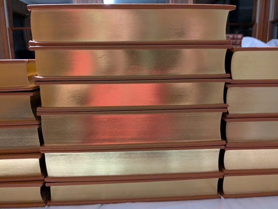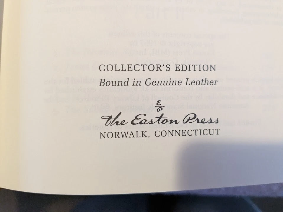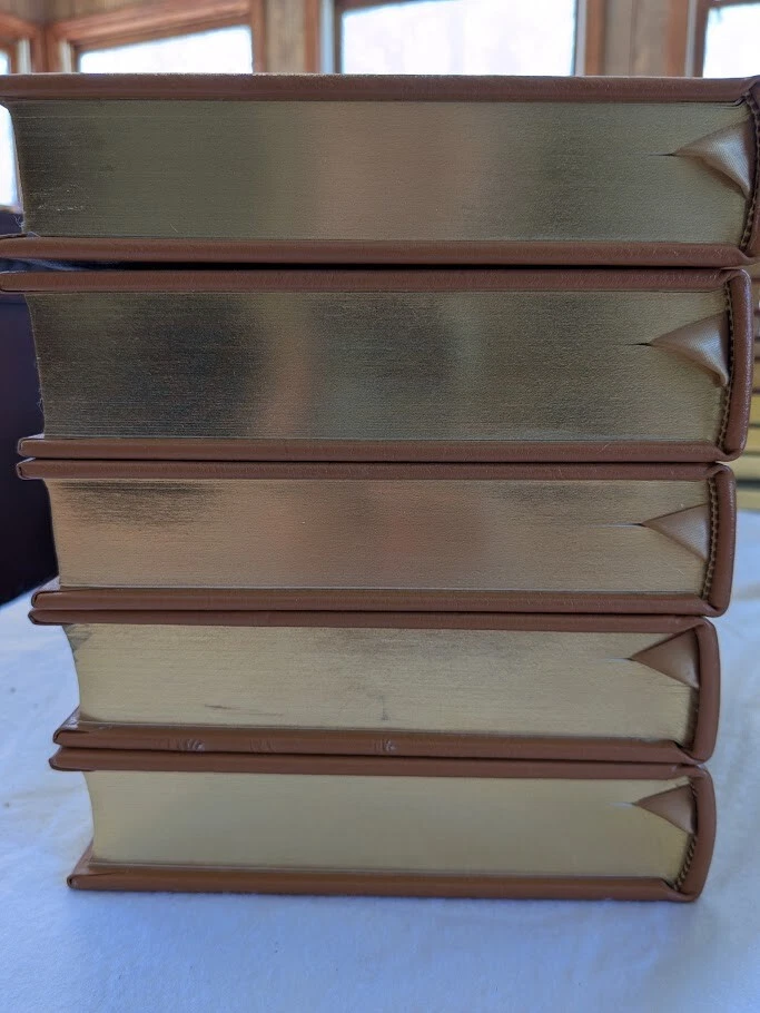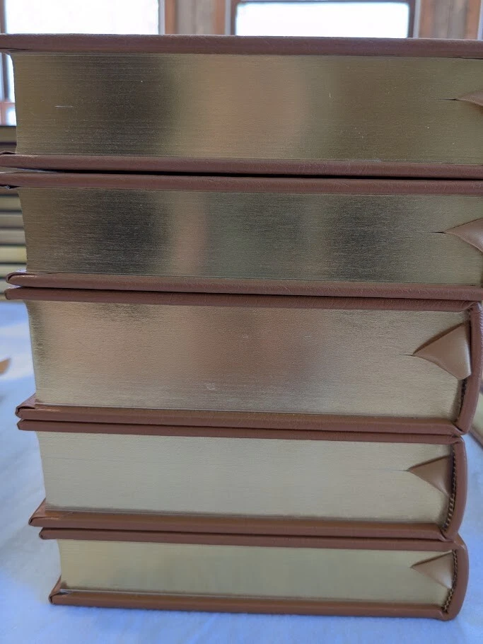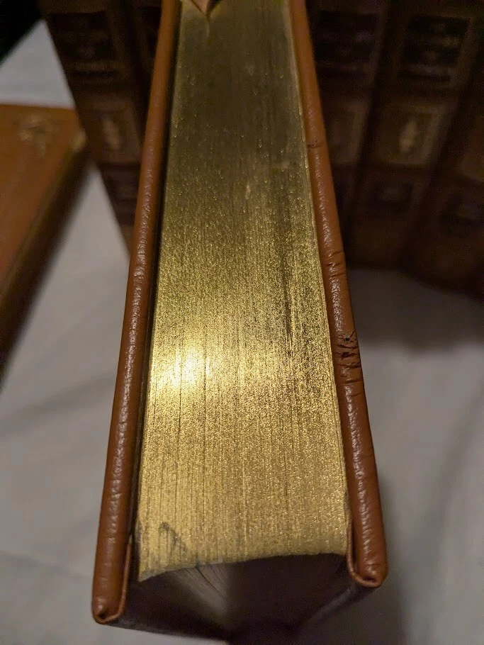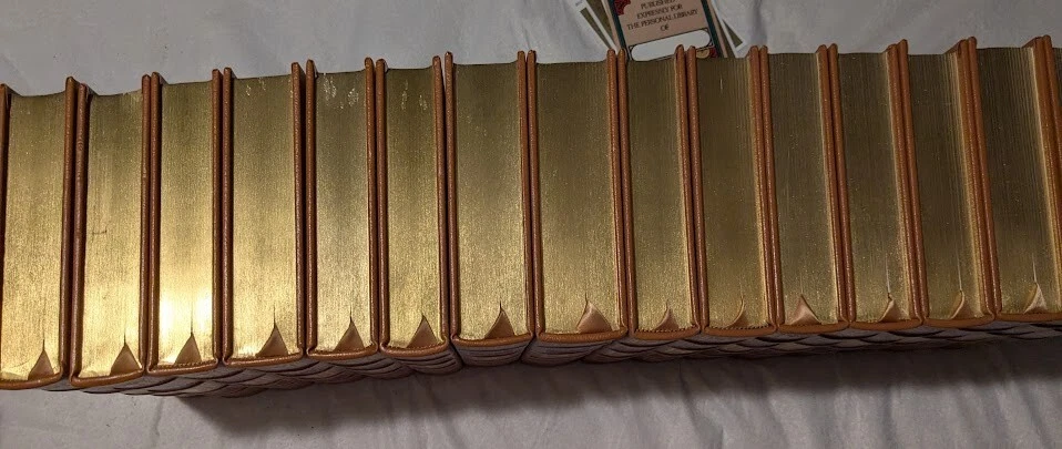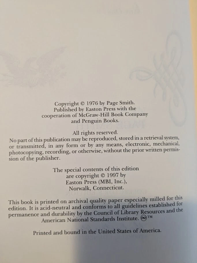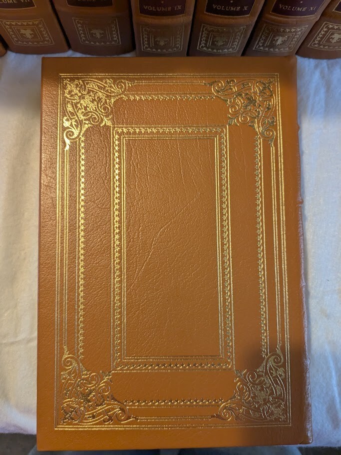 Enter the pages of the 'History of America' by Page Smith, a comprehensive narrative that captures the rich essence of the United States. This 16 volume Collector's Edition by Easton Press is a treasure for history enthusiasts, presenting an elegant leather binding that reveals a sense of classic sophistication.The collection is in English, providing accessibility to a wide audience interested in our nation's past. Published by Easton Press, it stands as a testament to the rich tapestry of American heritage, making it a distinguished addition to any library with an appetite for historical insight. Purchased new. Never used, but has some gilded page color spot variance as illustrated on several volumes. Volume II also includes book edge flaw as noted in attached photo. All 16 volumes include a new unattached bookplate. All Books Feature: * Premium Leather * Silk Moire Endleaves * Distinctive Cover Design * Hubbed Spine, Accented in Real 22KT Gold * Satin Ribbon Page Marker * Gilded Page Edges * Long-lasting, High Quality Acid-neutral Paper * Smyth-sewn Pages for Strength and Durability LIST OF TITLES: Covering more than 300 years of history from the Pilgrims' landing to the New Deal, Page Smith's monumental 8,000-page epic is the most comprehensive history of the United States ever written, complete in 16 leather-bound volumes: Vol. I - IV: A NEW AGE NOW BEGINS : The American Revolution (1832 pages). Vol. V - VI: THE SHAPING OF AMERICA : The Young Republic (868 pages). Vol. VII-VIII: THE NATION COMES OF AGE : The Ante-Bellum Years (1231 pages). Vol. IX - X: TRIAL BY FIRE : The Civil War and Reconstruction (1038 pages). Vol. XI - XII: THE RISE OF INDUSTRIAL AMERICA : The Post-Reconstruction Era (965 pages). Vol. XIII-XIV: AMERICA ENTERS THE WORLD : The Progressive Era and World War I (1089 pages). Vol. XV - XVI: REDEEMING THE TIME : The 1920's and The New Deal (1205 pages).