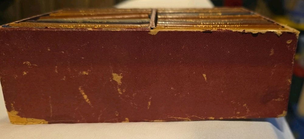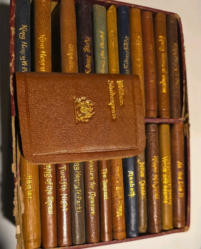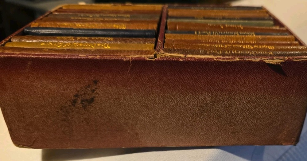 This product is a 24 volume mini leather book set of William Shakespeare's works from the early 1900s, published by Knickerbocker Leather & Novelty Co. The books are bound in leather and come in their original box, making them a valuable collector's edition. Each volume is illustrated and written in English, showcasing the works of the renowned author in a compact and beautifully crafted set. Perfect for literature and fiction enthusiasts, this set is a special addition to any book lover's collection.