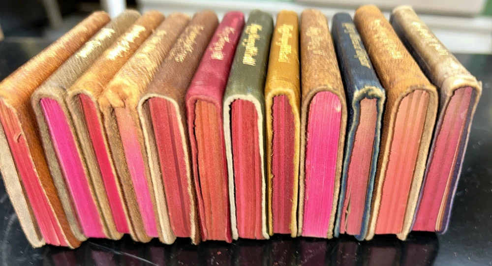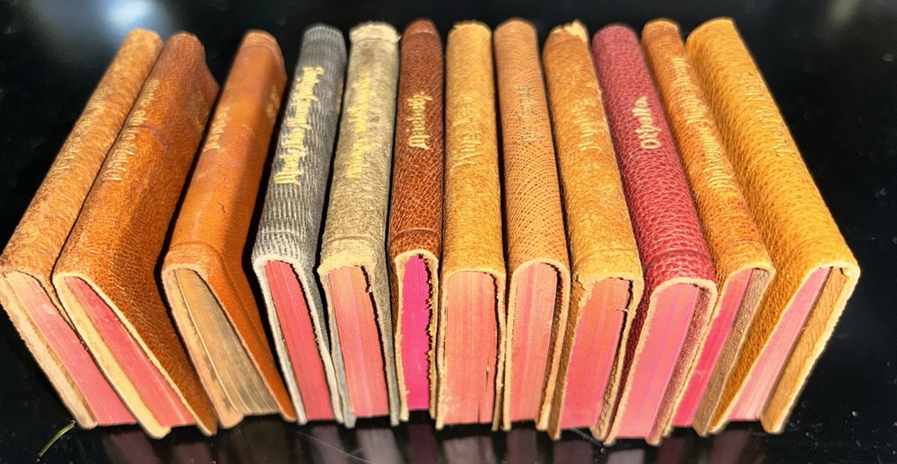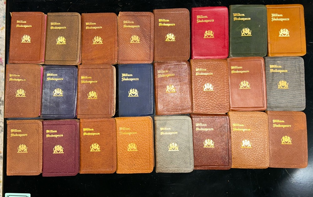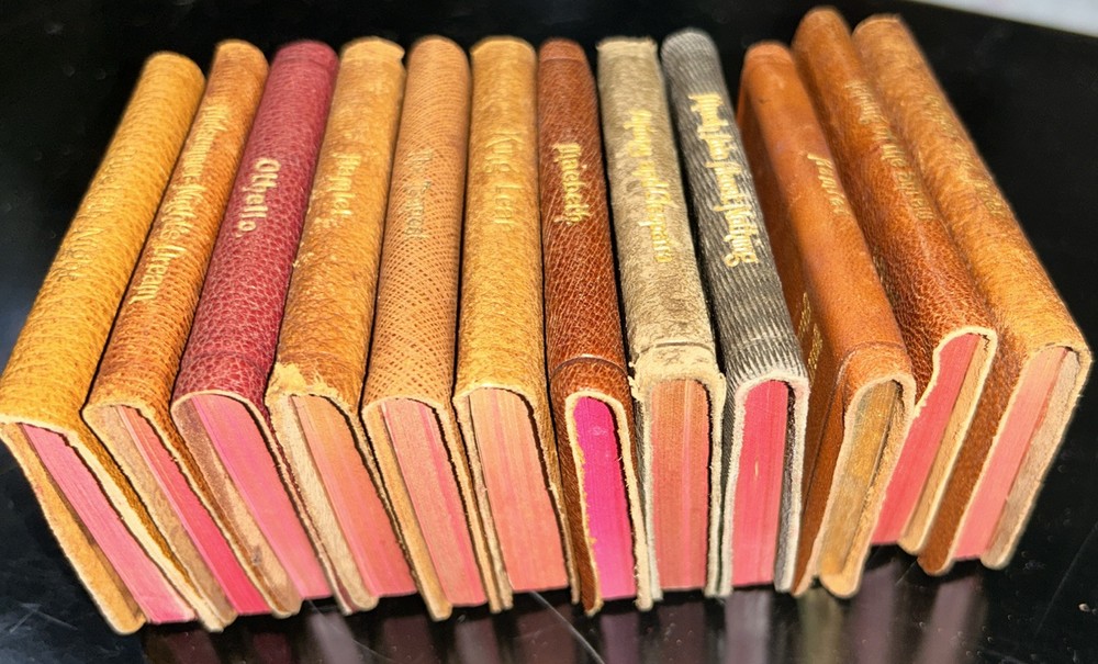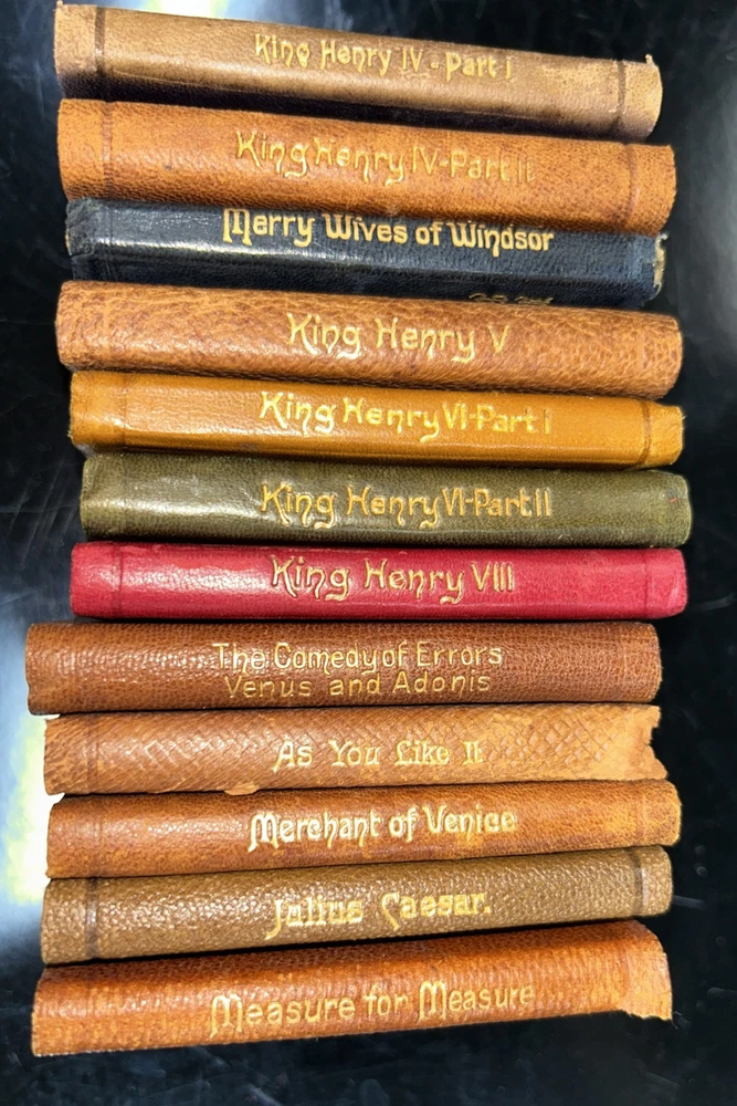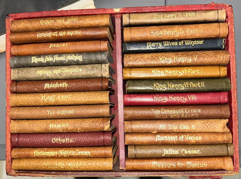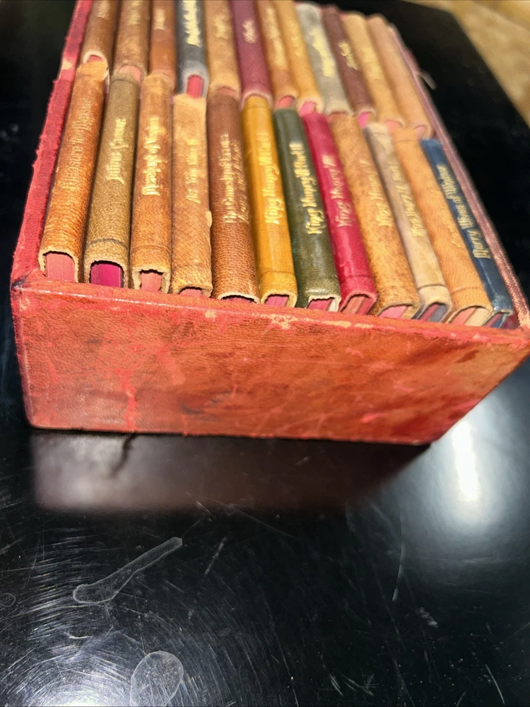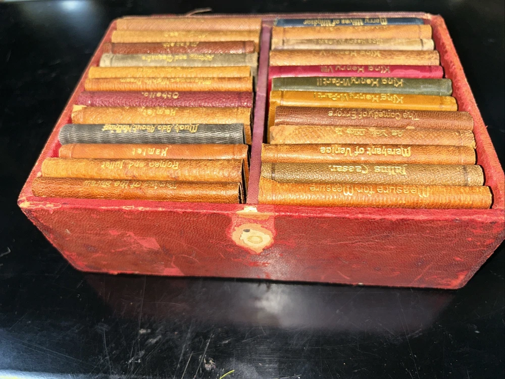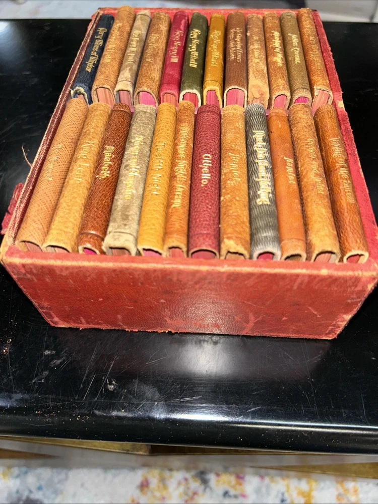 This rare and valuable set of 24 volumes of William Shakespeare's works is a true collector's item. The miniature leather books come in their original box and are beautifully illustrated. They were published in N.Y. by Knickerbocker Leather & Novelty Co. in the early 1900's and are in excellent condition. Each book contains the complete works of Shakespeare, making it a perfect addition to any literature and fiction collection. The set is also a great gift for fans of the renowned playwright and those who appreciate rare and unique books. Don't miss out on the opportunity to own this special edition set. SEE MY OTHER ITEMS