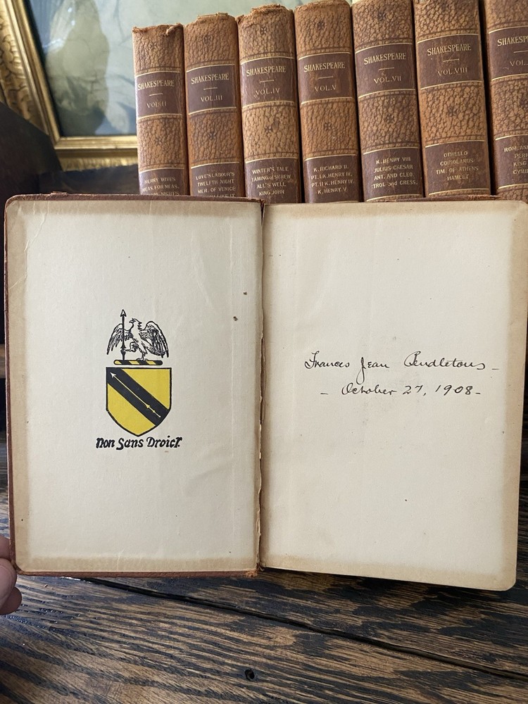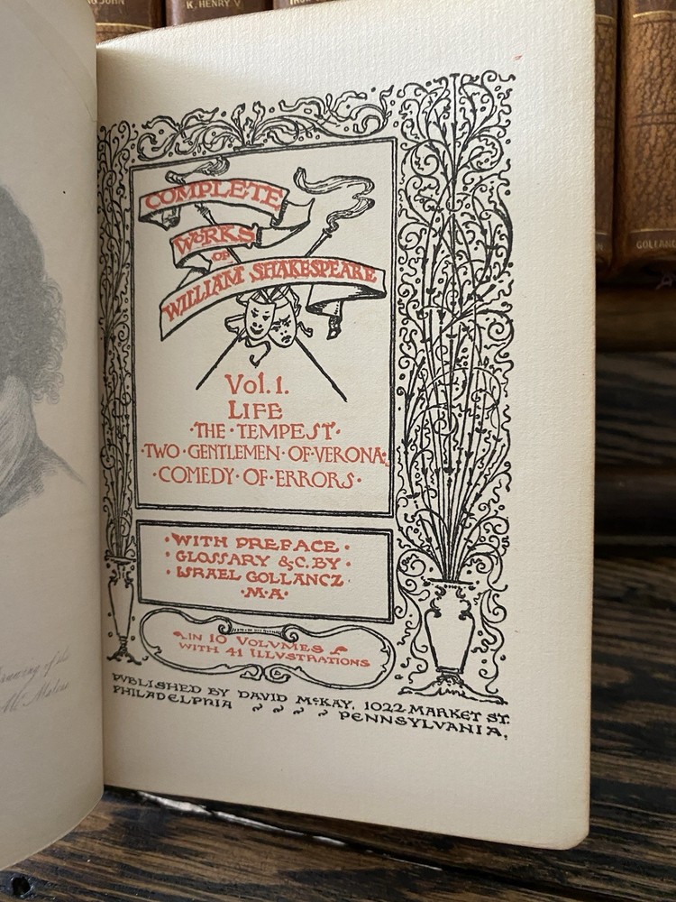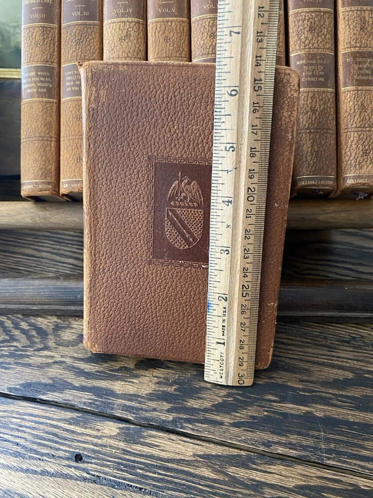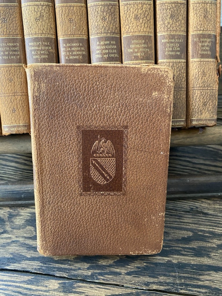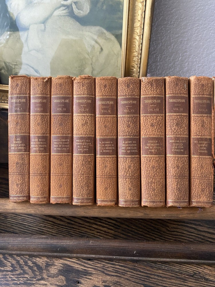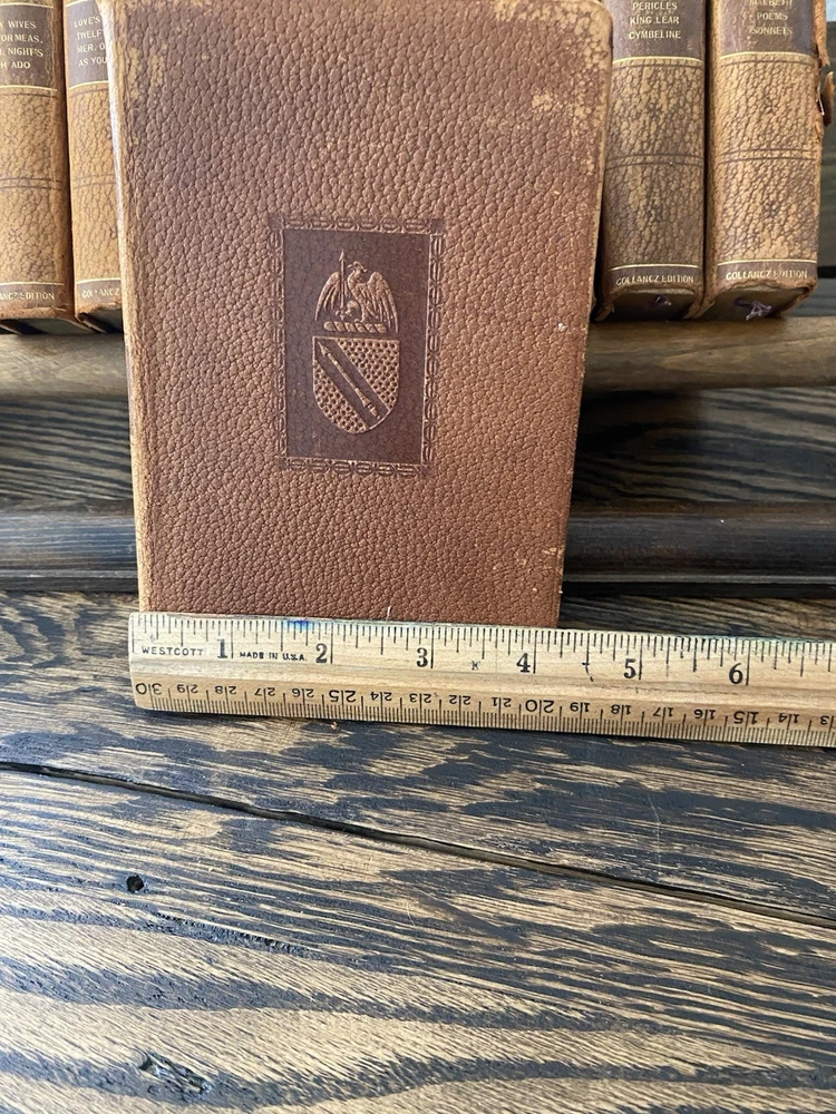 Early 1900's leatherbound "Complete Works of William Shakespeare" Gollancz Edition 9 volume set. Published by David McKay, unknown the exact year of publishing, but this set of has handwritten inscription dated October 27, 1908. This set is missing volume 6. All offers considered. Ships same or next business day.