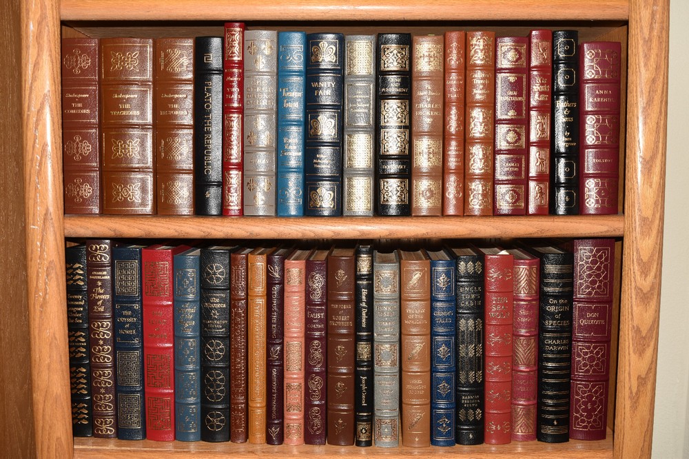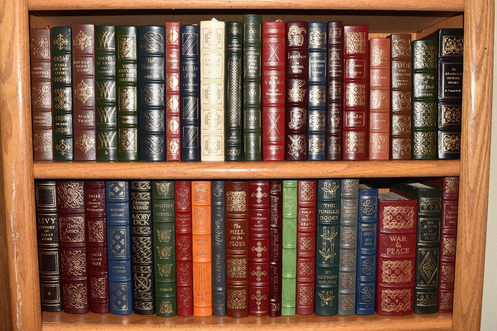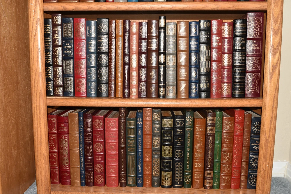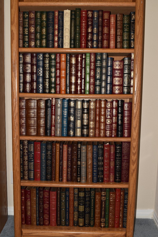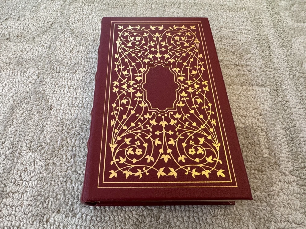 From the Easton Press Collection... The 100 Greatest Books Ever Written Complete 100 Volume Set by Famous Authors Copyright 1980s by The Easton Press Bound in Premium Full Leather This set contains all of the classic Easton Press trimmings: Premium Leather Silk Moire Endleaves Distinctive Cover Design Hubbed Spine, Accented in Real 22KT Gold Satin Ribbon Page Marker Gilded Page Edges Long-lasting, High Quality Acid-neutral Paper Smyth-sewn Pages for Strength and Durability Beautiful Illustrations This set is in Fine condition. The front and back covers of each book are both in terrific condition and the gilded page edges show only minor wear (see pictures). There are no markings or bookplates in any of the books. The set retails for over $9,000 and would take 8+ years to collect. Now is your chance to buy this complete original set at a substantial discount! Books included are: Year Title Author(s) Condition 1978 A Journal of the Plague Year Daniel Defoe Fine 1977 A Portrait of the Artist as a Young Man James Joyce Fine - faint edge wear 1981 A Tale of Two Cities Charles Dickens Fine 1979 Aesop's Fables Aesop Fine 1977 Alice in Wonderland Lewis Carroll Fine 1975 Anna Karenina Leo Tolstoy Fine - faint edge wear 1978 Brave New World Aldous Huxley Fine 1977 Candide Voltaire Fine 1980 Crime and Punishment Fyodor Dostoevsky Fine - faint edge wear 1979 David Copperfield Charles Dickens Near Fine - light edge wear 1979 Dialogues of Love and Friendship Plato Fine 1976 Don Quixote Miguel de Cervantes Fine 1977 Fathers and Sons Ivan Turgenev Fine 1980 Faust Johann Wolfgang von Goethe Fine 1979 Great Expectations Charles Dickens Fine 1980 Grimm's Fairy Tales Jacob and Wilhelm Grimm, the Brothers Grimm Fine - faint edge wear 1976 Gulliver's Travels Jonathan Swift Fine 1980 Heart of Darkness Joseph Conrad Near Fine - light edge wear 1977 Ivanhoe Walter Scott Fine - faint edge wear 1976 Jane Eyre Charlotte Brontë Fine 1977 Jude the Obscure Thomas Hardy Fine 1989 Leaves of Grass Walt Whitman Fine 1976 Little Women Louisa May Alcott Fine 1977 Lord Jim Joseph Conrad Near Fine - light edge wear 1978 Madame Bovary Gustave Flaubert Near Fine - light edge wear 1980 Medea/Hippolytus/The Bacchae Euripides Near Fine - light edge wear 1975 Moby-Dick or, The Whale Herman Melville Fine 1980 Oedipus the King Sophocles Fine 1977 Of Mice and Men John Steinbeck Fine 1976 On the Origin of Species Charles Darwin Fine 1976 Paradise Lost John Milton Fine 1976 Poems of Yeats William Butler Yeats Fine 1979 Politics & Poetics Aristotle Fine 1979 Rights of Man Thomas Paine Fine - faint edge wear 1976 Robinson Crusoe Daniel Defoe Fine 1976 Rubaiyat of Omar Khayyam Omar Khayyam Fine 1978 She Stoops to Conquer Oliver Goldsmith Fine 1981 Tales from the Arabian Nights Richard Burton Fine - faint edge wear 1975 Tales of Mystery and Imagination Edgar Allan Poe Fine 1981 The Adventures of Huckleberry Finn Mark Twain Fine 1980 The Adventures of Sherlock Holmes Arthur Conan Doyle Near Fine - light edge wear 1979 The Aeneid Virgil Fine 1980 The Alhambra Washington Irving Fine 1976 The Analects of Confucius Confucius Fine 1976 The Autobiography of Benjamin Franklin Benjamin Franklin Fine 1979 The Birds and The Frogs Aristophanes Fine 1979 The Brothers Karamazov Fyodor Dostoevsky Fine 1978 The Canterbury Tales Geoffrey Chaucer Fine 1980 The Comedies William Shakespeare Near Fine - light edge wear 1980 The Confessions of Jean-Jacques Rousseau Jean-Jacques Rousseau Fine 1979 The Confessions of St. Augustine Saint Augustine of Hippo Fine 1980 The Decameron Giovanni Boccaccio Fine 1977 The Descent of Man Charles Darwin Fine 1978 The Divine Comedy Dante Alighieri Fine 1979 The Essays or Counsels Civil & Moral Sir Francis Bacon Fine 1979 The Essays of Ralph Waldo Emerson Ralph Waldo Emerson Fine 1979 The Federalist Papers Alexander Hamilton, James Madison, John Jay Fine 1977 The Flowers Of Evil Charles Baudelaire Fine 1980 The Histories William Shakespeare Fine 1978 The History of Early Rome Livy Fine 1979 The Iliad Homer Fine 1980 The Jungle Book and The Second Jungle Book Rudyard Kipling Fine 1979 The Last of the Mohicans James Fenimore Cooper Fine 1980 The Mill on the Floss George Eliot Fine - faint edge wear 1978 The Odyssey Homer Fine 1979 The Oresteia Aeschylus Near Fine - light edge wear 1979 The Pilgrim's Progress John Bunyan Fine - faint edge wear 1979 The Poems of John Donne John Donne Fine 1980 The Poems of John Keats John Keats Fine 1979 The Poems of Robert Browning Robert Browning Fine 1975 The Poems of Robert Frost Robert Frost Fine 1978 The Portrait of a Lady Henry James Fine - faint edge wear 1980 The Prince Niccolo Machiavelli Fine 1980 The Red and the Black Stendhal Fine 1980 The Red Badge of Courage Stephen Crane Near Fine - light edge wear 1980 The Republic Plato Fine 1978 The Return of the Native Thomas Harding Fine 1975 The Scarlet Letter Nathaniel Hawthorne Fine 1979 The Sea Wolf Jack London Fine - faint edge wear 1971 The Short Stories of Charles Dickens Charles Dickens Fine - faint edge wear 1976 The Short Stories of Oscar Wilde Oscar Wilde Near Fine - light edge wear 1980 The Strange Case of Dr. Jekyl & Mr. Hyde Robert Louis Stevenson Fine 1977 The Tales of Guy de Maupassant Guy de Maupassant Fine - faint edge wear 1976 The Talisman Walter Scott Fine 1978 The Three Musketeers Alexandre Dumas, père Fine 1980 The Tragedies William Shakespeare Near Fine - light edge wear 1980 The Way of All Flesh Samuel Butler Fine 1979 Three Plays of Henrik Ibsen Henrik Ibsen Fine 1979 Tom Jones Henry Fielding Fine 1977 Treasure Island Robert Louis Stevenson Fine 1980 Tristram Shandy Laurence Sterne Fine 1977 Twenty Thousand Leagues Under the Sea Jules Verne Fine 1978 Two Plays of Anton Chekhov Anton Chekhov Fine - faint edge wear 1977 Two Plays of Moliere Moliere Fine 1979 Two Plays for Puritans George Bernard Shaw Fine 1979 Uncle Tom's Cabin Harriet Beecher Stowe Fine - faint edge wear 1979 Vanity Fair William Makepeace Thackeray Fin