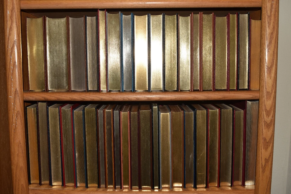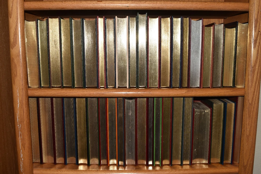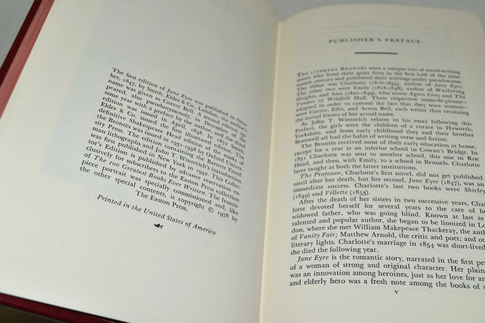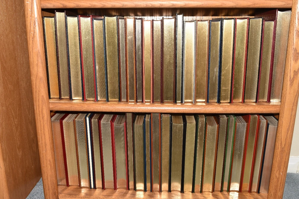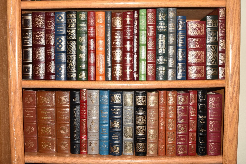 From the Easton Press Collection... The 100 Greatest Books Ever Written Complete 100 Volume Set by Famous Authors Copyright 1980s by The Easton Press Bound in Premium Full Leather This set contains all of the classic Easton Press trimmings: Premium Leather Silk Moire Endleaves Distinctive Cover Design Hubbed Spine, Accented in Real 22KT Gold Satin Ribbon Page Marker Gilded Page Edges Long-lasting, High Quality Acid-neutral Paper Smyth-sewn Pages for Strength and Durability Beautiful Illustrations This set is in Fine condition. The front and back covers of each book are both in terrific condition and the gilded page edges show only minor wear (see pictures). There are no markings or bookplates in any of the books. The set retails for over $9,000 and would take 8+ years to collect. Now is your chance to buy this complete original set at a substantial discount! Books included are: Year Title Author(s) Condition 1978 A Journal of the Plague Year Daniel Defoe Fine 1977 A Portrait of the Artist as a Young Man James Joyce Fine - faint edge wear 1981 A Tale of Two Cities Charles Dickens Fine 1979 Aesop's Fables Aesop Fine 1977 Alice in Wonderland Lewis Carroll Fine 1975 Anna Karenina Leo Tolstoy Fine - faint edge wear 1978 Brave New World Aldous Huxley Fine 1977 Candide Voltaire Fine 1980 Crime and Punishment Fyodor Dostoevsky Fine - faint edge wear 1979 David Copperfield Charles Dickens Near Fine - light edge wear 1979 Dialogues of Love and Friendship Plato Fine 1976 Don Quixote Miguel de Cervantes Fine 1977 Fathers and Sons Ivan Turgenev Fine 1980 Faust Johann Wolfgang von Goethe Fine 1979 Great Expectations Charles Dickens Fine 1980 Grimm's Fairy Tales Jacob and Wilhelm Grimm, the Brothers Grimm Fine - faint edge wear 1976 Gulliver's Travels Jonathan Swift Fine 1980 Heart of Darkness Joseph Conrad Near Fine - light edge wear 1977 Ivanhoe Walter Scott Fine - faint edge wear 1976 Jane Eyre Charlotte Brontë Fine 1977 Jude the Obscure Thomas Hardy Fine 1989 Leaves of Grass Walt Whitman Fine 1976 Little Women Louisa May Alcott Fine 1977 Lord Jim Joseph Conrad Near Fine - light edge wear 1978 Madame Bovary Gustave Flaubert Near Fine - light edge wear 1980 Medea/Hippolytus/The Bacchae Euripides Near Fine - light edge wear 1975 Moby-Dick or, The Whale Herman Melville Fine 1980 Oedipus the King Sophocles Fine 1977 Of Mice and Men John Steinbeck Fine 1976 On the Origin of Species Charles Darwin Fine 1976 Paradise Lost John Milton Fine 1976 Poems of Yeats William Butler Yeats Fine 1979 Politics & Poetics Aristotle Fine 1979 Rights of Man Thomas Paine Fine - faint edge wear 1976 Robinson Crusoe Daniel Defoe Fine 1976 Rubaiyat of Omar Khayyam Omar Khayyam Fine 1978 She Stoops to Conquer Oliver Goldsmith Fine 1981 Tales from the Arabian Nights Richard Burton Fine - faint edge wear 1975 Tales of Mystery and Imagination Edgar Allan Poe Fine 1981 The Adventures of Huckleberry Finn Mark Twain Fine 1980 The Adventures of Sherlock Holmes Arthur Conan Doyle Near Fine - light edge wear 1979 The Aeneid Virgil Fine 1980 The Alhambra Washington Irving Fine 1976 The Analects of Confucius Confucius Fine 1976 The Autobiography of Benjamin Franklin Benjamin Franklin Fine 1979 The Birds and The Frogs Aristophanes Fine 1979 The Brothers Karamazov Fyodor Dostoevsky Fine 1978 The Canterbury Tales Geoffrey Chaucer Fine 1980 The Comedies William Shakespeare Near Fine - light edge wear 1980 The Confessions of Jean-Jacques Rousseau Jean-Jacques Rousseau Fine 1979 The Confessions of St. Augustine Saint Augustine of Hippo Fine 1980 The Decameron Giovanni Boccaccio Fine 1977 The Descent of Man Charles Darwin Fine 1978 The Divine Comedy Dante Alighieri Fine 1979 The Essays or Counsels Civil & Moral Sir Francis Bacon Fine 1979 The Essays of Ralph Waldo Emerson Ralph Waldo Emerson Fine 1979 The Federalist Papers Alexander Hamilton, James Madison, John Jay Fine 1977 The Flowers Of Evil Charles Baudelaire Fine 1980 The Histories William Shakespeare Fine 1978 The History of Early Rome Livy Fine 1979 The Iliad Homer Fine 1980 The Jungle Book and The Second Jungle Book Rudyard Kipling Fine 1979 The Last of the Mohicans James Fenimore Cooper Fine 1980 The Mill on the Floss George Eliot Fine - faint edge wear 1978 The Odyssey Homer Fine 1979 The Oresteia Aeschylus Near Fine - light edge wear 1979 The Pilgrim's Progress John Bunyan Fine - faint edge wear 1979 The Poems of John Donne John Donne Fine 1980 The Poems of John Keats John Keats Fine 1979 The Poems of Robert Browning Robert Browning Fine 1975 The Poems of Robert Frost Robert Frost Fine 1978 The Portrait of a Lady Henry James Fine - faint edge wear 1980 The Prince Niccolo Machiavelli Fine 1980 The Red and the Black Stendhal Fine 1980 The Red Badge of Courage Stephen Crane Near Fine - light edge wear 1980 The Republic Plato Fine 1978 The Return of the Native Thomas Harding Fine 1975 The Scarlet Letter Nathaniel Hawthorne Fine 1979 The Sea Wolf Jack London Fine - faint edge wear 1971 The Short Stories of Charles Dickens Charles Dickens Fine - faint edge wear 1976 The Short Stories of Oscar Wilde Oscar Wilde Near Fine - light edge wear 1980 The Strange Case of Dr. Jekyl & Mr. Hyde Robert Louis Stevenson Fine 1977 The Tales of Guy de Maupassant Guy de Maupassant Fine - faint edge wear 1976 The Talisman Walter Scott Fine 1978 The Three Musketeers Alexandre Dumas, père Fine 1980 The Tragedies William Shakespeare Near Fine - light edge wear 1980 The Way of All Flesh Samuel Butler Fine 1979 Three Plays of Henrik Ibsen Henrik Ibsen Fine 1979 Tom Jones Henry Fielding Fine 1977 Treasure Island Robert Louis Stevenson Fine 1980 Tristram Shandy Laurence Sterne Fine 1977 Twenty Thousand Leagues Under the Sea Jules Verne Fine 1978 Two Plays of Anton Chekhov Anton Chekhov Fine - faint edge wear 1977 Two Plays of Moliere Moliere Fine 1979 Two Plays for Puritans George Bernard Shaw Fine 1979 Uncle Tom's Cabin Harriet Beecher Stowe Fine - faint edge wear 1979 Vanity Fair William Makepeace Thackeray Fin