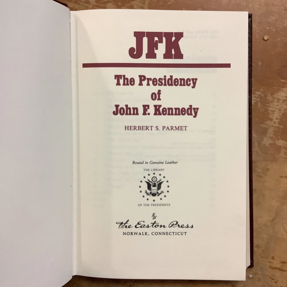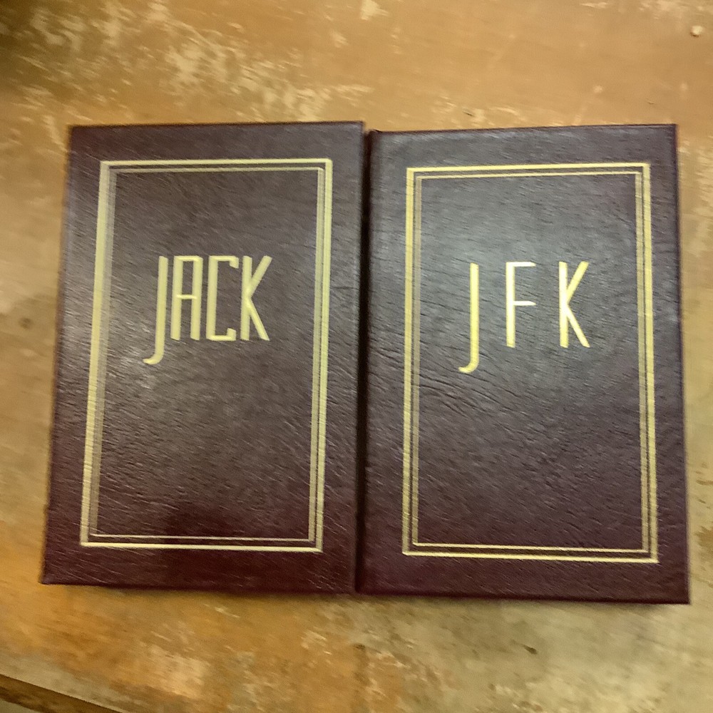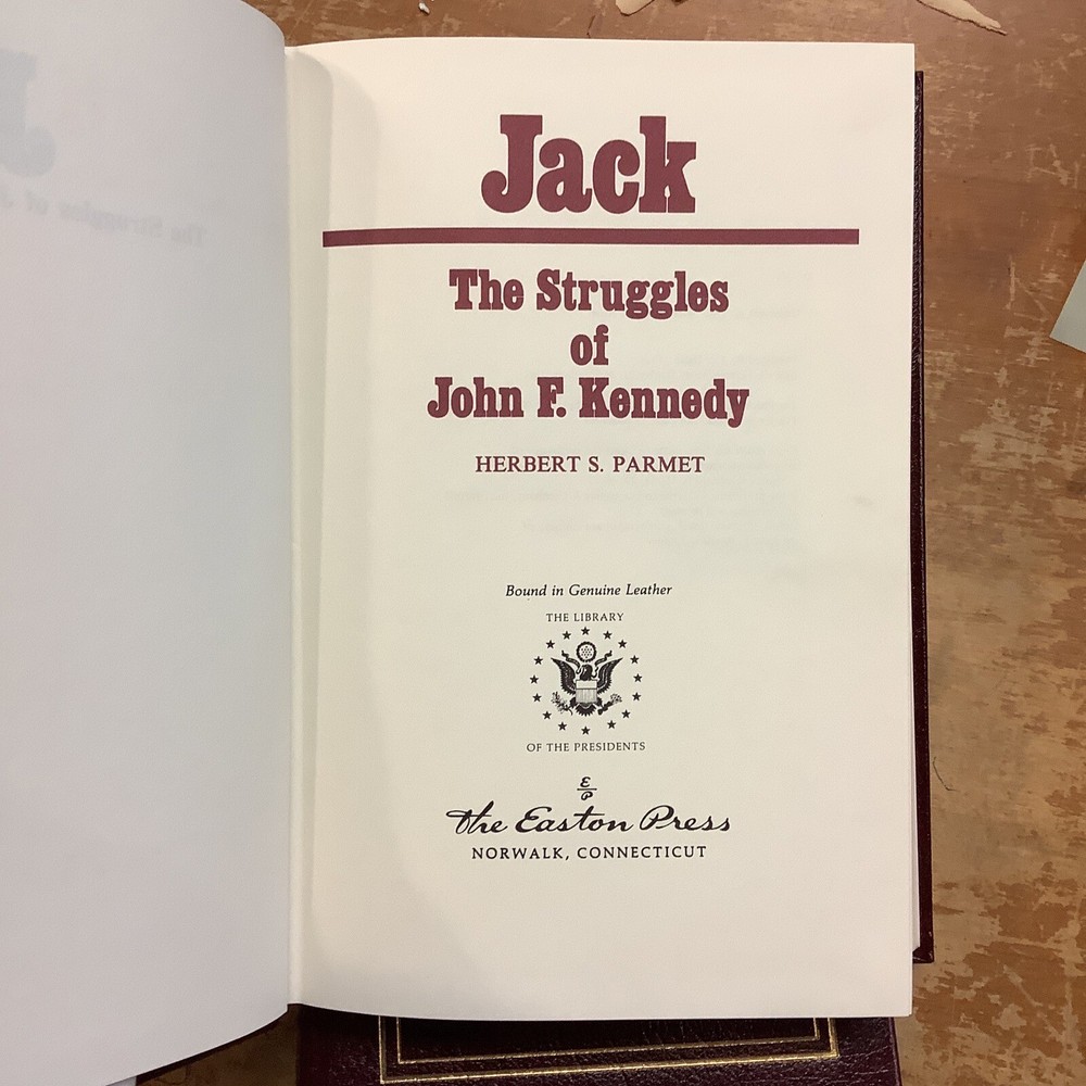 Two volume set - Jack : The Struggles of John F. Kennedy and The Presidency of John F. Kennedy. By Herbert S. Parmet. Published by The Easton Press 1986. Full leather bindings with gilt lettering and decorations. Page edges gilt, ribbon page marker. Sheet of Collector's Notes laid in to each volume.