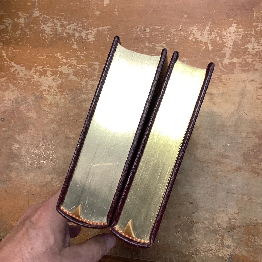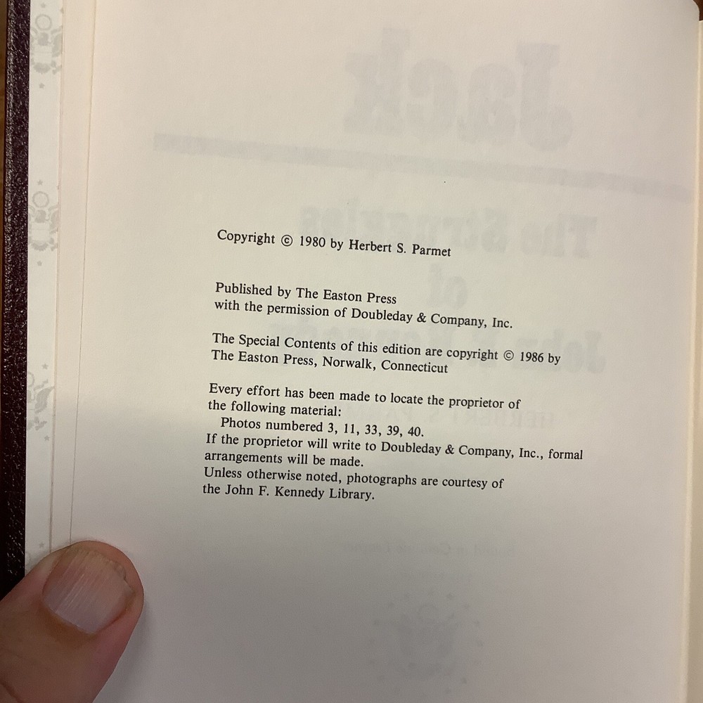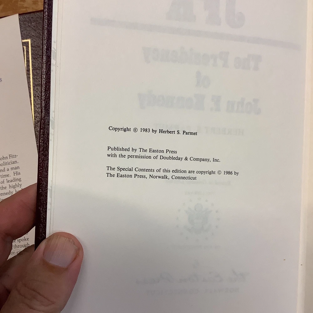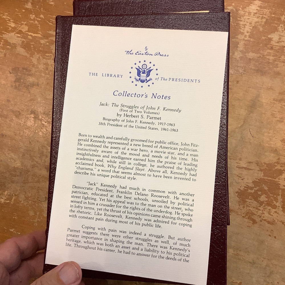Two volume set - Jack : The Struggles of John F. Kennedy and The Presidency of John F. Kennedy. By Herbert S. Parmet. Published by The Easton Press 1986. Full leather bindings with gilt lettering and decorations. Page edges gilt, ribbon page marker. Sheet of Collector's Notes laid in to each volume.