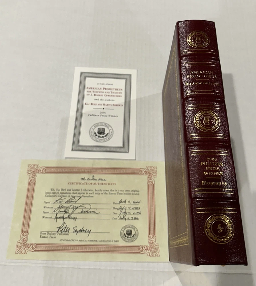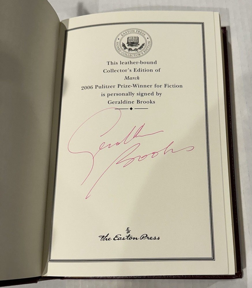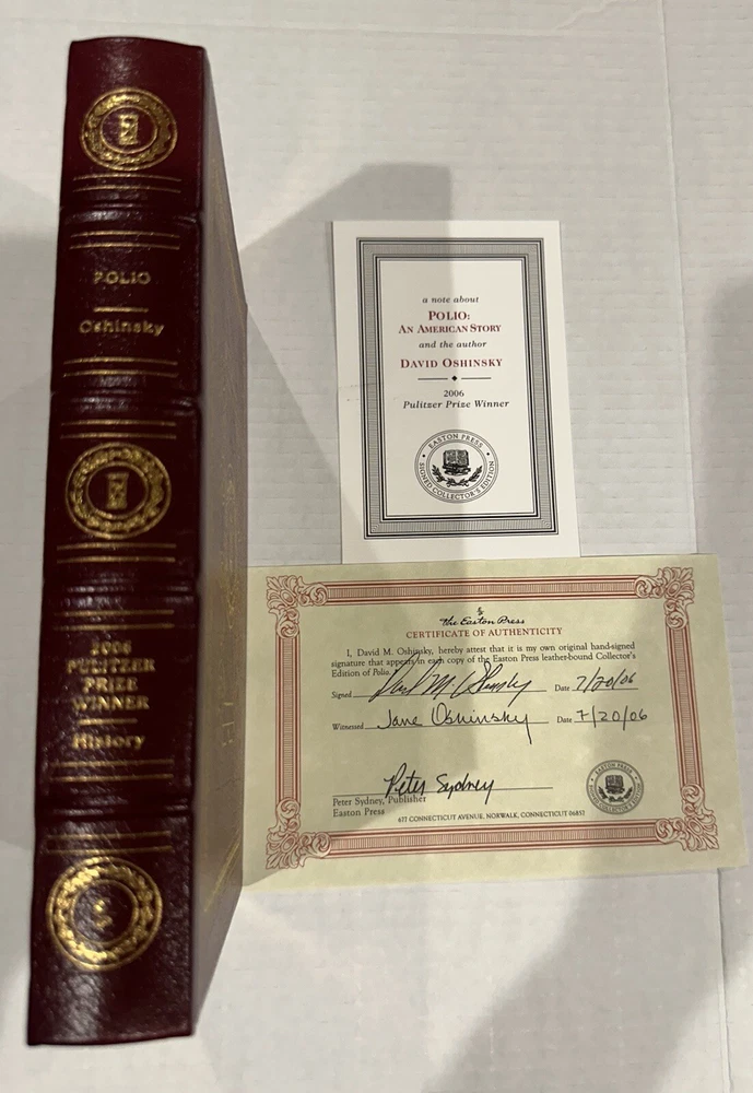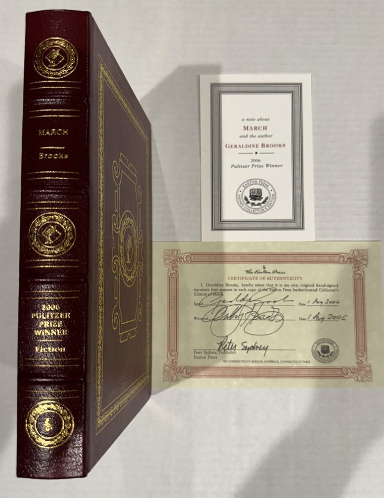 This Easton Press collector's edition set features 5 volumes of Pulitzer Prize winning authors, signed by each writer. The leather bound books are in their original form, printed in 2006, and come with a Certificate of Authenticity. The set includes works in the English language, covering various topics, and is a must-have for any book collector. The publisher, Easton Press, is known for its high-quality publications and this set is no exception. Don't miss the opportunity to own a piece of literary history. Books include: Fiction - MARCH by Geraldine Brooks NonFiction - IMPERIAL RECKONING by Caroline Elkins Biography - AMERICAN PROMETHEUS by Kai Bird & Martin J Sherwin History - POLIO: AN AMERICAN STORY by David M Oshinsky Poetry - LATE WIFE by Claudia Emerson This collectors edition set is in excellent original condition, never been read. Each volume has an original hand signed title page and comes with an original hand signed certificate of authenticity. The set comes with a bookplate on original card, not yet attached for each book. From non-smoking home.