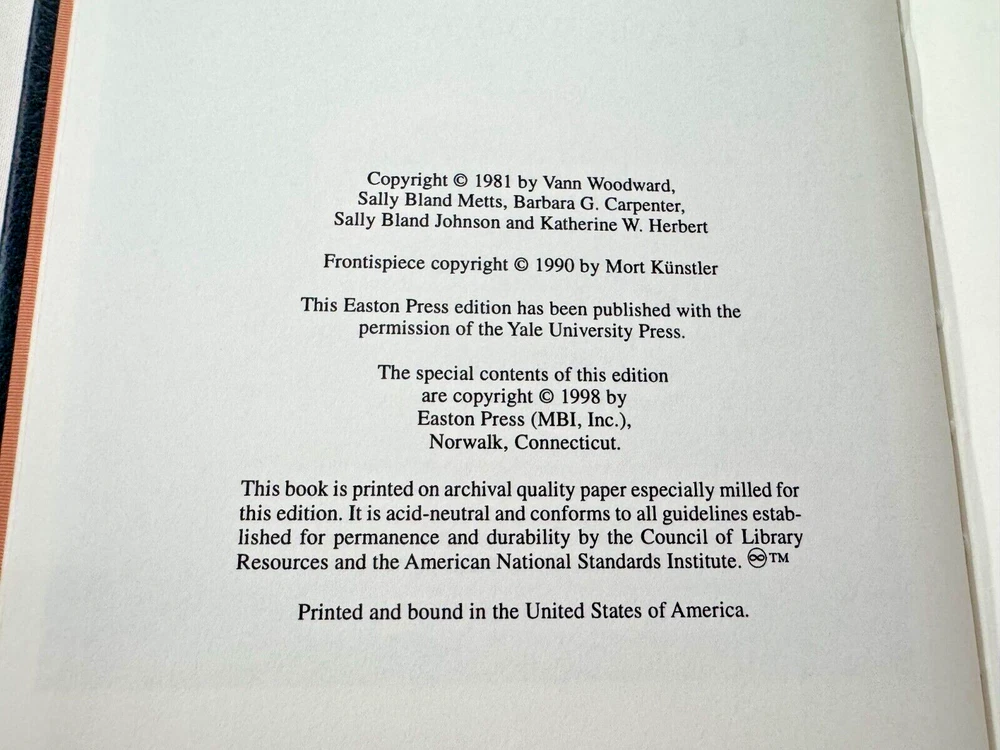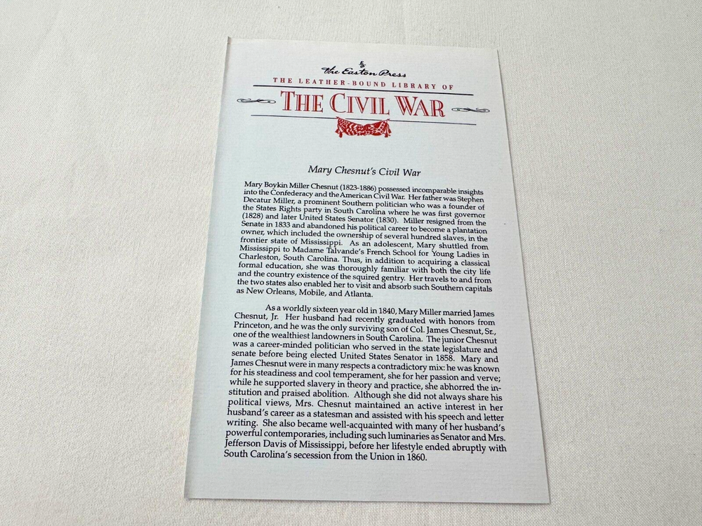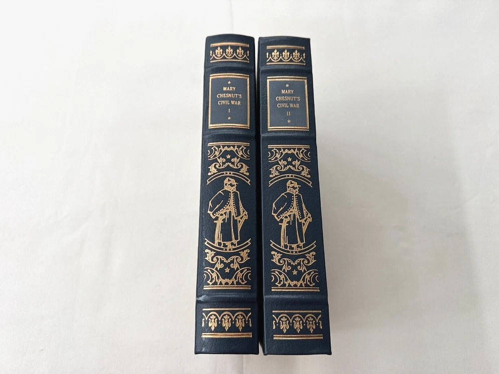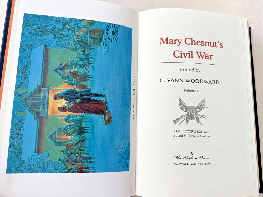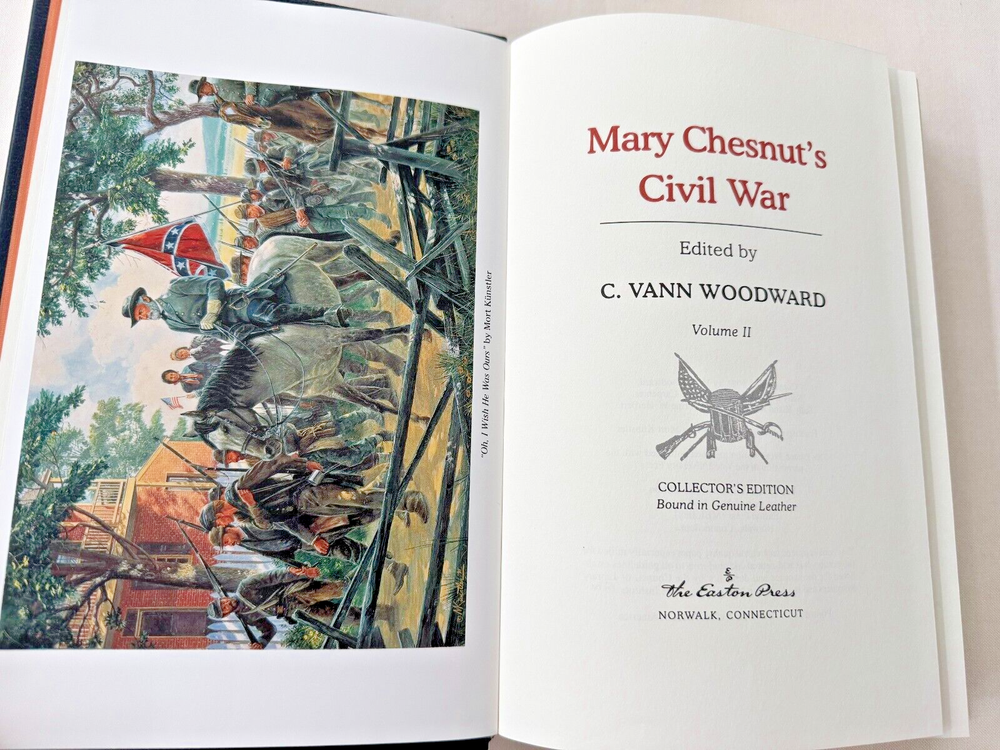 From the Easton Press Library of Civil War Collection... Mary Chesnut's Civil War Two Volume Matching Set Edited by C. Vann Woodward Profusely Illustrated with Maps and Photos Copyright 1998 by The Easton Press Bound in Premium Full Leather This set contains all of the classic Easton Press trimmings: Premium Leather Silk Moire Endleaves Distinctive Cover Design Hubbed Spine, Accented in Real 22KT Gold Satin Ribbon Page Marker Gilded Page Edges Long-lasting, High Quality Acid-neutral Paper Smyth-sewn Pages for Strength and Durability Beautiful Illustrations This set is in near Mint and Unread condition. The front and back covers are both in near Perfect condition with a minor scuff on the binding edge of volume I and the gilded page edges show hardly any wear. There are no attached bookplates nor any other signs of previous ownership. This set is part of the Easton Press Civil War Library Collection and comes complete with the Collector's Notes. It would be a beautiful addition to your Easton Press collection. Hopefully you can add this set to your collection and enjoy it in the years to come... Please Email Me With Any Questions You Might Have! Shipping Info: Buyer to Pay Shipping & Handling International Bidders Pay Extra Shipping Good luck and happy bidding!