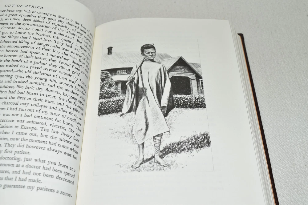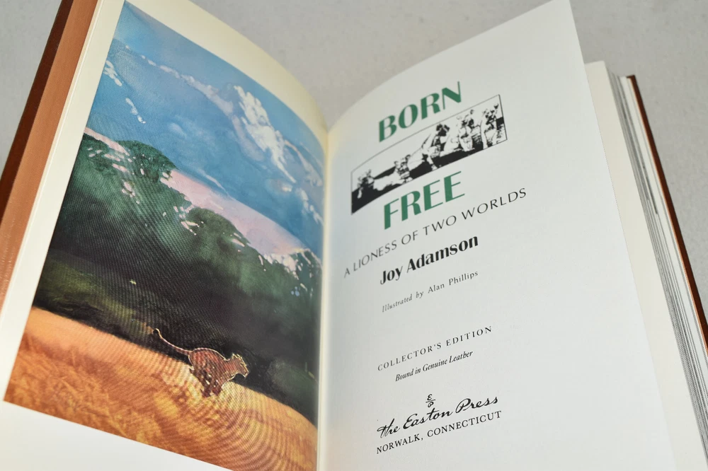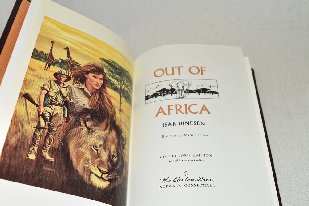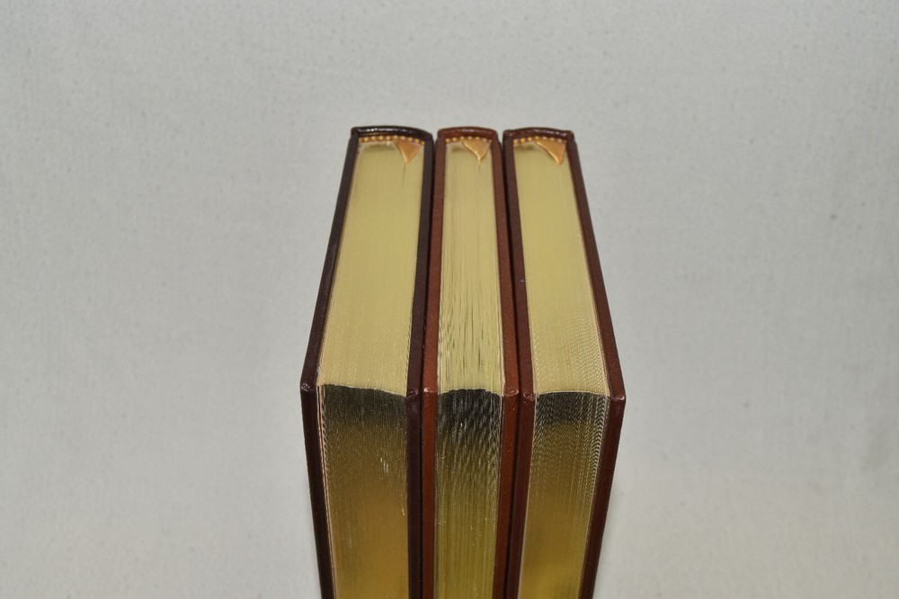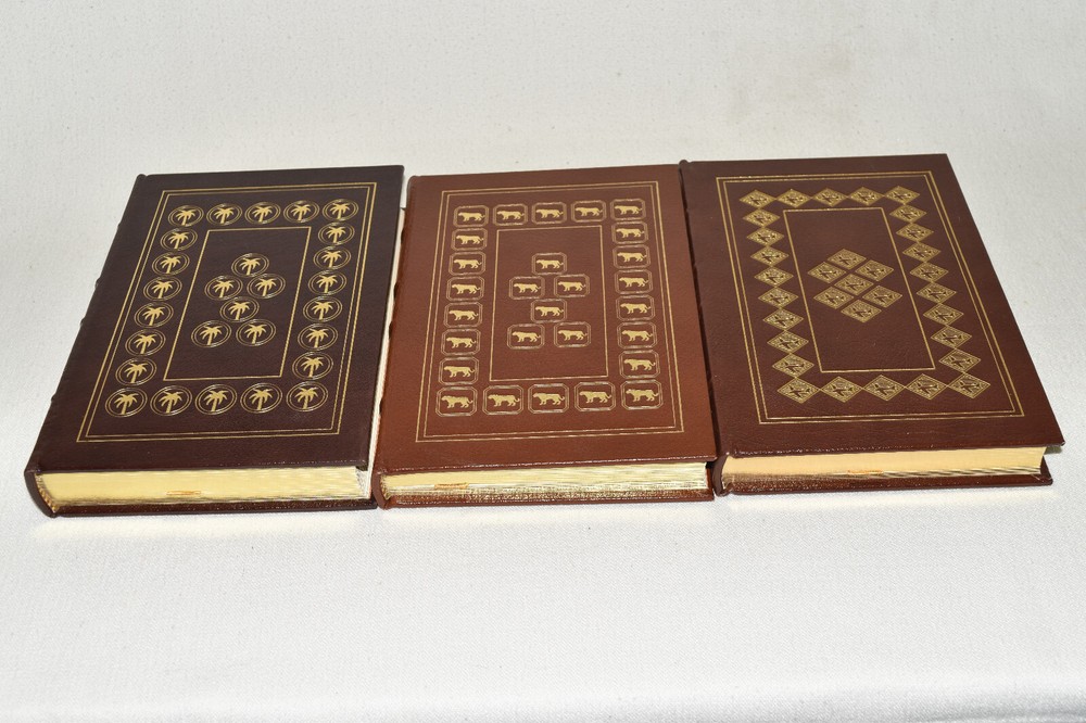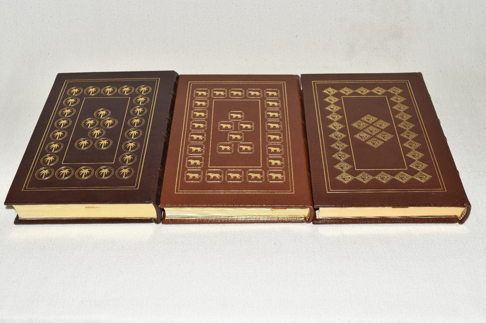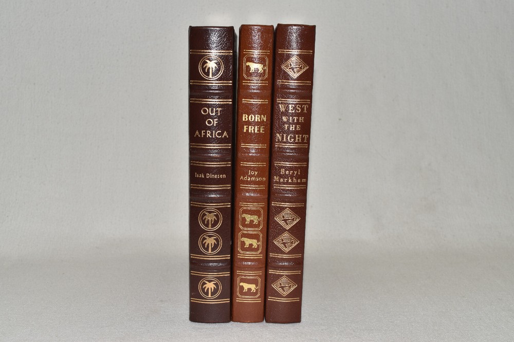 From the Easton Press Collection... Out of Africa Born Free West with the Night Three Volume Matching Set by Isak Dinesen, Joy Adamson, and Beryl Markham Copyright 1989 by The Easton Press Bound in Premium Full Leather This set contains all of the classic Easton Press trimmings: Premium Leather Silk Moire Endleaves Distinctive Cover Design Hubbed Spine, Accented in Real 22KT Gold Satin Ribbon Page Marker Gilded Page Edges Long-lasting, High Quality Acid-neutral Paper Smyth-sewn Pages for Strength and Durability Beautiful Illustrations This set is in Near Fine - Fine condition. The front and back covers are in terrific condition and gilded page edges show minor wear (see pictures of all sides). There is faint residue on the second pages. This set is part of the Easton Press Collection and would be a beautiful addition to your Easton Press collection. Hopefully you can add this set to your collection and enjoy it in the years to come... Please Email Me With Any Questions You Might Have! Shipping Info: Buyer to Pay Shipping & Handling International Bidders Pay Extra Shipping Good luck and happy bidding!
