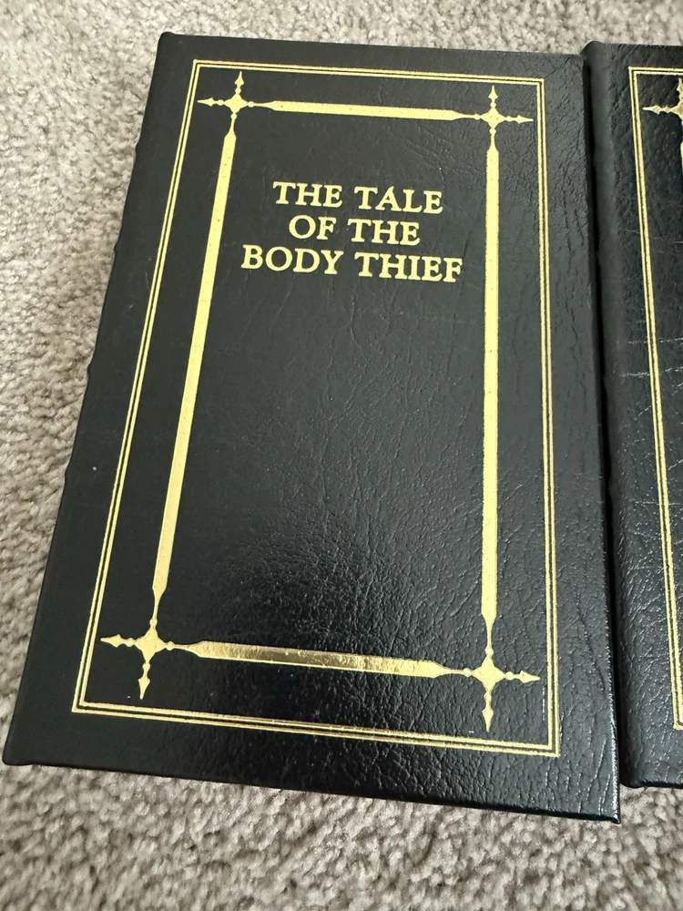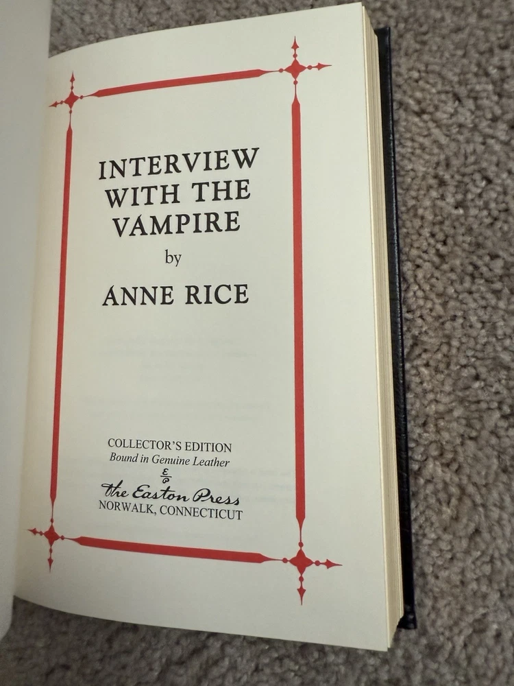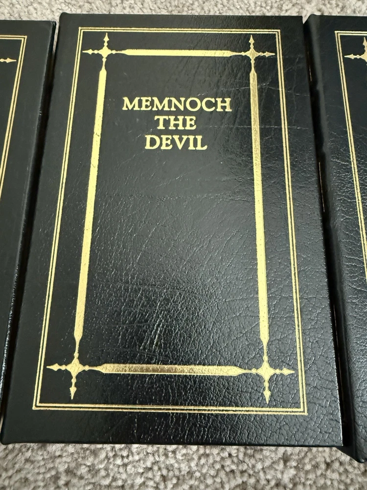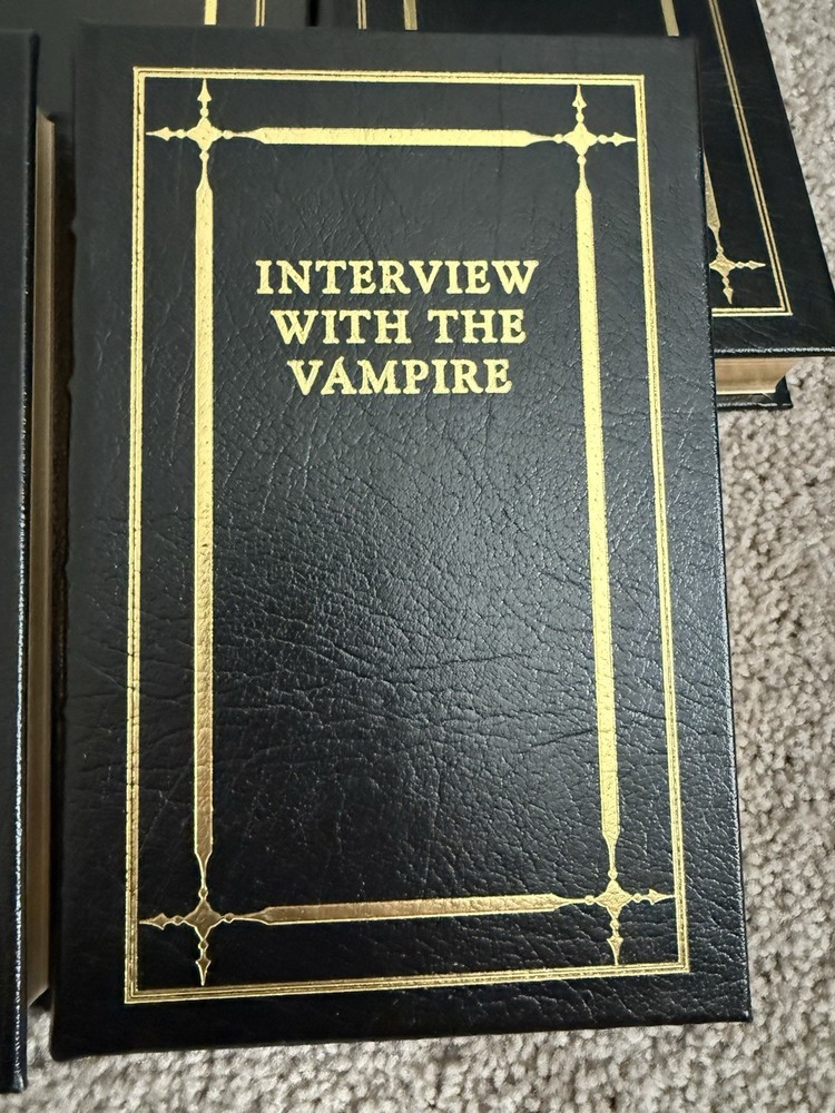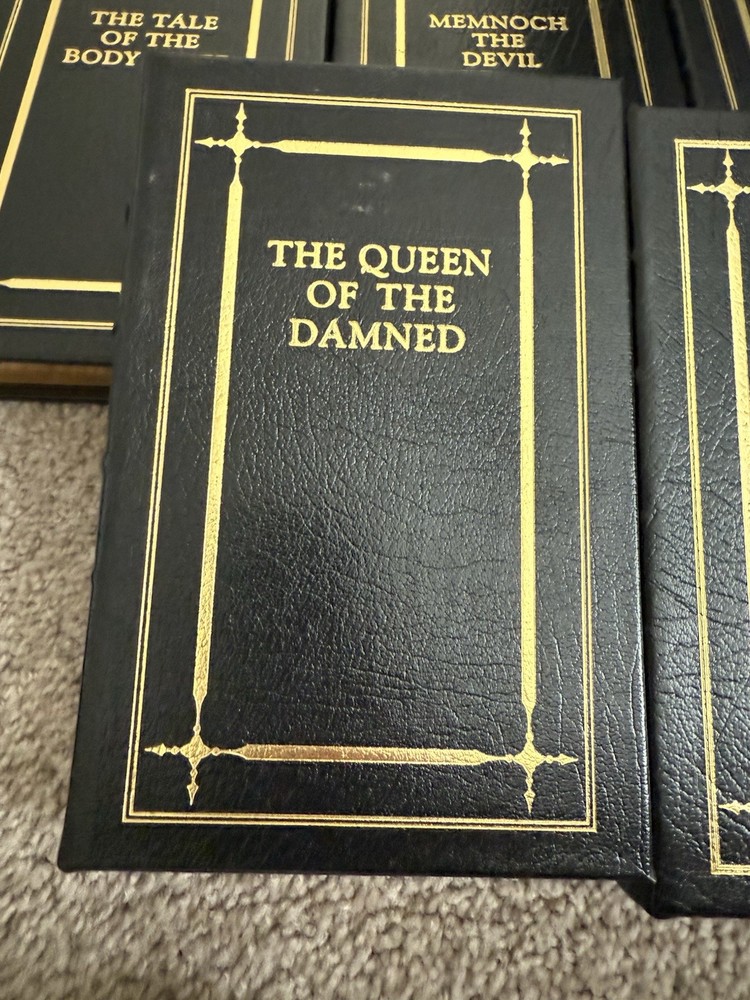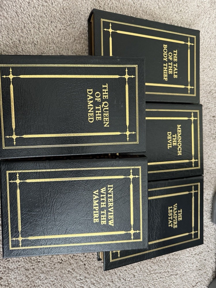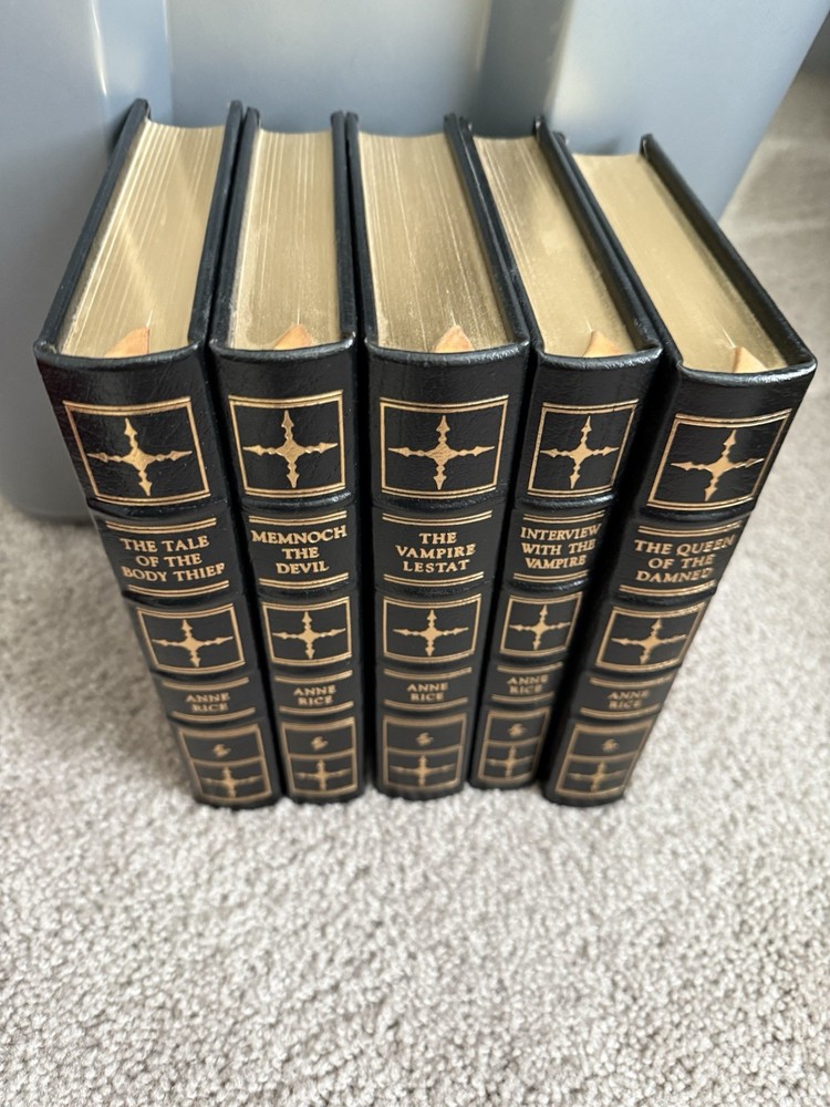 OUT-OF-PRINT from the Easton Press Collection... The Vampire Chronicles by Anne Rice 1. Interview with the Vampire 2. The Vampire Lestat 3. The Queen of the Damned 4. The Tale of the Body Thief 5. Memnoch the Devil Copyright 2006 by The Easton Press Bound in Premium Full Leather This volume contains all of the classic Easton Press trimmings: Premium Leather Silk Moire Endleaves Distinctive Cover Design Hubbed Spine, Accented in Real 22KT Gold Satin Ribbon Page Marker Gilded Page Edges Long-lasting, High Quality Acid-neutral Paper Smyth-sewn Pages for Strength and Durability DESCRIPTION A very scarce title in any condition, this OUT-OF-PRINT matching set is in Unread condition and has minimal shelf wear. The front and back covers are in great condition with only a few shelf wear markings. The gilded page edges show little wear! A little shelf wear, but overall in brand new condition!! There are no markings, bookplates, or other signs of prior ownership in this book. This book is part of The Easton Press Collection and would be a beautiful addition to your Easton Press collection. Overall, this set is a grade collector's set. This set is very elusive in this great condition, as only a limited number of them were ever published, so now is the time to act. See pictures for exact set. Hopefully you can add this set to your collection and enjoy it in the years to come...
