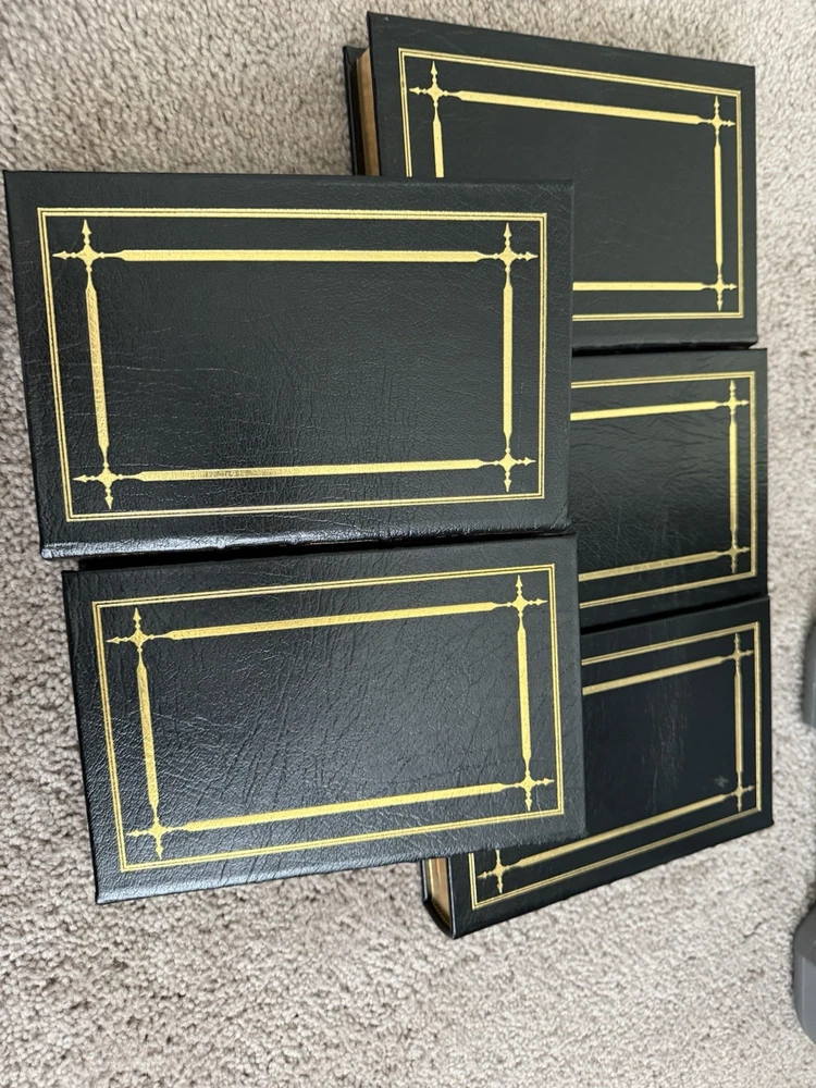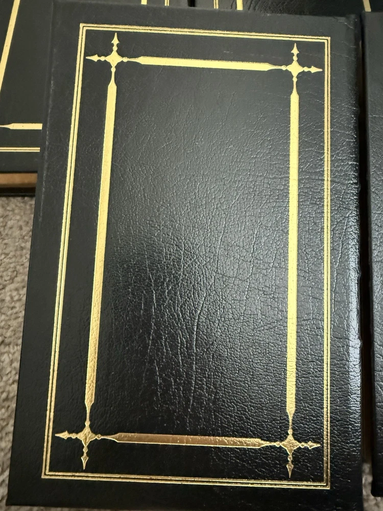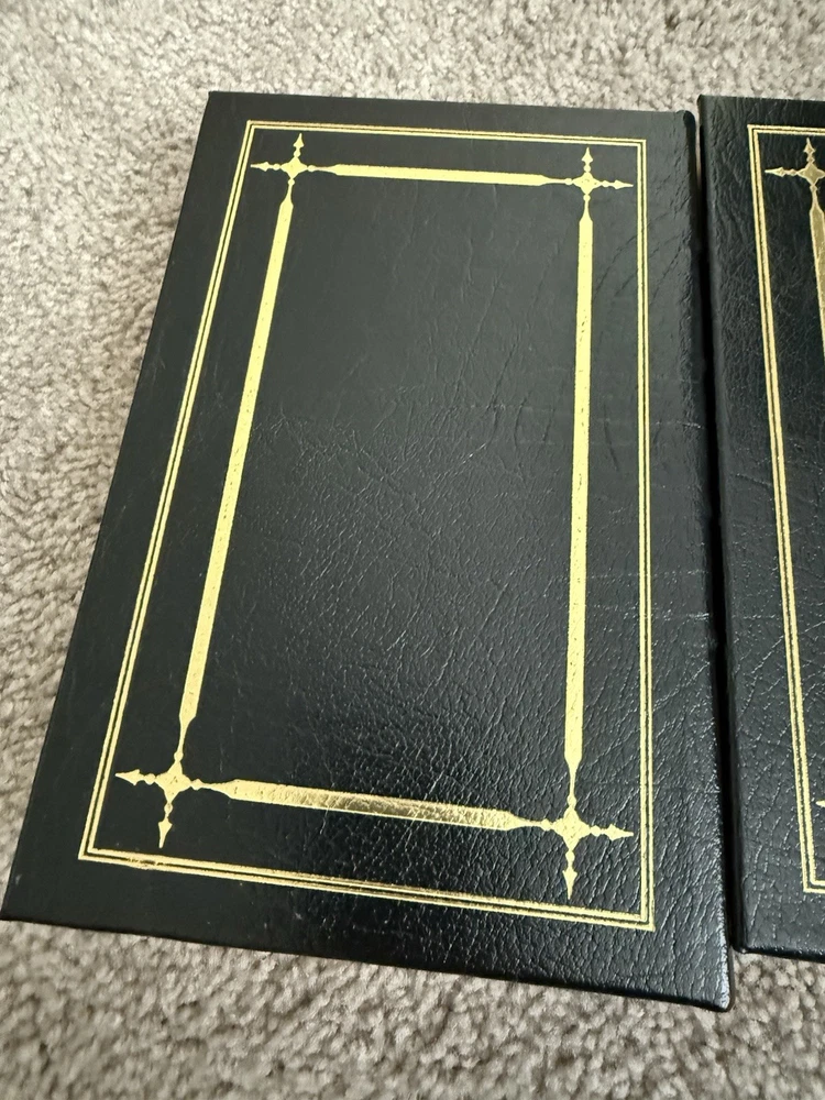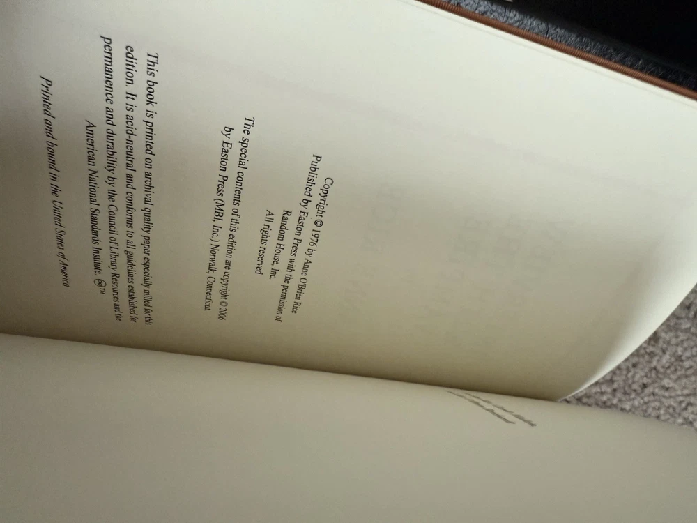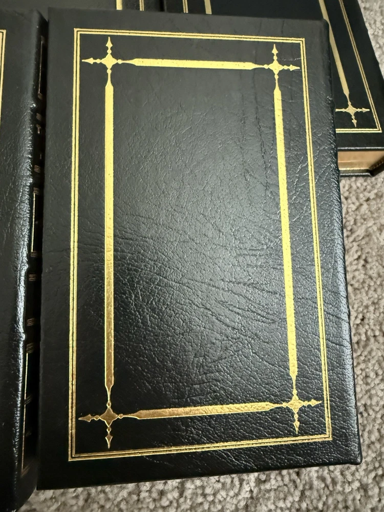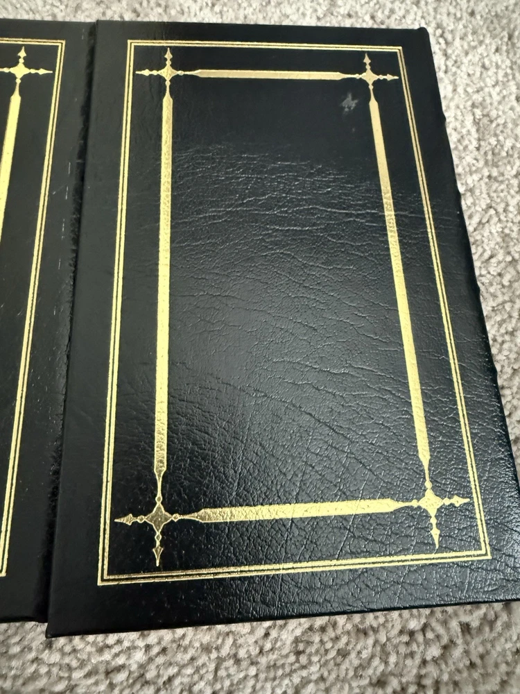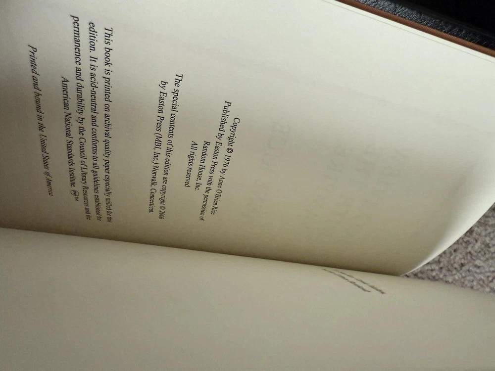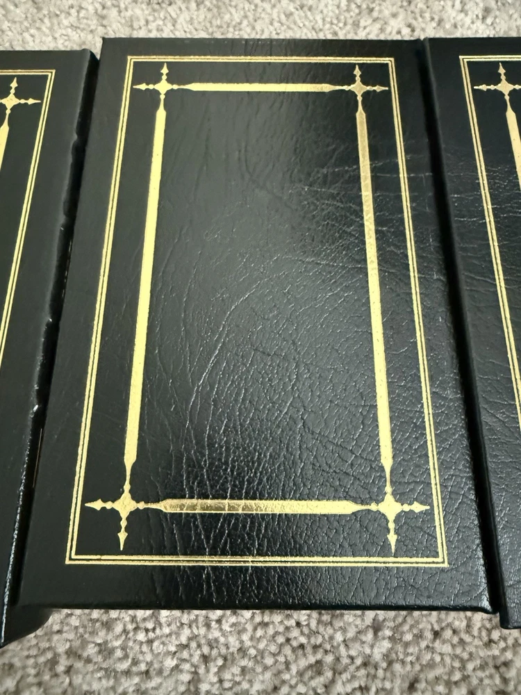OUT-OF-PRINT from the Easton Press Collection... The Vampire Chronicles by Anne Rice 1. Interview with the Vampire 2. The Vampire Lestat 3. The Queen of the Damned 4. The Tale of the Body Thief 5. Memnoch the Devil Copyright 2006 by The Easton Press Bound in Premium Full Leather This volume contains all of the classic Easton Press trimmings: Premium Leather Silk Moire Endleaves Distinctive Cover Design Hubbed Spine, Accented in Real 22KT Gold Satin Ribbon Page Marker Gilded Page Edges Long-lasting, High Quality Acid-neutral Paper Smyth-sewn Pages for Strength and Durability DESCRIPTION A very scarce title in any condition, this OUT-OF-PRINT matching set is in Unread condition and has minimal shelf wear. The front and back covers are in great condition with only a few shelf wear markings. The gilded page edges show little wear! A little shelf wear, but overall in brand new condition!! There are no markings, bookplates, or other signs of prior ownership in this book. This book is part of The Easton Press Collection and would be a beautiful addition to your Easton Press collection. Overall, this set is a grade collector's set. This set is very elusive in this great condition, as only a limited number of them were ever published, so now is the time to act. See pictures for exact set. Hopefully you can add this set to your collection and enjoy it in the years to come...