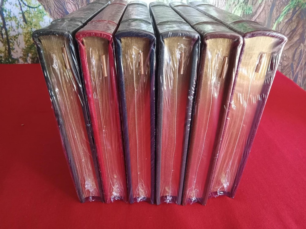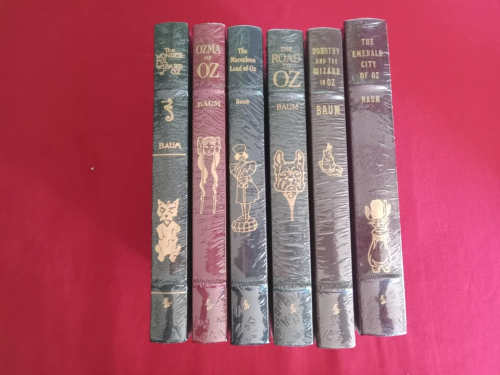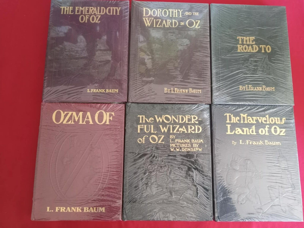 This product is a set of six 6-inch books from Easton Press, featuring titles from the Wizard of Oz series by L. Frank Baum. The first edition leather books, printed in 1989, are illustrated by John R. Neill and are in English language. The set includes "Wizard of Oz," "The Marvelous Land of Oz," "Dorothy and the Wizard in Oz," "The Emerald City of Oz," "The Road to Oz," and "Ozma of Oz." These collectible books are special attributes for any literature enthusiast, making them a valuable addition to any collection of literature and fiction works. They are all factory sealed and one has a small amount of damage on the spine it is pictured.