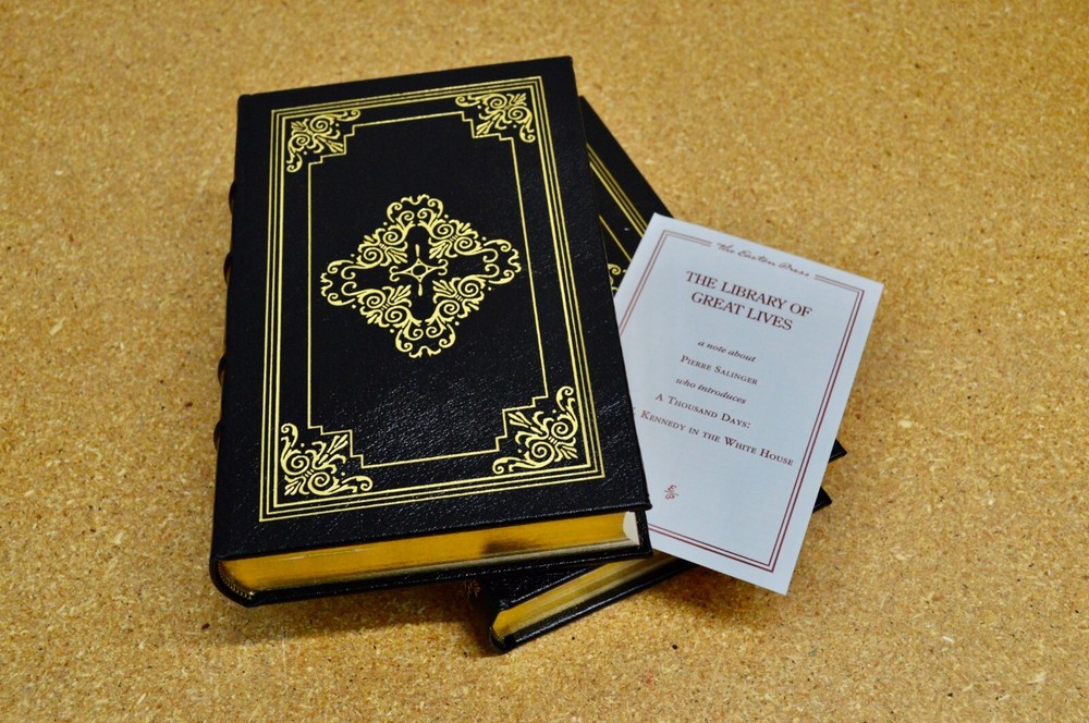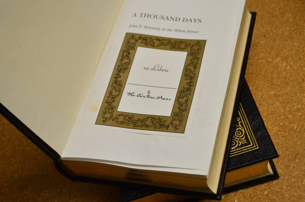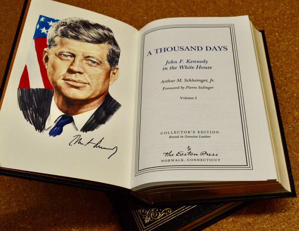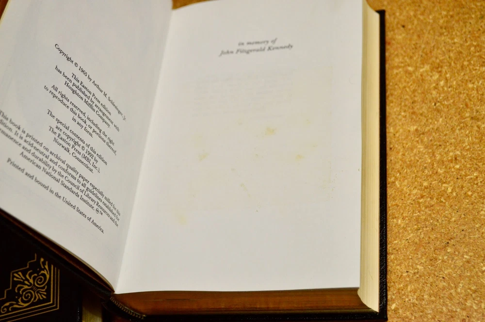 A Thousand Days by Arthur M. Schlesinger, Jr. - 2 Volume Set published 1992 by Easton Press in sumptuous full leather. Evidence of former owner's bookplate removal book 2 has a replacement unsigned bookplate on endpaper This beautiful two-volume set is a must-have for any collector or fan of American history. Written by Arthur M. Schlesinger Jr., A Thousand Days gives a detailed account of John F. Kennedy's presidency, including his political and personal life, up until his tragic assassination. Easton Press is widely recognized as the highest quality modern leather books available, and will make a stunning addition to your library or a fitting start to a fine binding leather book collection. Each book is bound in a signature color and design, and exhibits 22 karat gold foil stamping of the titles and jacket designs. They are printed on archival quality acid-neutral paper and include silk moire endpapers, an expensive hubbed spine, bound-in silk ribbons bookmarks, gilded page edges, Smyth-sewn pages for strength and durability and often contain beautiful illustrations. ~~~~~~~~~~~~~~~~The Fine Print~~~~~~~~~~~~~~~~: At Rarified Books, we take pride in offering items of extraordinary quality, value and condition. We offer the finest in modern leather-bound books and more. Books are sourced from smoke free homes, and are carefully inspected. Other items are equally carefully sourced ... check out our other listings and see! All descriptions are to the best of our knowledge. Sales are made as-is and no warranty is offered as to authenticity or provenance. Title passes to the buyer upon shipment. All sales are final. Sales tax may apply which is collected automatically by eBay. Returns are not accepted except in rare circumstances upon agreement. Shipping is the responsibility of the buyer unless otherwise noted or agreed. Books are professionally wrapped and protected in bubble wrapping for shipping, with additional cushioning filler in an appropriately sized carton or padded envelope. Most books will be shipped via USPS Media Mail with tracking or FedEx Home Delivery. International Shipping through eBay's Global Shipping Program only. International buyers are responsible for all local customs fees, taxes, and duties. These charges are not included in our shipping costs. We also buy books and are always open to purchasing excellent condition books from Easton Press, Franklin Library, Folio Society and similar as well as other rare and collectible books. See our website www.modernleatherbooks.com and let us know what you have. Thank you for considering our listing!