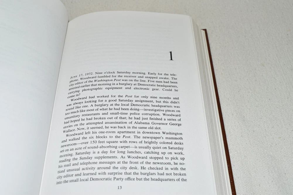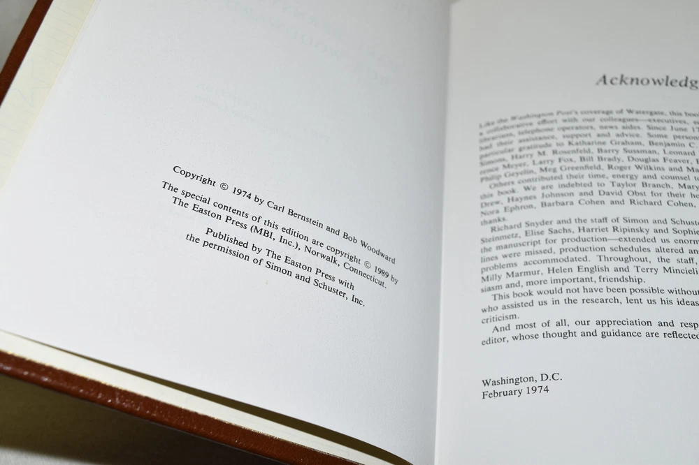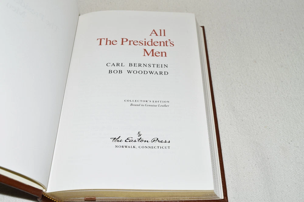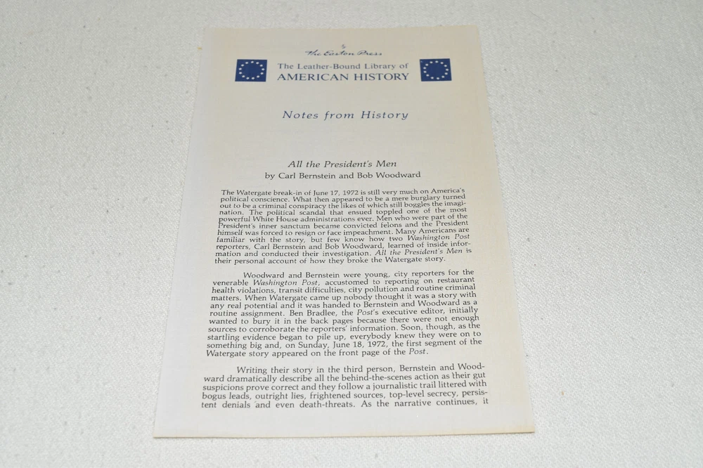 From the Easton Press Library of American History... All The President's Men by Carl Bernstein and Bob Woodward Collector's Edition Copyright 1989 by The Easton Press Bound in Premium Full Leather This volume contains all of the classic Easton Press trimmings: Premium Leather Decorated Endleaves Distinctive Cover Design Hubbed Spine, Accented in Real 22KT Gold Satin Ribbon Page Marker Gilded Page Edges Long-lasting, High Quality Acid-neutral Paper Smyth-sewn Pages for Strength and Durability Beautiful Illustrations A very scarce title in any condition, this Easton Press Edition is in Fine condition. The front and back covers are both in terrific condition and the gilded page edges show only very minor wear (see pictures of all sides of gilt). There is faint residue on the second page. This book is part of the Library of American History Collection published by Easton Press. It comes complete with Collector's Notes and would be a beautiful addition to your Easton Press collection. Please Email Me With Any Questions You Might Have! Shipping Info: Buyer to Pay Shipping and Handling International Bidders Pay Extra Shipping Seller Not Responsible For Uninsured Items Lost or Damaged in Mail Forms of Payment Accepted: Paypal Good luck and happy bidding! Powered by eBay Turbo Lister The free listing tool. List your items fast and easy and manage your active items.