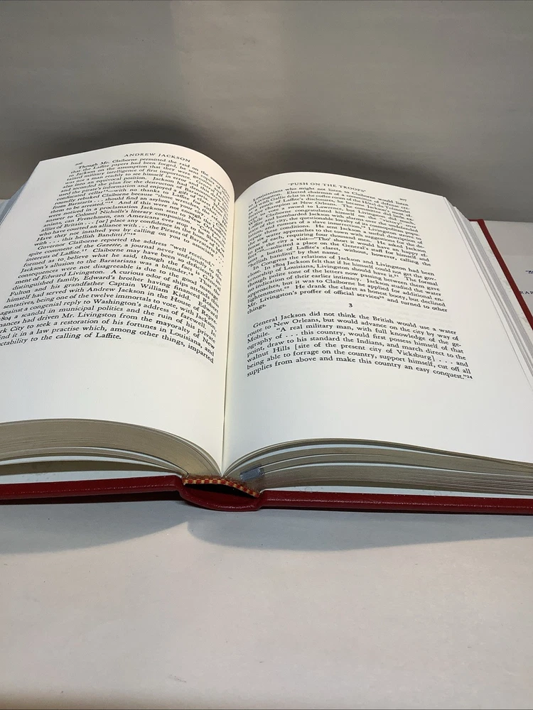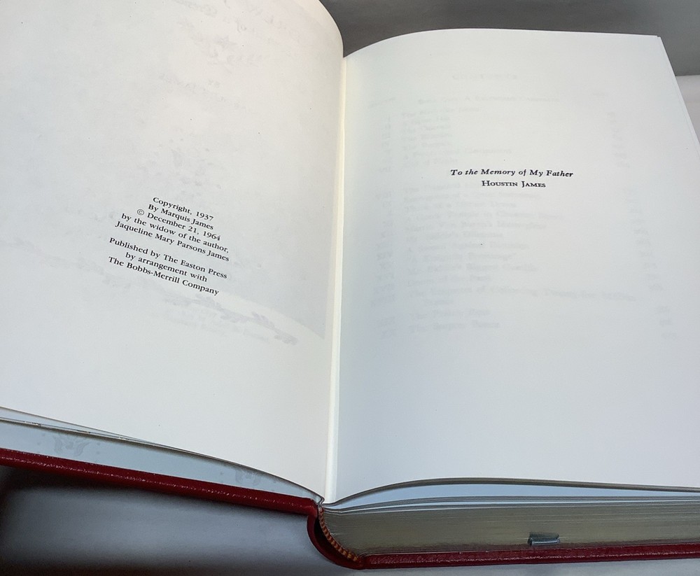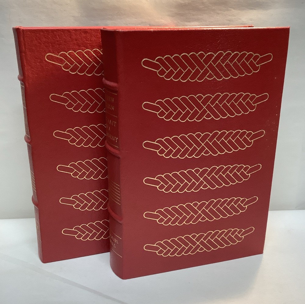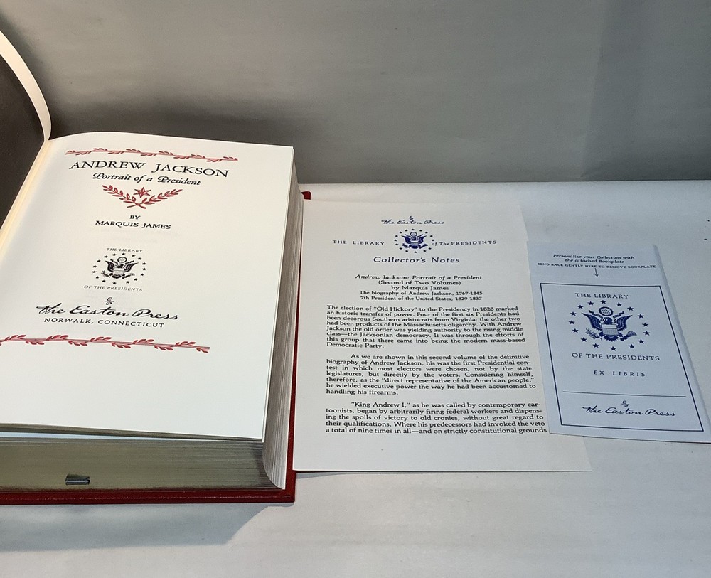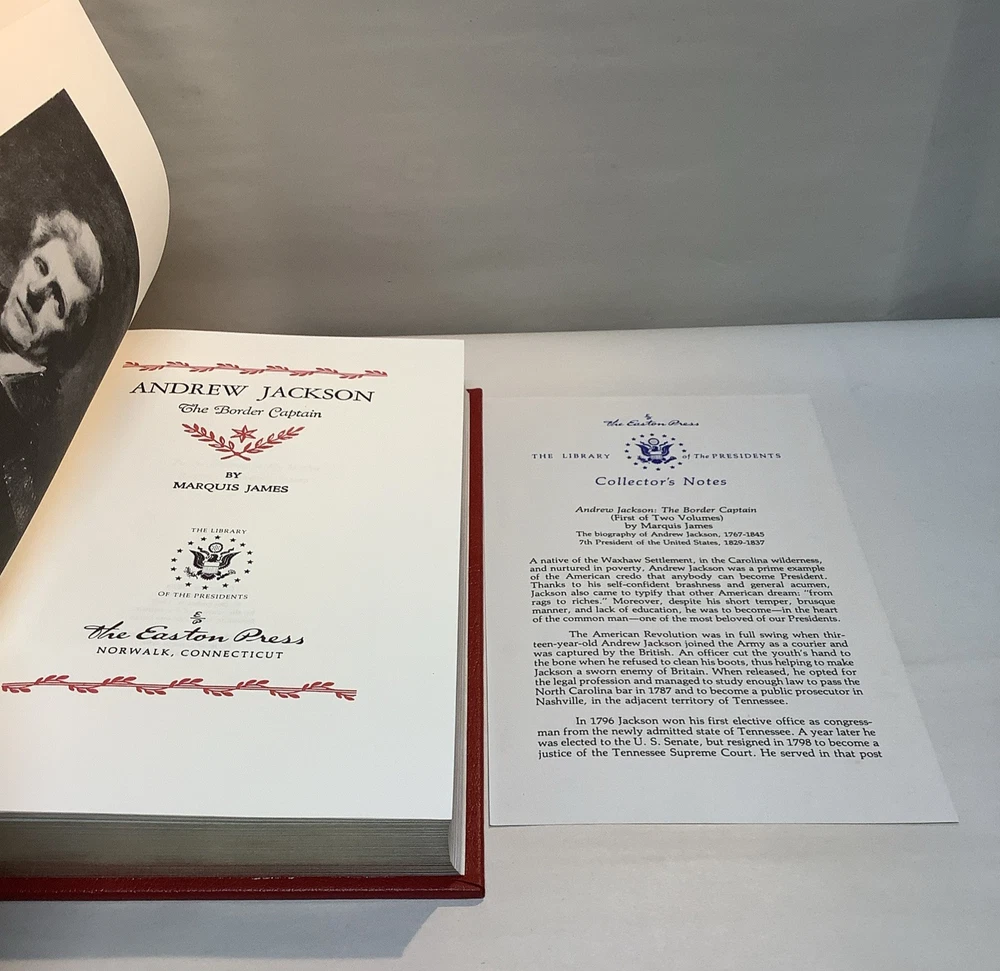The Easton Press 2 volume set of "ANDREW JACKSON" by Marquis James is a collector's edition. Portrait of A President 1964 and The Border Captain 1960. The books are bound in leather and published by Easton Press in the United States. The set is a historical biography of Andrew Jackson, making it a valuable addition for book collectors and history enthusiasts alike. With special attributes and original content, this set is a rare and sought-after find for those interested in American biography and history. Please make sure to review all the pictures and ask any questions you may have, as I would like to avoid dealing with refunds or returns.