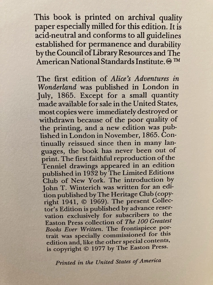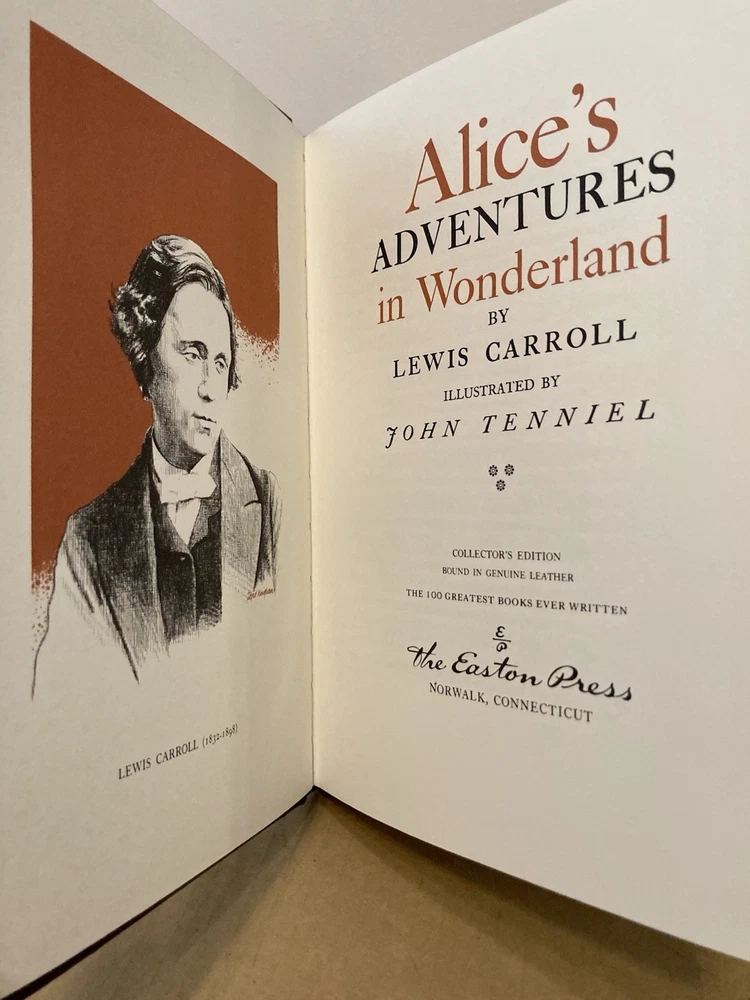 Easton Press Alice’s Adventure in Wonderland by Lewis Carrol • Leather • Illustrated • Very Good Condition, Covers Unmarred, Gold Lettering and Design Bright, No Fading, Sharp Corners, Binding Tight • No Affixed Nameplates • Pages Clean and Crisp • No Writing • No Markings • No Folds • No Creases • No Tears • No Stains • No Odors • Gold Gilt Page Edges Very Good, Have a Nice Sheen (see all photos) • Book Will Be Carefully Padded and Packed in a Sturdy Box • Shipped With USPS Media Mail to the USA Only.