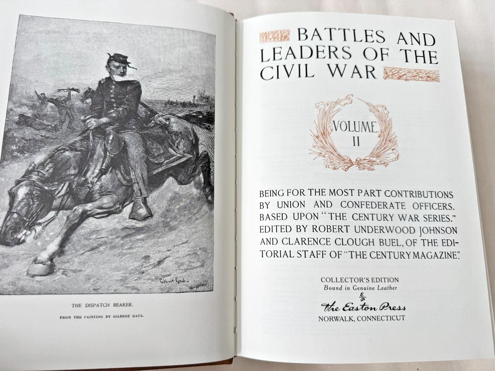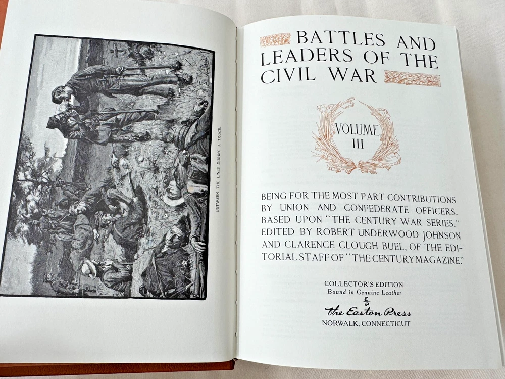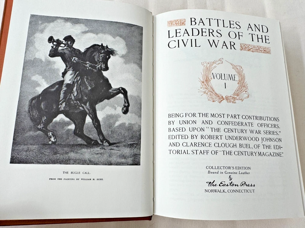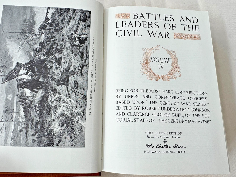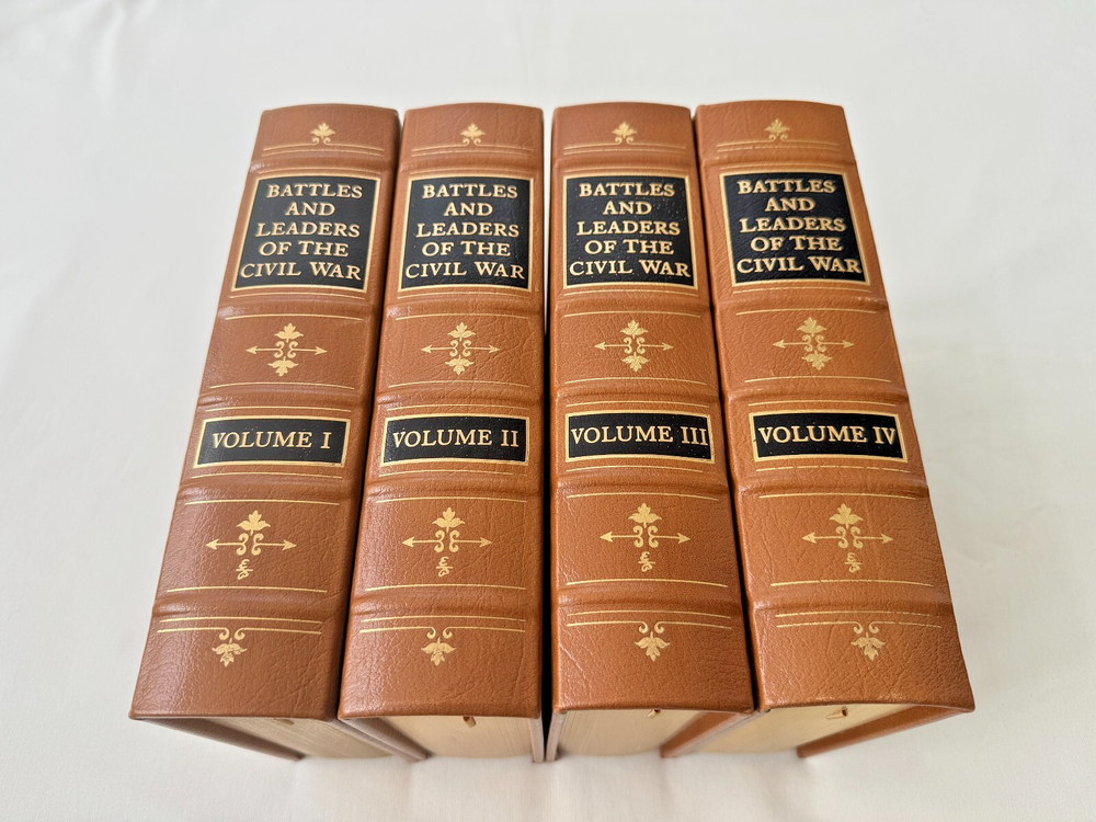 OUT-OF-PRINT from the Easton Press Collection... Battles and Leaders of the Civil War Complete 4 Volume Set Copyright 2002 by The Easton Press Bound in Premium Full Leather This set contains all of the classic Easton Press trimmings: Premium Leather Silk Moire Endleaves Distinctive Cover Design Hubbed Spine, Accented in Real 22KT Gold Satin Ribbon Page Marker Gilded Page Edges Long-lasting, High Quality Acid-neutral Paper Smyth-sewn Pages for Strength and Durability DESCRIPTION A very scarce set in any condition, this OUT-OF-PRINT 4 Volume Matching Set is in near Mint and Unread condition. The front and back covers are in Perfect condition and the gilded page edges show hardly any wear at all! This set is part of The Easton Press Collection and comes with attached blank bookplates. It would be a beautiful addition to your Easton Press collection. Overall, this set is a grade collector's set. This set is very elusive in this superior condition, as only a limited number of them were ever published, so now is the time to act. Hopefully you can add this set to your collection and enjoy it in the years to come... SHIPPING POLICY We take great care packaging every item to ensure safe shipment to you. Items are packaged using plenty of bubble wrap and packaged securely in a sturdy box. Our secure shipping methods have resulted in zero damaged items in over 15 years! Items are shipped out within 1 - 3 days of payment being received. RETURN & REFUND POLICY We accept refunds within 30 days of purchase. If you are not 100% satisfied with your purchase, please contact us about a refund, or initiate a refund through eBay. CONTACT US We are committed to providing our customers with the best possible on-line shopping experience. This includes a commitment to excellent customer service, before you purchase as well as after your order has been delivered. Please feel free to submit any questions or inquiries regarding this item or your order by sending us a message through the eBay messaging system. We will typically respond within 24 hours of receiving your message.