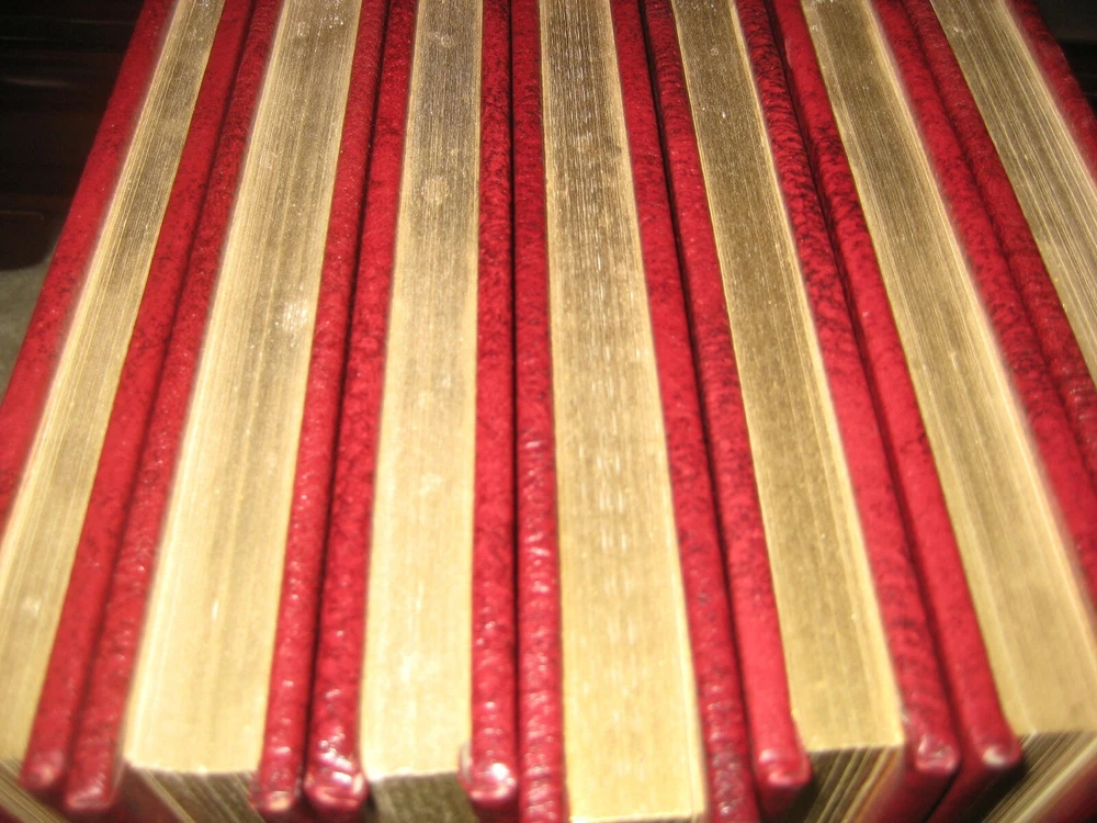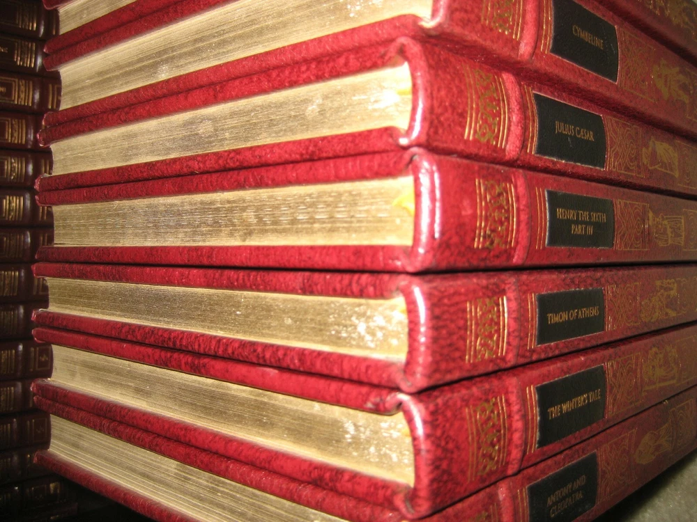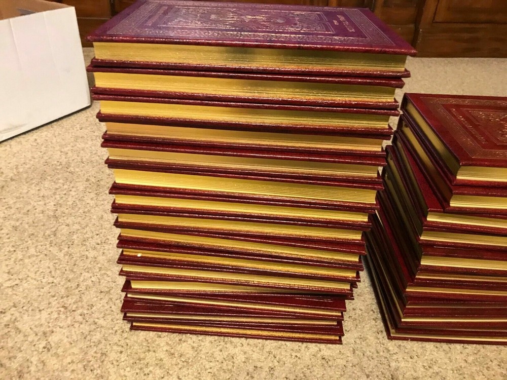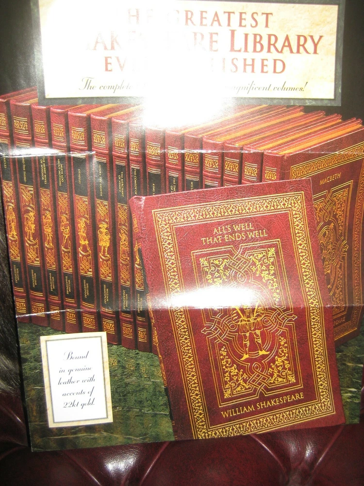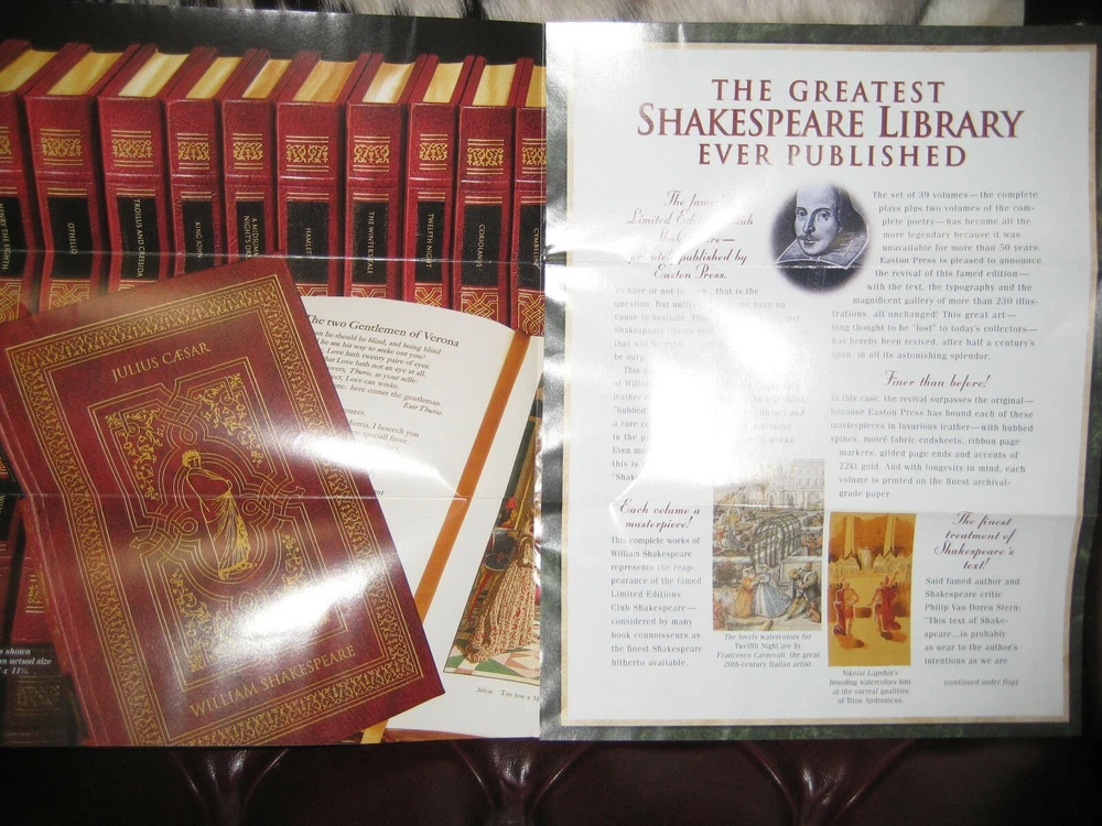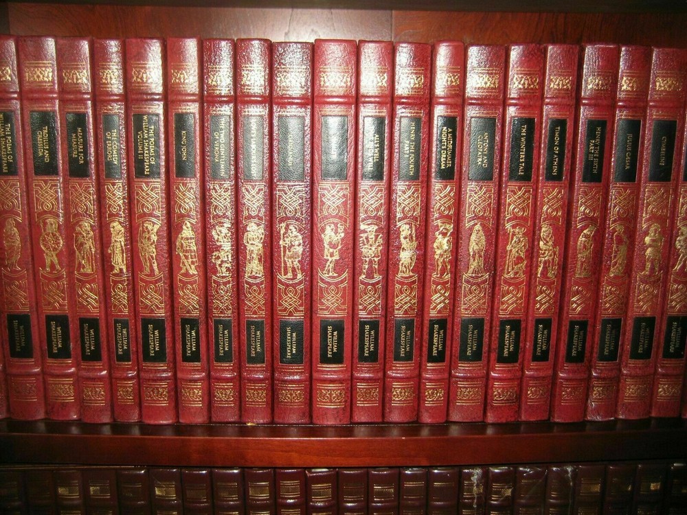 Easton Press - Genuine Leather Bound Collector's Edition The Ultimate Leather Bound Heirloom Collection Very Scarce book in any condition This complete set is near fine, lightly- read condition. Binding is tight with normal shelf wears. G old page edging is still shiny, with beautiful bright end leaves and satin ribbon page marker. NO BOOK PLATE IS ATTACHED THE GREATEST SHAKESPEARE LIBRARY EVER PUBLISHED Easton Press THE COMPLETE WORKS OF WILLIAM SHAKESPEARE in 39 Volumes Complete Leather Set with introductions, notes and illustrations Start your collection today! Magnificently Bound in Genuine Leather. Treat Yourself to Literary Luxury! Keepsake Editions That Can Be Passed Down for Generations. THE COMPLETE WORKS OF WILLIAM SHAKESPEARE in 39 volumes 286 x 197 mm (11 1/4" x 7 3/4") Large Volumes. Publisher's original burgundy Morocco, elaborately gilt, moiré silk end leaves, all edges gilt w ith colored wood engravings, lithographs, line drawings in color and pencil, and collotypes throughout by Eric Gill, Arthur Rackham, Robert Gibbings, W. A. Dwiggins, Sylvain Sauvage, Jean Charlot, Valenti Angelo, and others. profusely illustrated inside. LIST OF TITLES (39 VOLUMES): 1. A Midsummer Night's Dream 2. All's Well that Ends Well 3. Anthony and Cleopatra 4. As You Like It 5. Coriolanus 6. Cymbeline 7. Hamlet 8. Henry the Eighth 9. Henry the Fifth 10. Henry the Fourth, Part I 11. Henry the Fourth, Part II 12. Henry the Sixth, Part I 13. Henry the Sixth, Part II 14. Henry the Sixth, Part III 15. Julius Caesar 16. King John 17. King Lear 18. Love's Labour's Lost 19. Macbeth 20. Measure for Measure 21. Much Ado About Nothing 22. Othello 23. Pericles 24. Richard the Second 25. Richard the Third 26. Romeo and Juliet 27. The Comedy of Errors 28. The Merchant of Venice 29. The Merry Wives of Windsor 30. The Poems of William Shakespeare 31. The Sonnets of William Shakespeare 32. The Taming of the Shrew 33. The Tempest 34. The Two Gentlemen of Verona 35. The Winter's Tale 36. Timon of Athens 37. Titus Andronicus 38. Troilus and Cressida 39. Twelfth Night Easton Press books are bound in genuine premium leather and come with moire fabric endsheets and a permanent satin ribbon page marker. The spines of these luxurious books are accented in 22-karat gold and are hubbed with traditional raised rings. Each unique binding is decorated with a deeply inlaid design of 22-karat gold. The page ends are gilded in 22-karat gold for beauty and protection against dust and humidity. Easton Press Books are also printed on archival-quality acid-neutral paper that is Smyth-sewn for strength and durability .