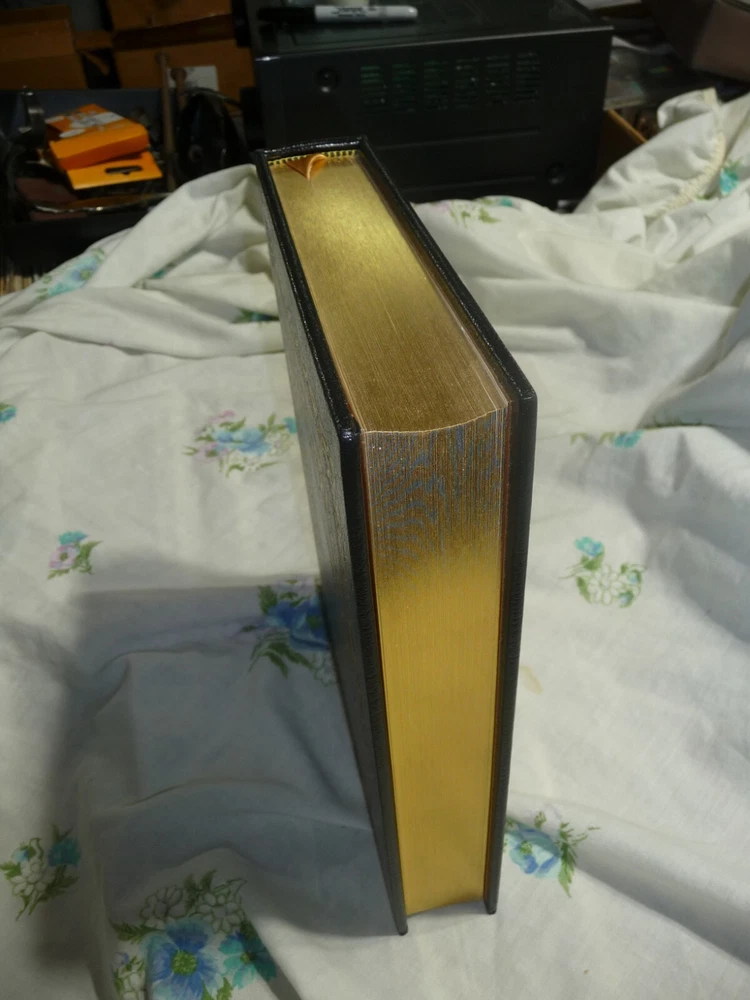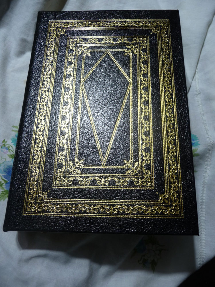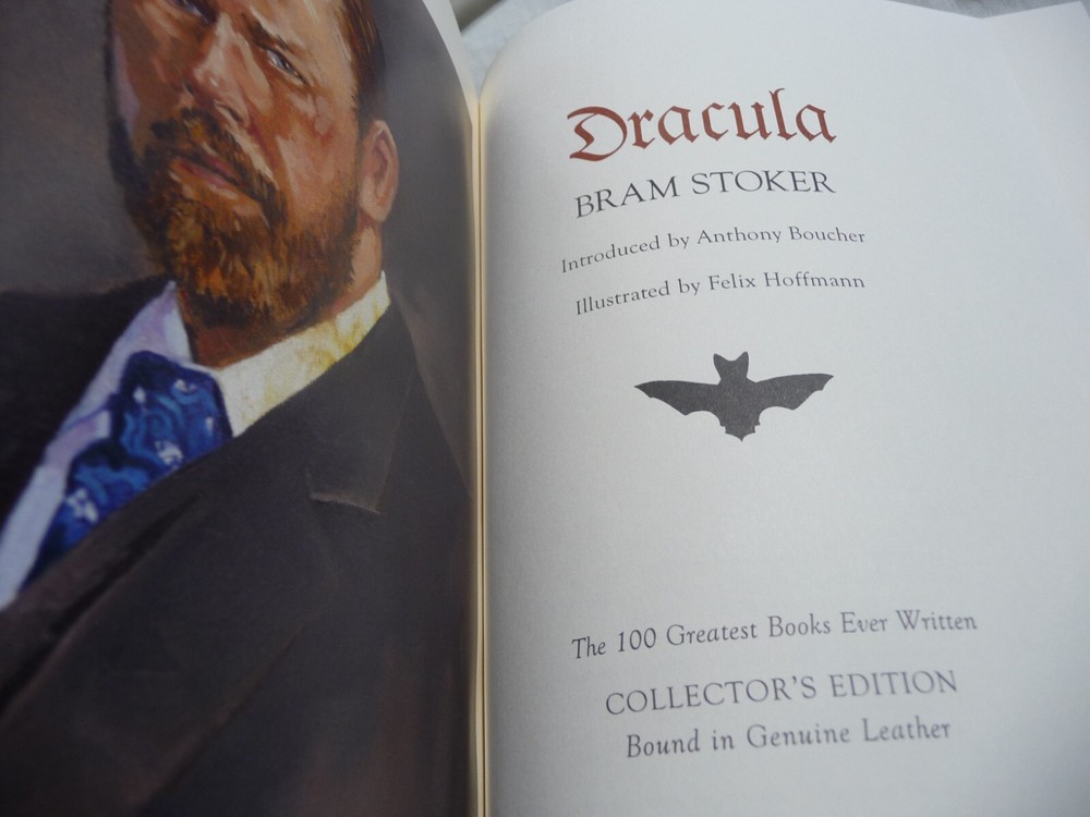 Dracula by Bram Stoker, illustrated by Felix Hoffmann. Published by Easton Press, circa 2005. One of the 100 Greatest books ever written, Collector's edition. Full leather, gold decorations.Silk end papers and silk book mark. Condition: a very small minor scuff to the gold gilt at the top of the text block, otherwise in mint un-read condition. Please excuse my poor pictures, the book's gold decorations looks much brighter. Includes the original un-used book plate. ------------------------------------- I am also listing another Easton Press edition of this book in a blood red leather edition: to view it also, just click on the "view seller's other listings" above.