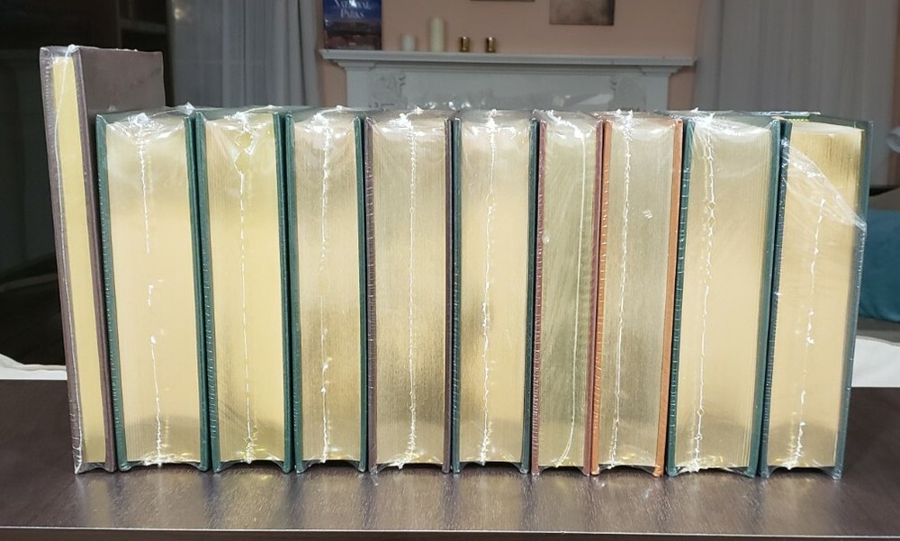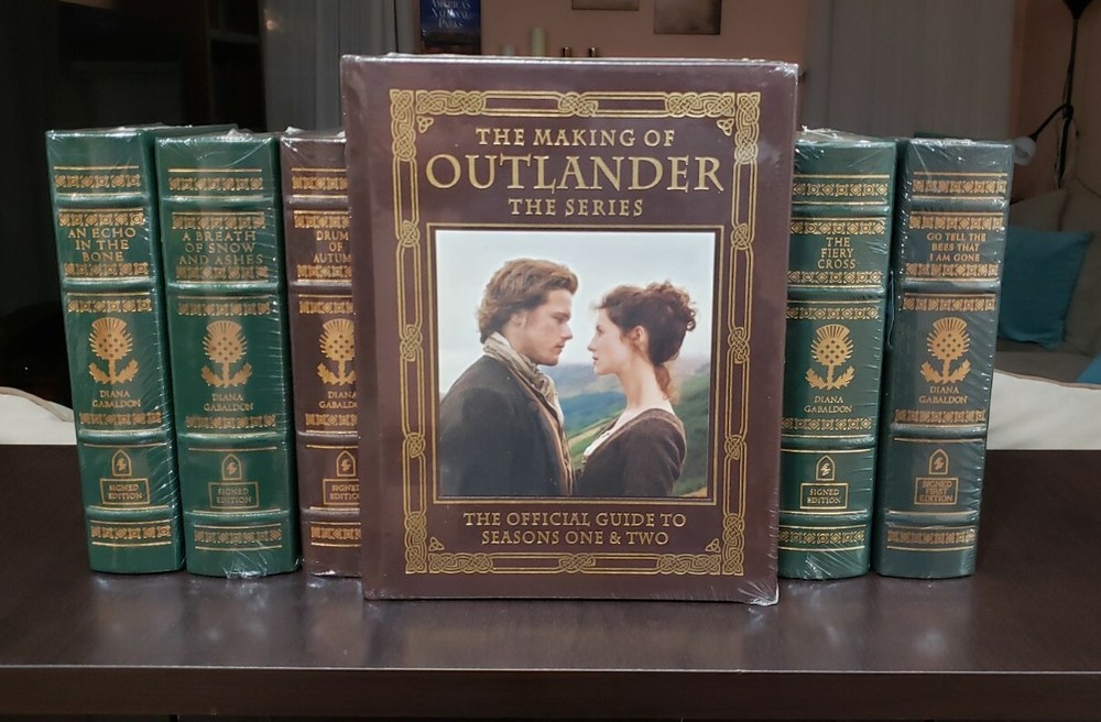 *Outlander, personally signed by Diana Gabaldon. Sealed *Dragonfly in Amber, personally signed by Diana Gabaldon. Sealed *Voyager, personally signed by Diana Gabaldon. Sealed *Drums of Autumn , personally signed by Diana Gabaldon. Sealed *The Fiery Cross, personally signed by Diana Gabaldon. Sealed *A Breath of Snow and Ashes, personally signed by Diana Gabaldon. Sealed *An Echo in the Bone, personally signed by Diana Gabaldon. Sealed *Written in My Own Heart's Blood, personally signed by Diana Gabaldon. Sealed *Go Tell the Bees That I Am Gone, personally signed by Diana Gabaldon. Unsealed but still in mint condition. *Seven Stones to Stand or Fall, personally signed by Diana Gabaldon. Sealed *The Making of Outlander: The Series, The Official Guide to Seasons One & Two. Sealed Fully bound in genuine leather. 22kt gold deeply inlaid on the "hubbed" spine. Superbly printed on acid-neutral paper that lasts for generations. Sewn pages — not just glued like ordinary books. Handsome moiré endpages and a satin-ribbon page marker. Gilded page ends. Printed and bound in the USA. Imported materials. Rigorous inspection at every stage ensures adherence to our exacting stand
