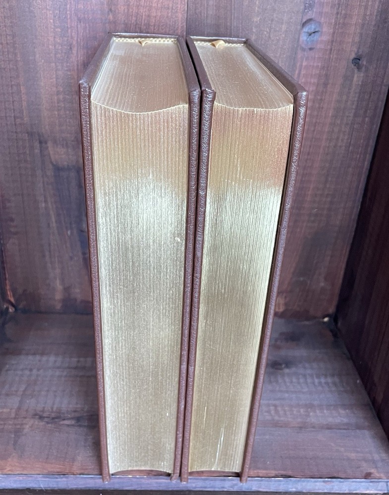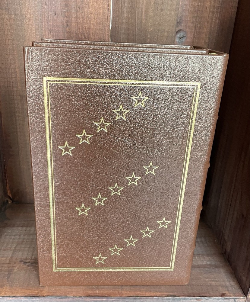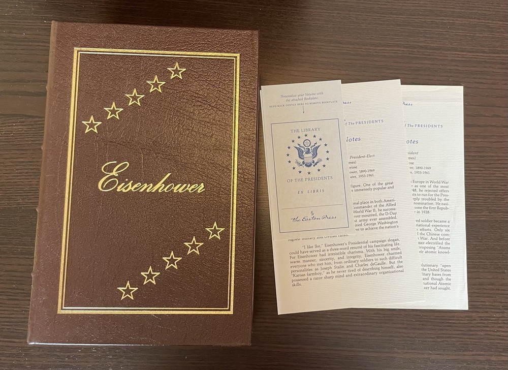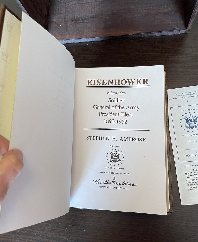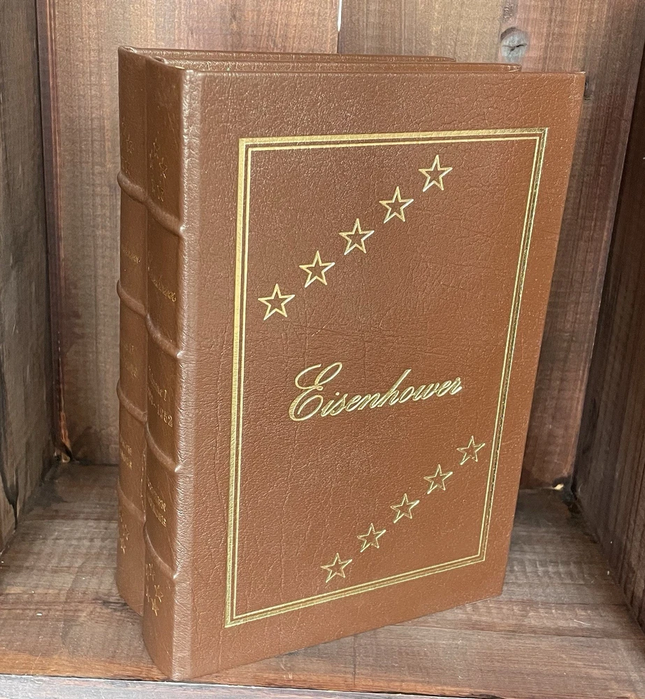 Offering this handsome 2-volume deluxe leather fine binding set of Eisenhower by Stephen E Ambrose. Easton Press, 1987. Volume One title: Soldier General of the Army President Elect 1890-1952 . Volume Two title: The President . Collector's Edition, The Library of the Presidents. Full leather hardcover decorated with 22k gold, and gold page edges, and attached ribbon page marker. Collector's Notes and one blank Easton Press book plate included. Clean and unmarked with light wear. Nice copy!