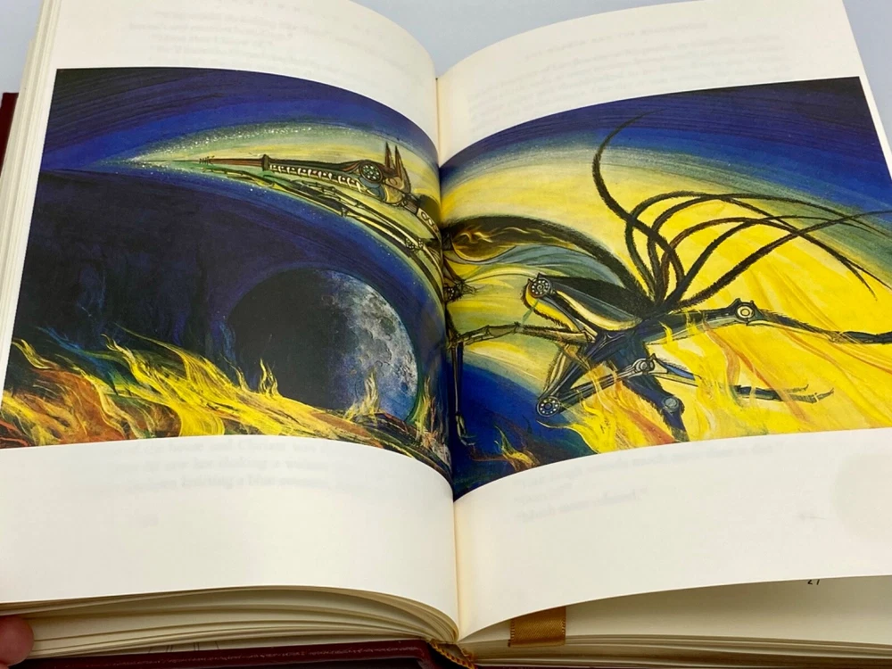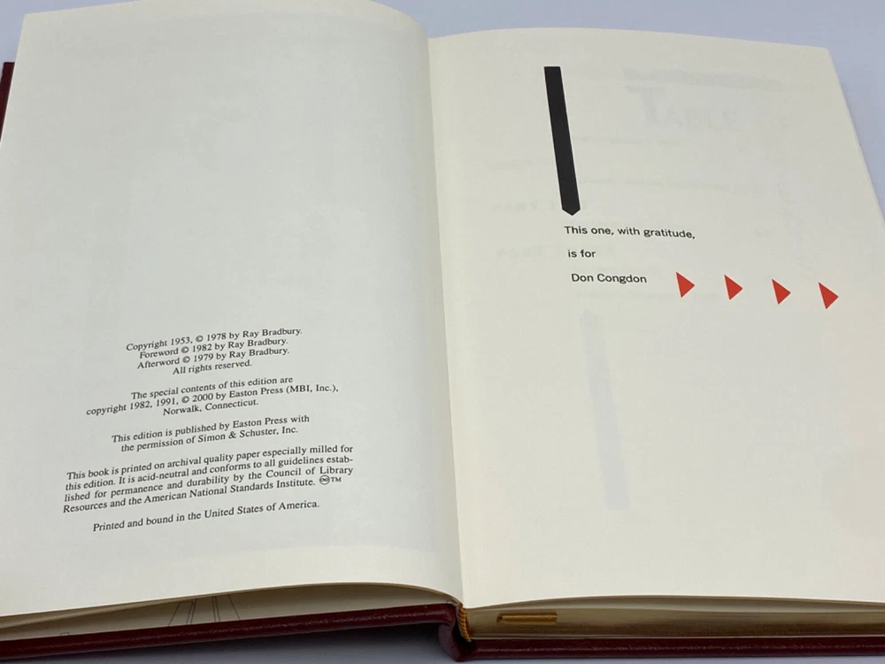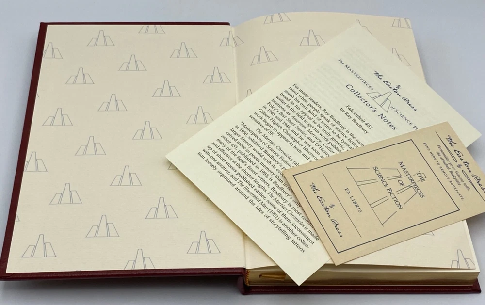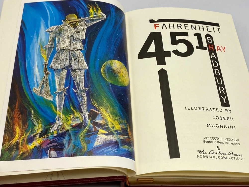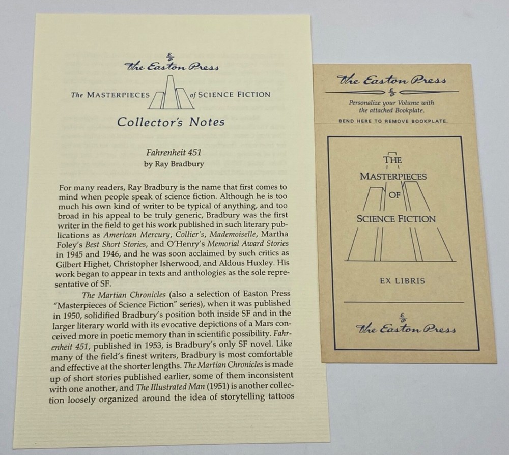MAKES THE PERFECT GIFT FOR ANY FAN OF RAY BRADBURY / VINTAGE SCIENCE FICTION / FANTASY ** PLEASE READ : Mahalo for taking the time to look at our listing. We truly appreciate it. We always do our BEST to give you the most accurate description of these beautiful books. If, however, you have any SPECIFIC questions about the SIZE of the book, NUMBER of pages, TYPE of leather, SMELL or FEEL of the book, PLEASE email us through EBay’s mail system BEFORE you bid, and we will be HAPPY to give you more information. We want you to be completely happy with your purchase and keep you as our customers for years to come!** DESCRIPTION: Easton Press Part of the LONG OUT OF PRINT MASTERPIECES OF SCIENCE FICTION full-leather binding bound edition of FAHRENHEIT 451 by RAY BRADBURY . THIS IS A SCARCE, ONE OF THE MOST DIFFICULT TO FIND VINTAGE HEIRLOOM EASTONS WITH GORGEOUS GILT IMPRESSIONS TO THE BOARDS AND SPINE with INCREDIBLE FULL COLOR ILLUSTRATIONS by JOSEPH MUGNAINI . IT IS ONE OF THE MOST HIGHLY-PRIZED & MOST BEAUTIFUL EDITIONS OF THIS BRADBURY CLASSICS YOU CAN FIND. ORIGINAL COLLECTOR’S NOTES & UNUSED, UNATTACHED BOOKPLATE ARE INCLUDED. 🍍 NOT INCLUDED… 😃 ABOUT THE BOOK: Sixty-eight years after its original publication, Ray Bradbury’s internationally acclaimed novel Fahrenheit 451 stands as a classic of world literature set in a bleak, dystopian future. Today its message has grown more relevant than ever before. Guy Montag is a fireman. His job is to destroy the most illegal of commodities, the printed book, along with the houses in which they are hidden. Montag never questions the destruction and ruin his actions produce, returning each day to his bland life and wife, Mildred, who spends all day with her television “family.” But when he meets an eccentric young neighbor, Clarisse, who introduces him to a past where people didn’t live in fear and to a present where one sees the world through the ideas in books instead of the mindless chatter of television, Montag begins to question everything he has ever known. CONDITION: Book is in LIKE NEW condition for its age with only one negligible bump to the top back board’s edge (SEE PICS FOR BETTER DETAILS). NO WRITING FROM PREVIOUS, etc. It is a BEAUTIFUL EDITION. SHIPPING: FREE TO US ADDRESSES ONLY. INTERNATIONAL $ based on location. WE SHIP PRIORITY MAIL & PACK VERY WELL. Please check out our other listings of Easton Press, Franklin Library, Limited Editions Club, Heritage Press, Folio Society, International Collectors Library, Heritage Press and First Edition Library editions. WE DO COMBINE SHIPPING IF YOU PURCHASE MORE THAN ONE COPY. Mahalo for looking at our listings! By bidding/purchasing this item, you are helping a very grateful family who sends you our WARMEST ALOHA & MAHALO!
