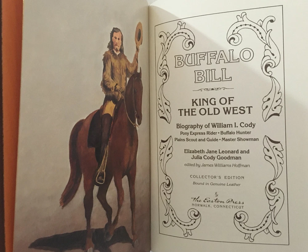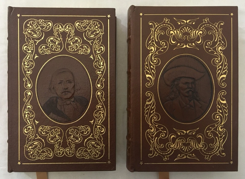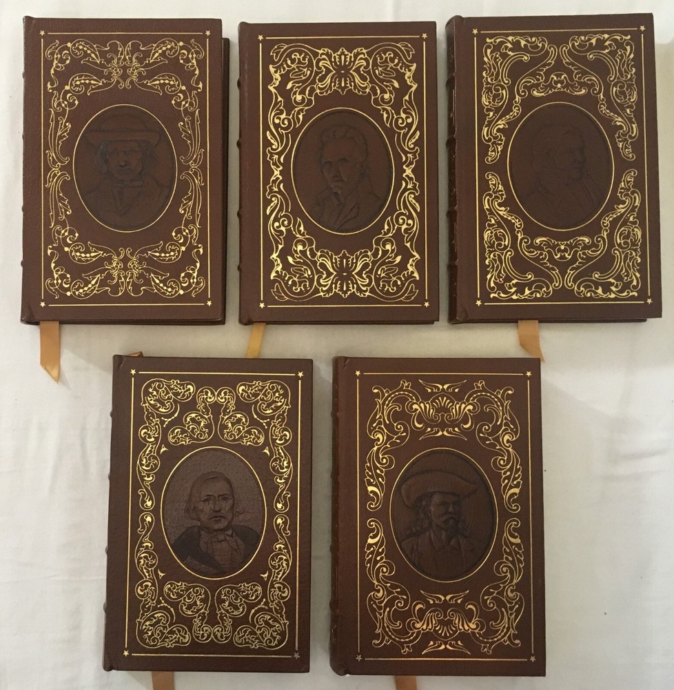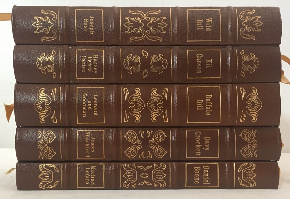 Easton Press, Norwalk CT. 1992 "Heroes Of The Wild West" Leather Bound collector's editions. A complete and matching set of five volumes. Full genuine leather. Each book includes illustrations with frontispiece in color, uniform brown leather bindings, and embossed oval portrait on the front hardcovers. List of titles included in this set: BUFFALO BILL: King of the Old West, Biography of William I. Cody (Pony Express Rider, Buffalo Hunter, Plains Scout and Guide, Master Showman), by Elizabeth Jane Leonard and Julia Cody Goodman, edited by James Williams Hoffman DANIEL BOONE: The Life and Adventures, by Michael A Lofaro DAVY CROCKETT: The Man and the Legend, by James Atkins Shackford, edited by John B Shackford WILD BILL: The Called Him, The Life and Adventures of James Butler Hickok, by Joseph G Rosa KIT CARSON: "Dear Old Kit", The Historical Christopher Carson, with a new edition of the Carson memoirs, by Harvey Lewis Carter Pictures are of actual books