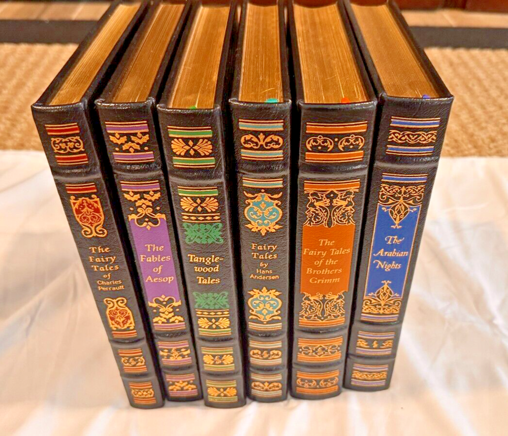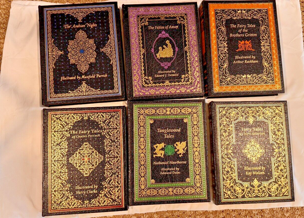These are the Collector's Edition volumes. There is minimal bottom page edge gilt rubbing on the "Brothers Grimm" and slight rubbing to the bottom cover corners. The "Arabian Nights" has a small bump on the lower back cover corner. Also, "Tanglewood Tales" has writing on the upper left of the title page with a faint half round color stain where a name plate may have been attached. Please review the photos. All photos were taken by me of the actual book listed. They are part of the description of the book, so please review carefully. The book is sold As-Is. If you have any questions, please contact me and I will try to answer as best as I am able. I am not a commercial seller. I do not accept returns. If there are any issues, please contact me through eBay. Shipped by USPS Media Mail from a pet and smoke-free home. I am more than happy to combine shipping for multiple purchases. Please do not pay for your order before contacting me so I can send an invoice with the adjusted shipping cost. Easton Press Illustrated Classic Fairy Tales 1 . THE ARABIAN NIGHTS : Their Best-Known Tales, edited by Kate Douglas Wiggin and Nora A. Smith, illustrated by Maxfield Parrish 2. TANGLEWOOD TALES , by Nathaniel Hawthorne, illustrated by Edmund Dulac 3. THE FAIRY TALES of Hans C. Andersen , illustrated by Kay Nielson 4. THE FABLES OF AESOP , illustrated by Edward J. Detmold 5. THE FAIRY TALES of Charles Perrault , illustrated by Harry Clark, introduction by Thomas Bodkin 6. THE FAIRY TALES of Brothers Grimm , illustrated by Arthur Rackham, translated by Mrs. Edgar Lucas I only accept payment through eBay. Thank you very much for looking!