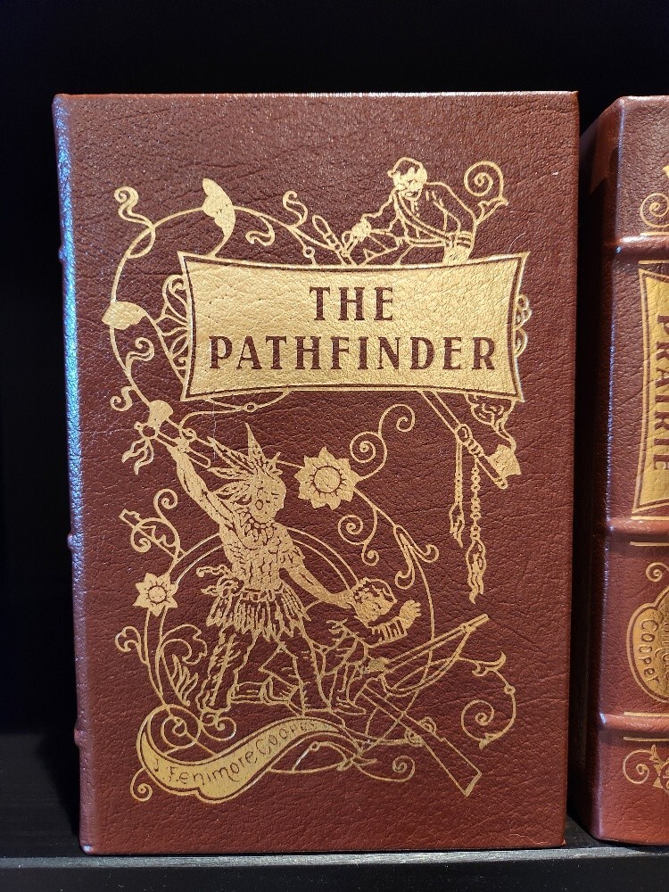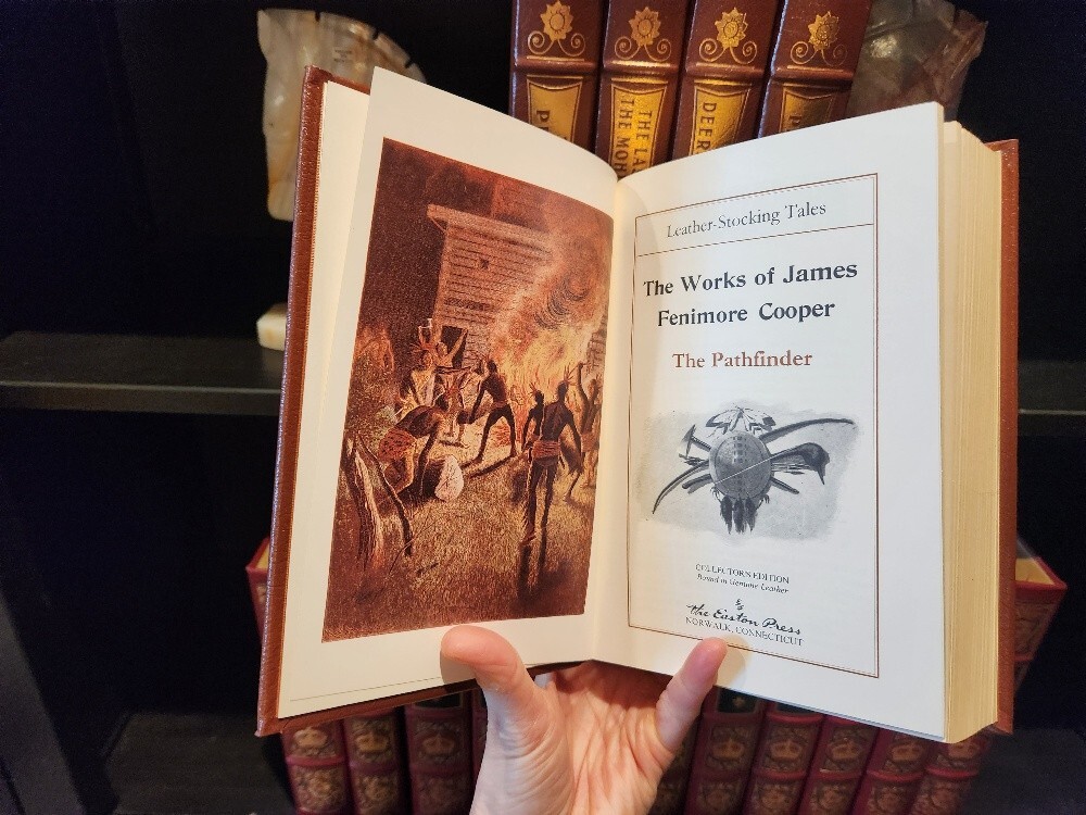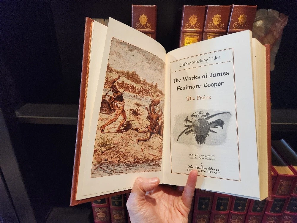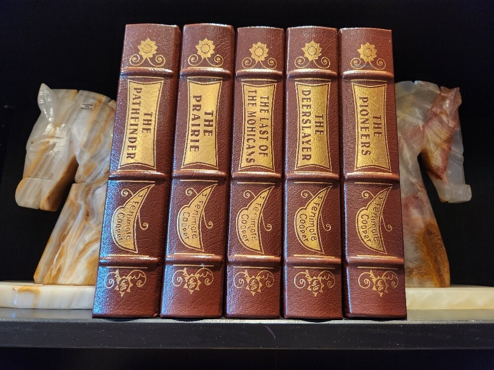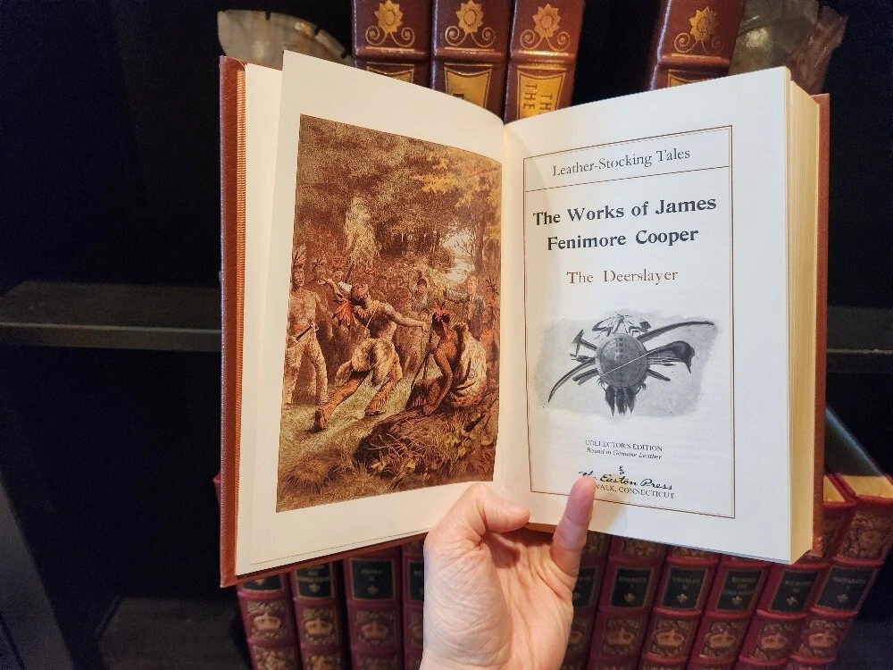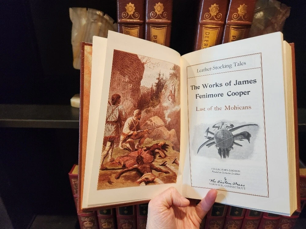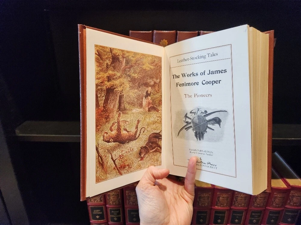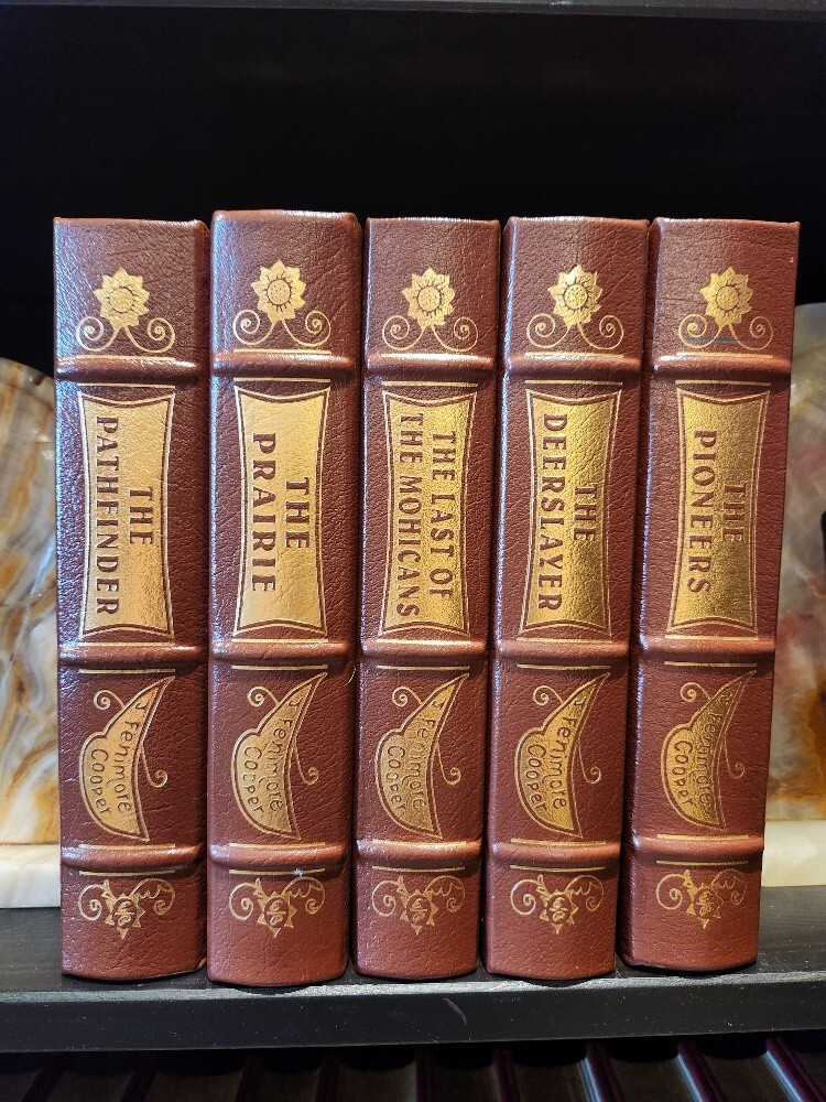 Easton Press James Fenimore Cooper 5-Volume Leather-Bound Set – Collector’s Edition – The Leatherstocking Tales – Decorative Classic Library. Bring the spirit of early America to your library with this stunning 5-volume collector’s set of James Fenimore Cooper’s Leatherstocking Tales, published by Easton Press. Bound in genuine leather with exquisite gold detailing, this set captures the adventurous heart of the American frontier and is a must-have for collectors of classic literature and fine bindings. 📚 Included Titles: The Last of the Mohicans The Deerslayer The Pathfinder The Pioneers The Prairie These timeless novels follow the legendary frontiersman Natty Bumppo through tales of exploration, conflict, and the changing American landscape. ✨ Features: Bound in full premium leather 22kt gold stamped cover and spine designs Gilded page edges Satin ribbon bookmarks Archival-quality acid-neutral paper Smyth-sewn binding for durability Moiré silk endpapers A beautiful and cohesive set, perfect for display, reading, or gifting to the literature lover or American history enthusiast in your life. 📦 Condition: Excellent vintage condition. No writing or markings. Light shelf wear to gilt edges on select volumes. Tight bindings and clean pages throughout. 📏 Dimensions: Each volume approx. 9.5” H × 6.5” W × 1.5” D Total shelf length: approx. 7.5 inches ** It is my pleasure to include free shipping in the US! **Free shipping is only available to US residents only **