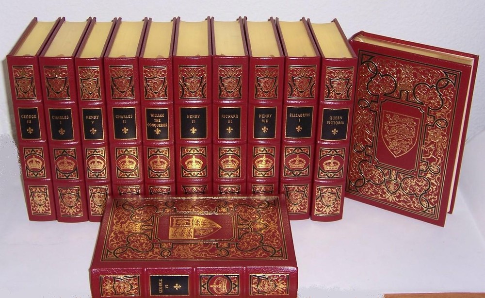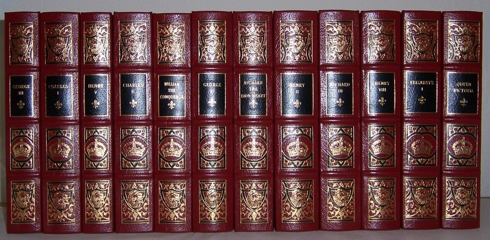 Kings and Queens of England series of the Easton Press. KINGS AND QUEENS OF ENGLAND For sale is a complete Easton Press set in 12 volumes deep carmine red leather with an original stylized design embossed in gold and black frontispiece in color with the king's or queen's portrait, exclusive illustrations and precious plates the coat-of-arms of that monarch (or that monarch's house) engraved on the front board BOUND IN GENUINE LEATHER Copyright by Easton Press Hubbed Spine, Bound in Premium Full Leather Distinctive Cover Design, Profusely Illustrated Moire Endleaves, Satin Ribbon Page Marker Accented in Real 22KT Gold, Gilt Page Edges Smyth-sewn Pages for Strength and Durability Long-lasting, High Quality Acid-neutral Paper LIST OF TITLES: complete in twelve volumes: 1. William the Conqueror, David Douglas. 2. Henry II, W. L. Warren. 3. Richard the Lionheart, Kate Norgate. 4. Henry V, Desmond Seward. 5. Richard III, Paul Kendall. 6. Henry VIII, J. J. Scarisbrick. 7. Elizabeth I, Anne Somerset. 8. Charles I, Pauline Gregg. 9. Charles II, Antonia Fraser. 10. George III, John Brooke. 11. Queen Victoria, Elizabeth Longford. 12. George VI, Sarah Bradford. CONDITION DESCRIPTION: this set is in like new and unread condition: with attached blank bookplate, clean inside page, and binding is tight, beautiful bright endpapers and satin ribbon page marker. SHIPPING / HANDLING: The book will be shipped via USPS media mail with delivery confirmation, special care will be taken during packing to ensure you receive the books as described.