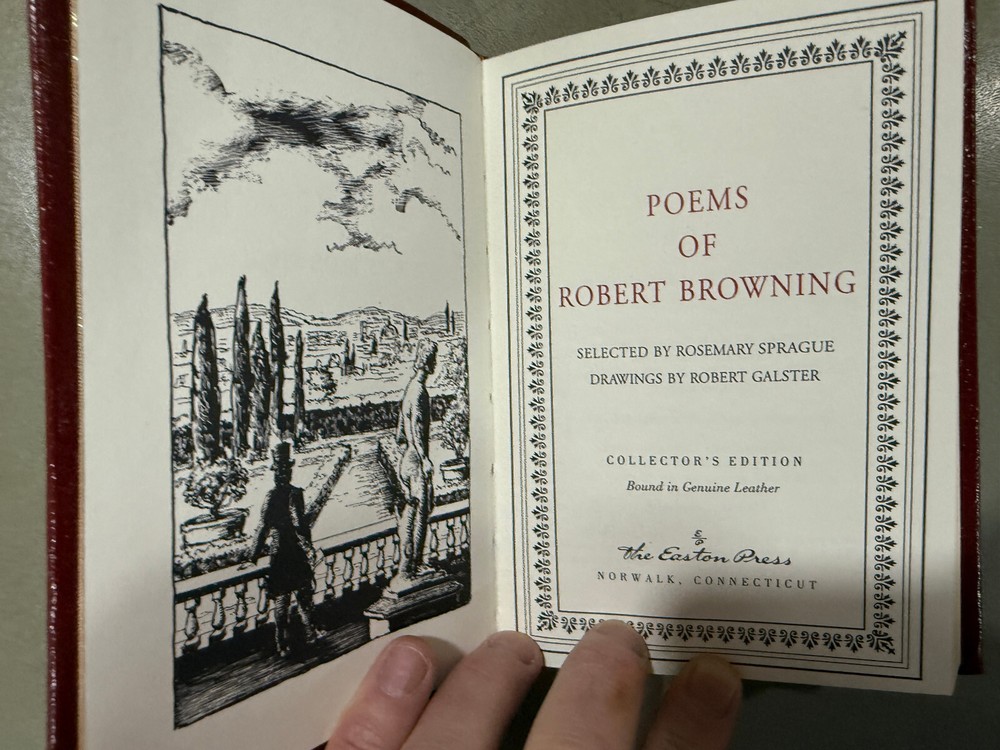 This Easton Press edition of *Poems of Robert Browning* is absolutely stunning! The leather binding is pristine, with that rich, classic feel, and the pages are crisp and clean. The seller clearly takes great care—my book arrived in flawless condition, freshly cleaned and smelling wonderful. Plus, the shipping was fast, and the return policy is worry-free. Perfect for collectors or anyone who loves beautifully crafted poetry books. Highly recommend this seller—they have an amazing selection!