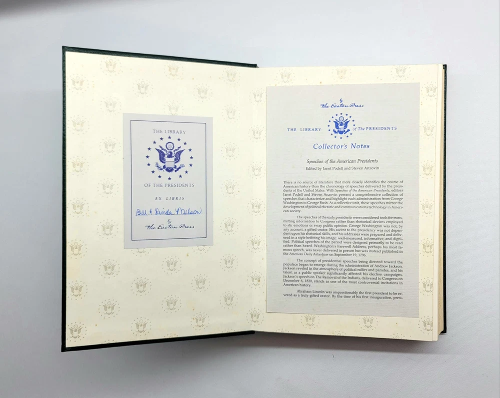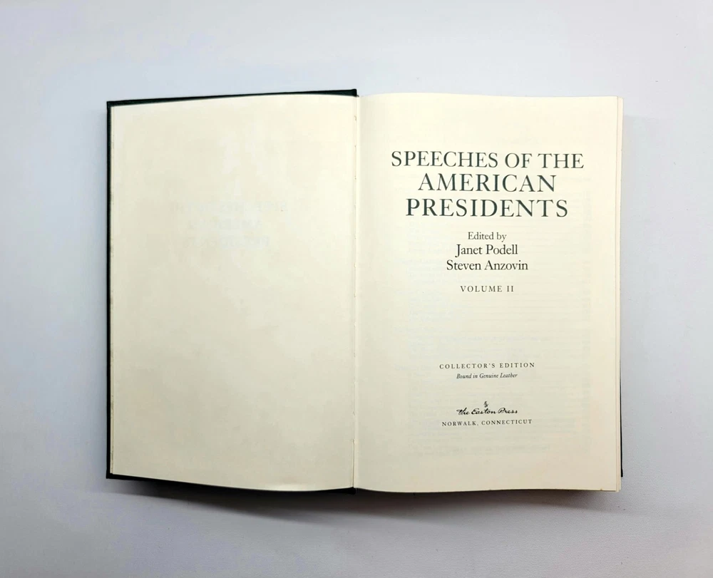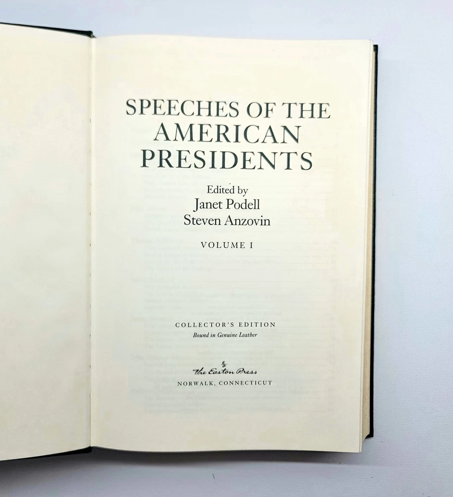Easton Press SPEECHES OF THE AMERICAN PRESIDENTS 2 Vols Leather Podell & Anzovin Good condition. Books have some minor shelf wear with scuffing on the gilt page edges and the gilding on book covers. Some foxing as shown. Please utilize pictures to determine the exact condition of each item. If you have a question, please send a message, and I will answer you promptly. Thanks for looking.