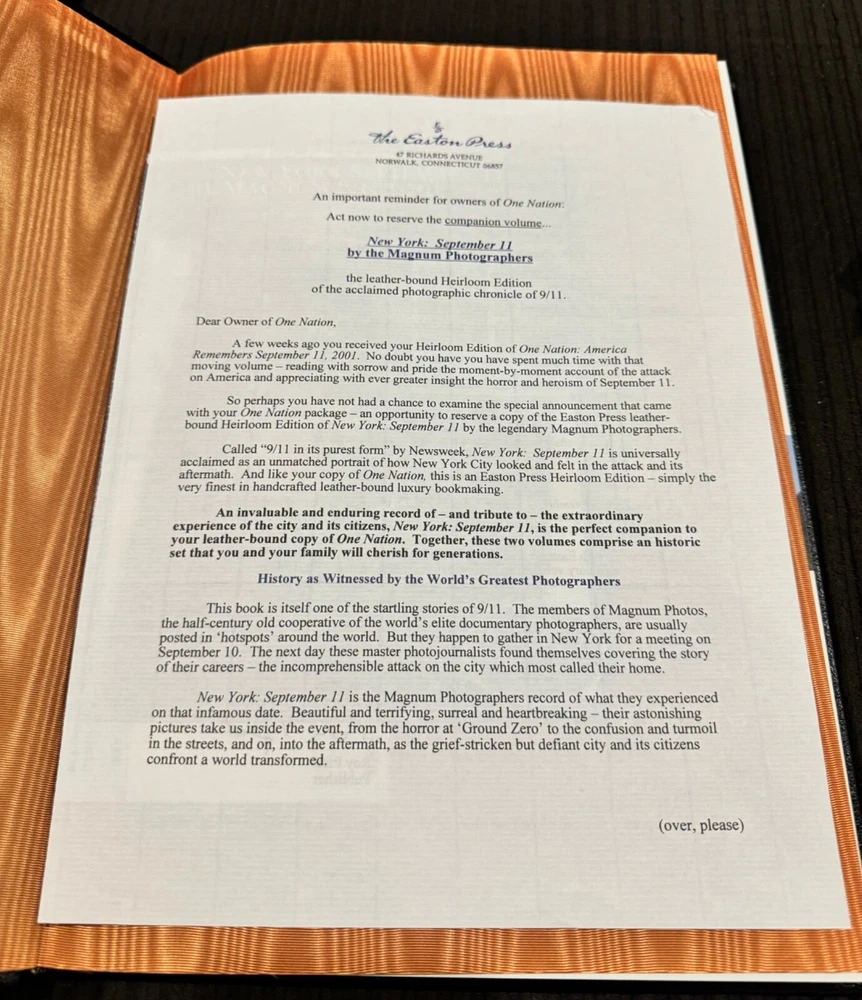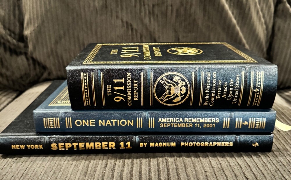 Set of 3 Easton Press leather bound books about September 11 (9/11) in excellent condition with minimal signs of use. The 9/11 Commission Report One Nation: America Remembers September 11, 2001 New York: September 11 by Magnum Photographers