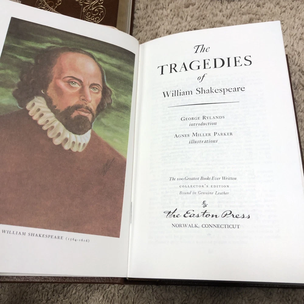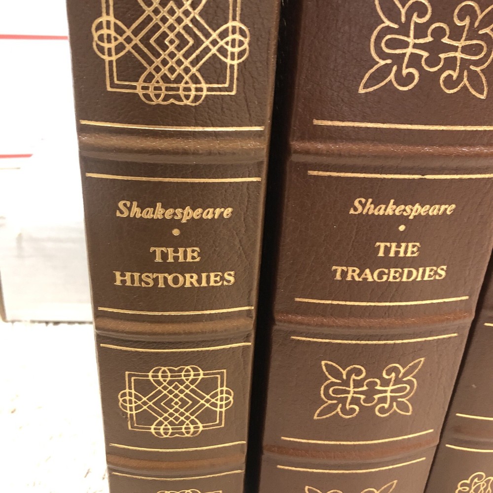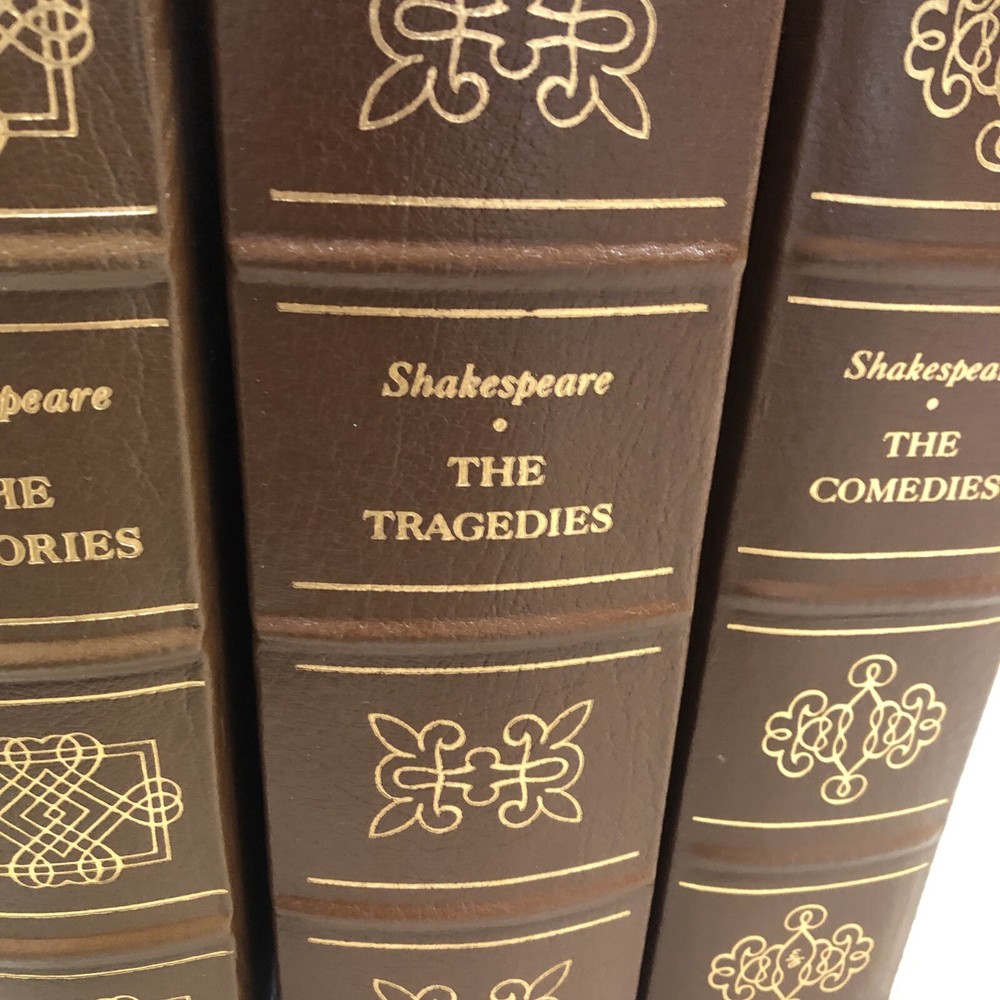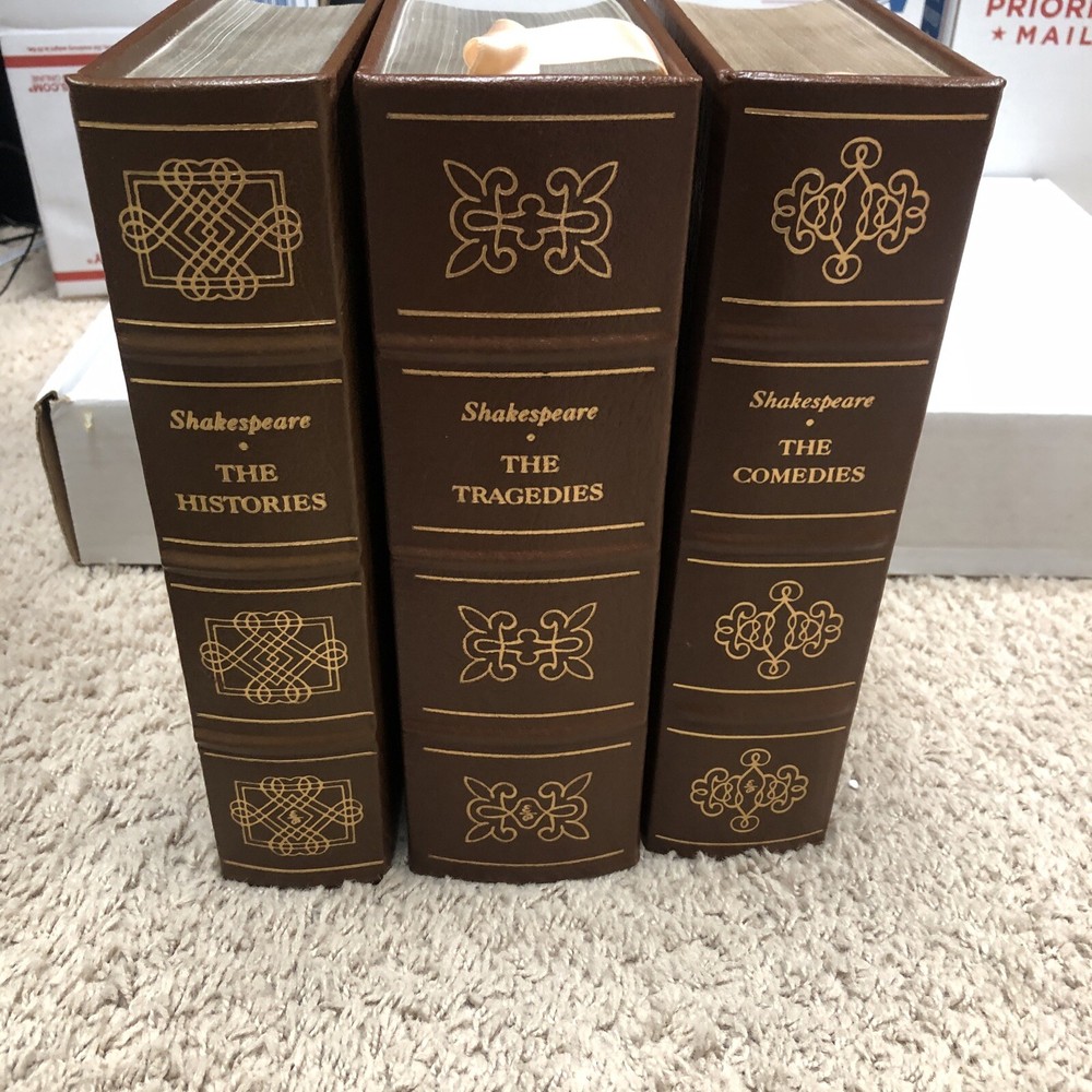 Delve into the world of literature with the Easton Press Shakespeare Complete Set, "100 Greatest" Leather Collector's Edition. This exquisite collection showcases the works of William Shakespeare, presented in a luxurious leather-bound format that exudes classic elegance. Each volume is meticulously crafted, inviting readers to immerse themselves in the richness of English literature. Published by Easton Press, this set is a testament to the timeless appeal of Shakespeare's classics, offering both a visual and literary feast. The books are adorned with illustrations that bring the stories to life, enhancing the reading experience. Whether for a seasoned bibliophile or a newcomer to the classics, this collector's edition is a proud addition to any library. On a scale of one to ten A “10” All three volumes look like they were never read Norwalk Connecticut