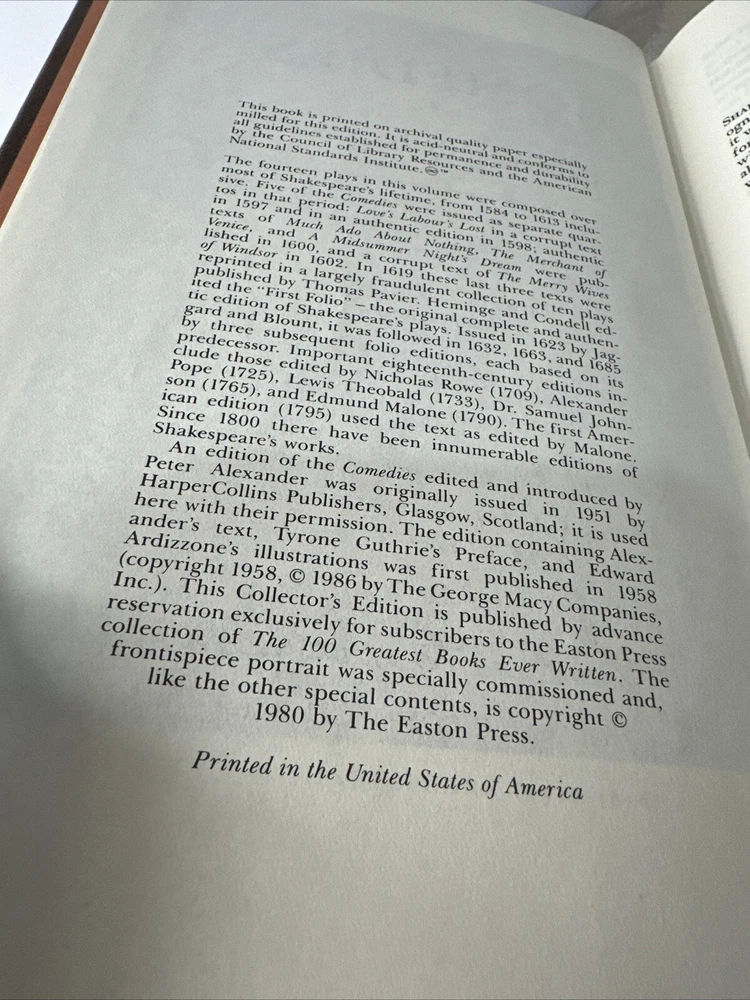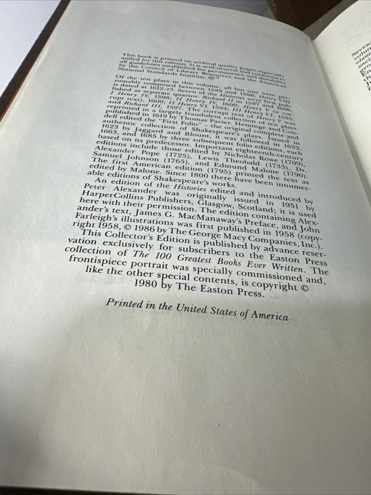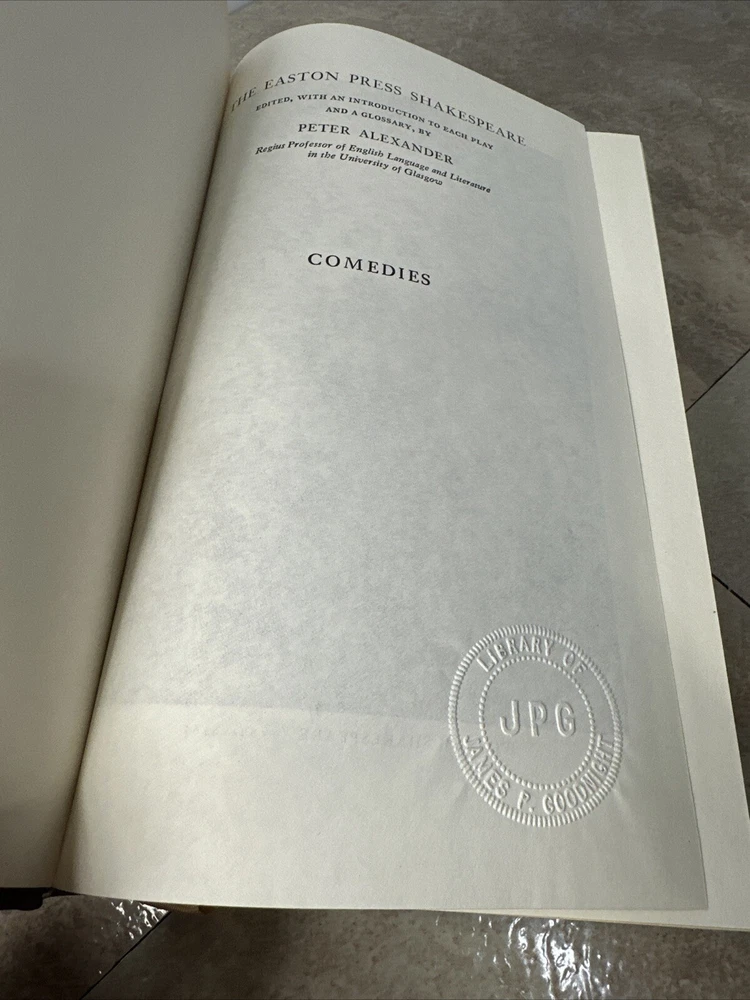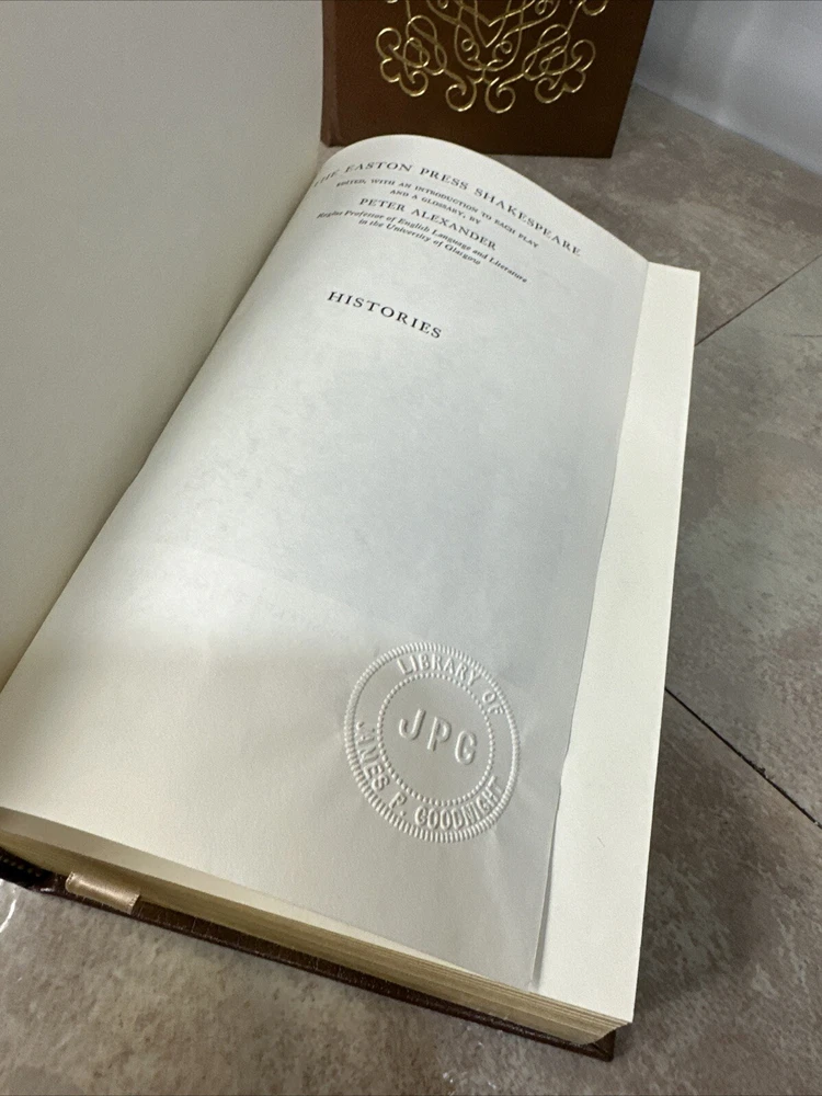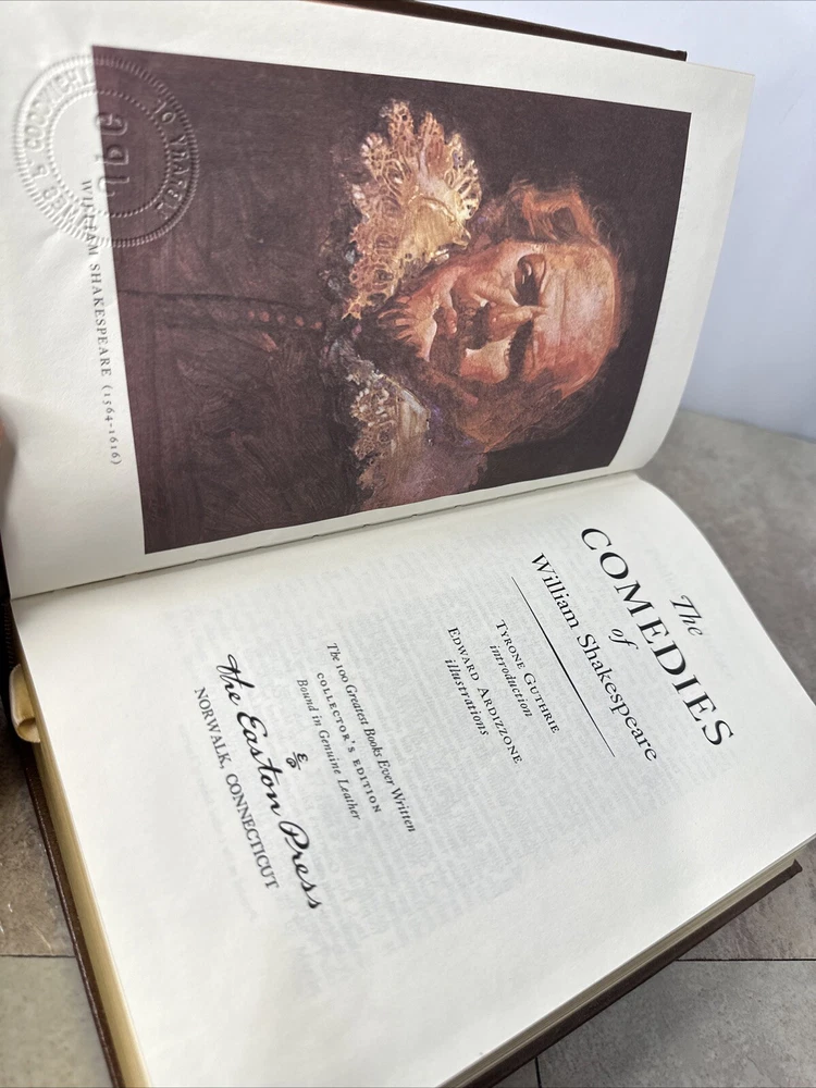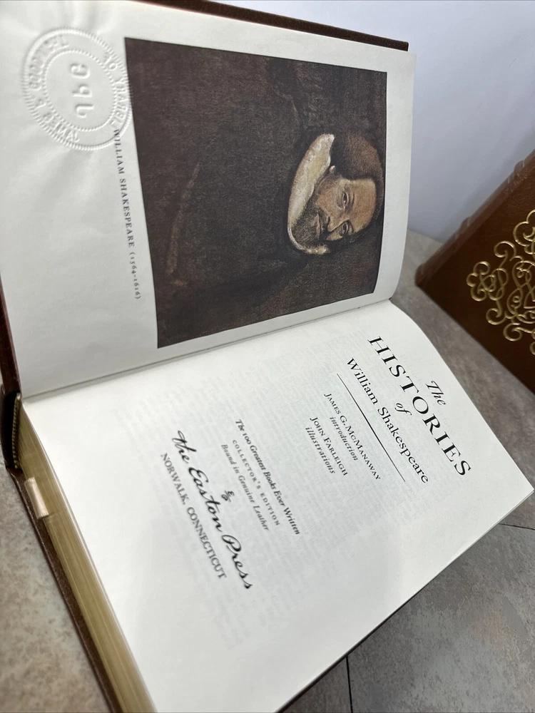 Easton Press Shakespeare The Histories Comedies 2-Book Set 100 GREATEST THIS IS A GREAT DUO!! PART OF THE 100 GREATEST BOOKS EVER WRITTEN SERIES 2 books THE COMEDIES: EXCELLENT CONDITION- NO ISSUES THE HISTORIES: GREAT CONDITION EXCEPT FOR COVER HAS RESIDUE FROM SOMETHING STICKING TO FACE- NOT TOO BAD BUT NOTICEABLE PLEASE SEE PICS EACH EMBOSSED STAMPED “LIBRARY OF JAMES P GOODNIGHT JPG” on first page THANKS FOR YOUR INTEREST