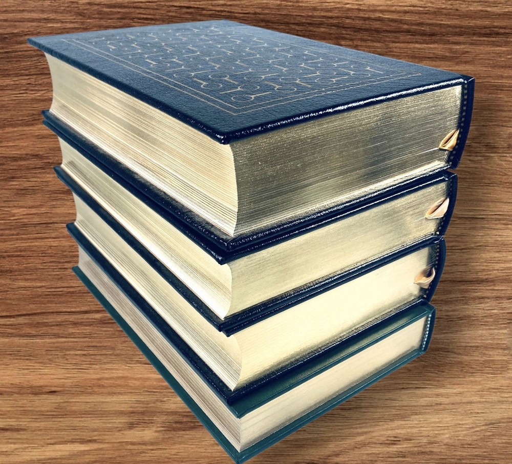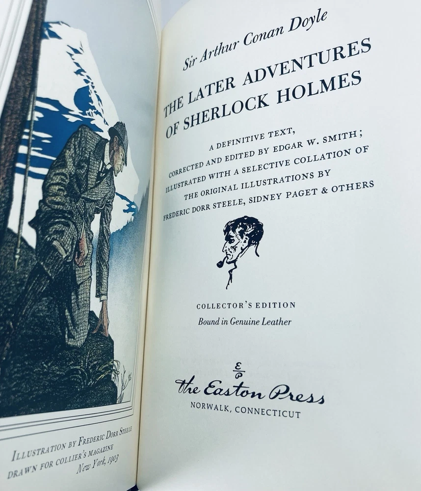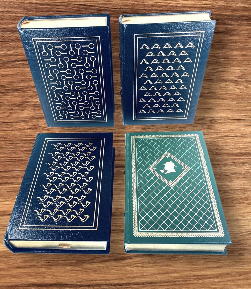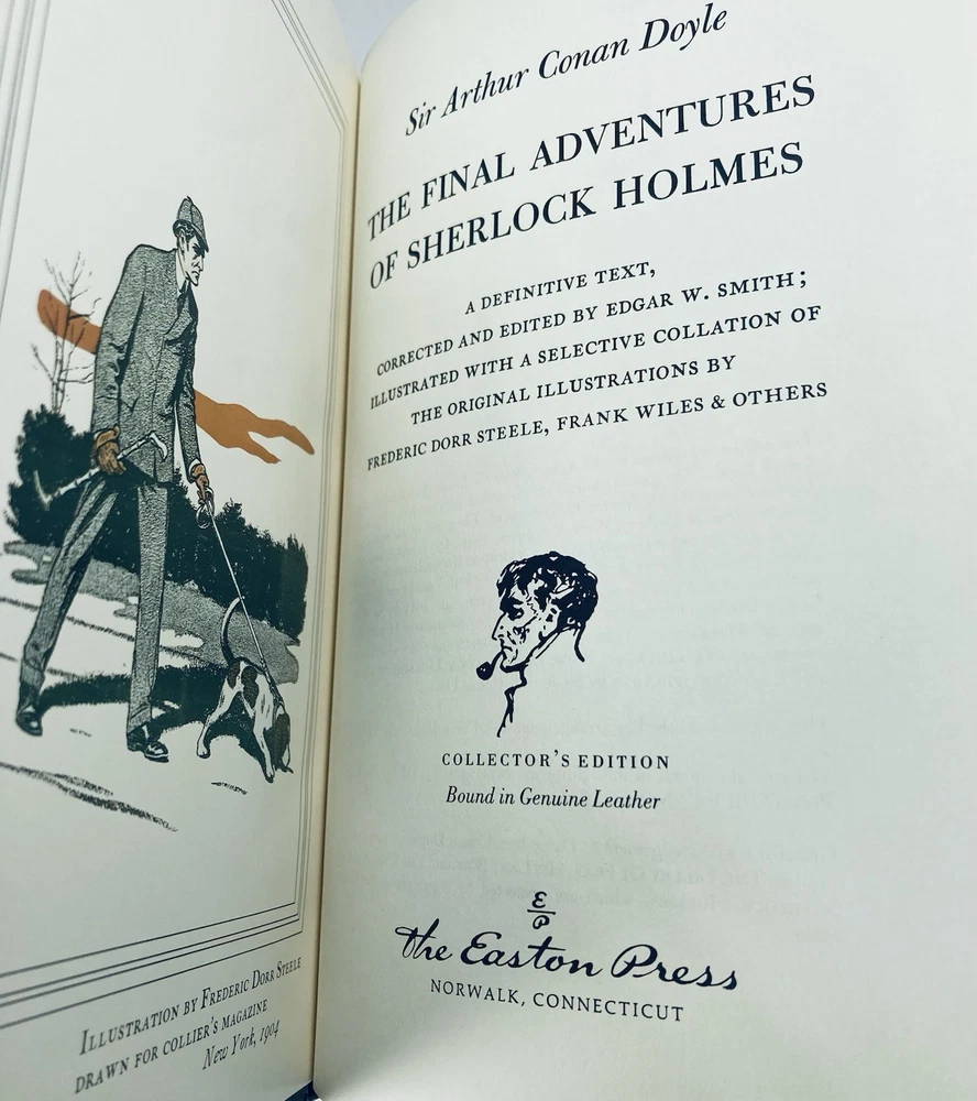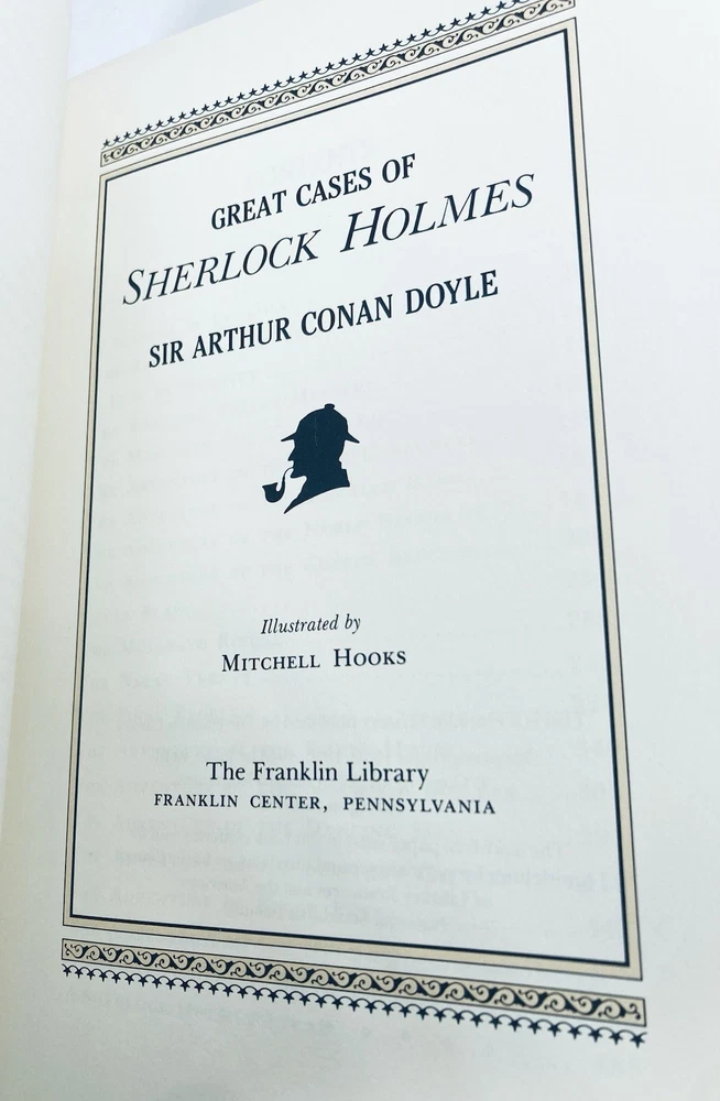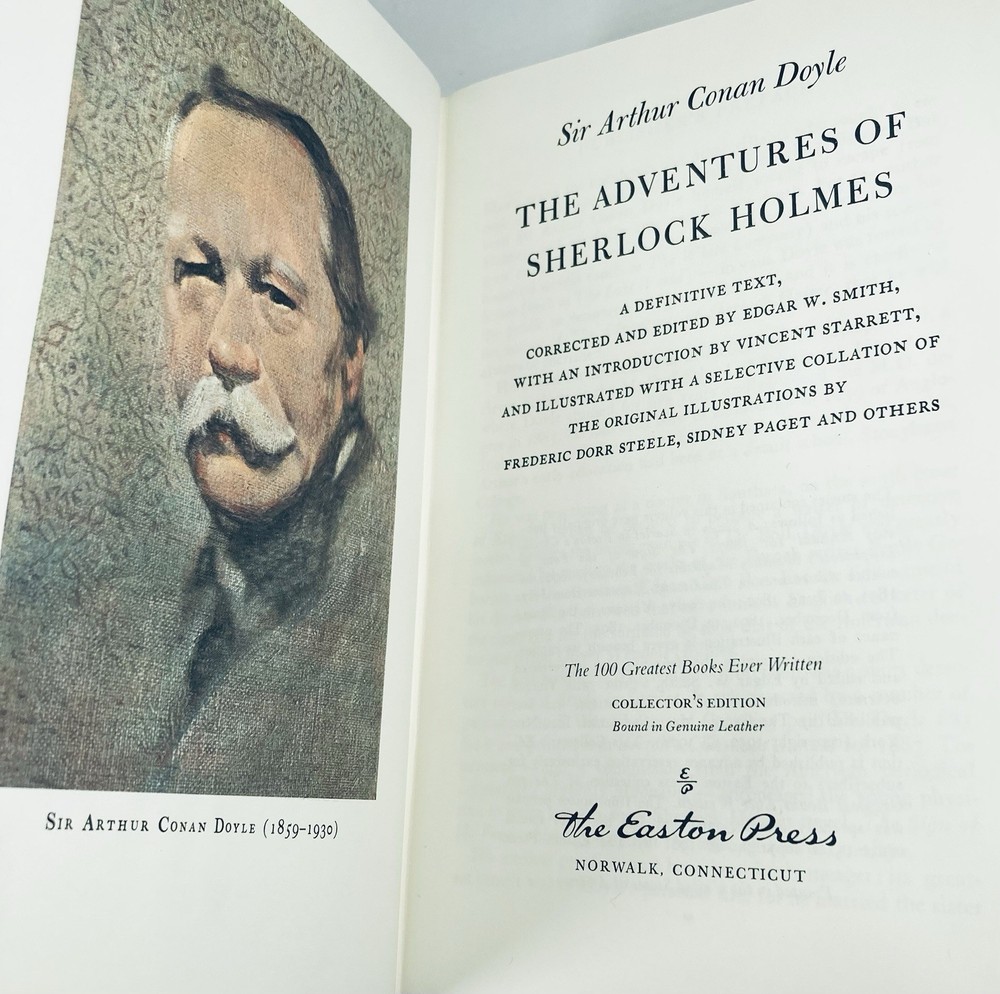 Easton Press Sherlock Holmes Leather 3 Vol Set + Franklin Library Great Cases The complete three volume trilogy set from Easton Press is enhanced with a bonus, the Franklin Library's Great Cases of Sherlock Holmes. These leather bound copies are brand new, and will be securely packaged to ensure delivery in pristine condition. One title (Adventures) is from the Easton Press collection of The 100 Greatest Books Ever Written. The other 2 in the EP trilogy (Later adventures and Final Adventures) are exclusive collectors editions originally available through advance reservation only to subscribers to the Easton Press. The Franklin Library book, Great Cases of Sherlock Holmes was published in 1987