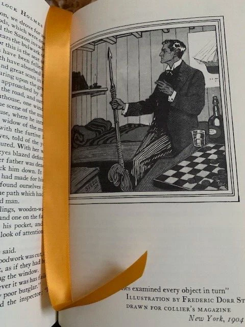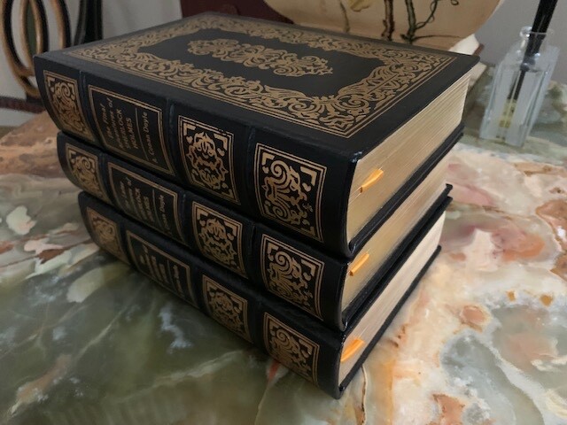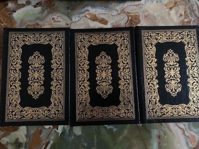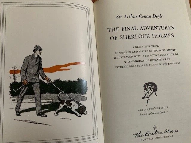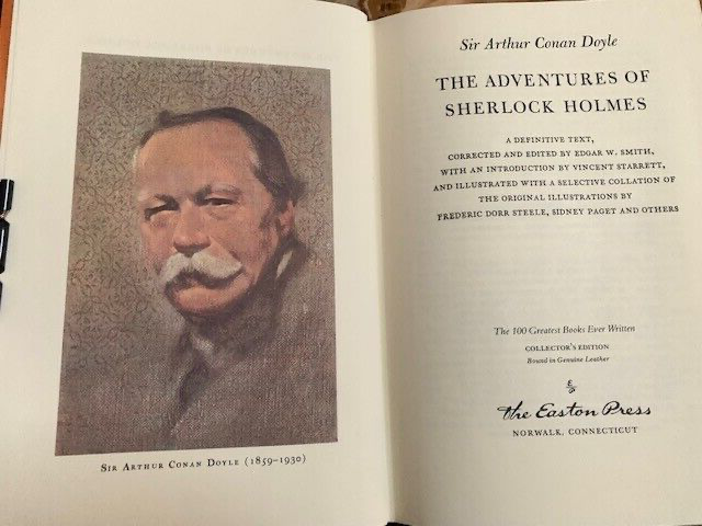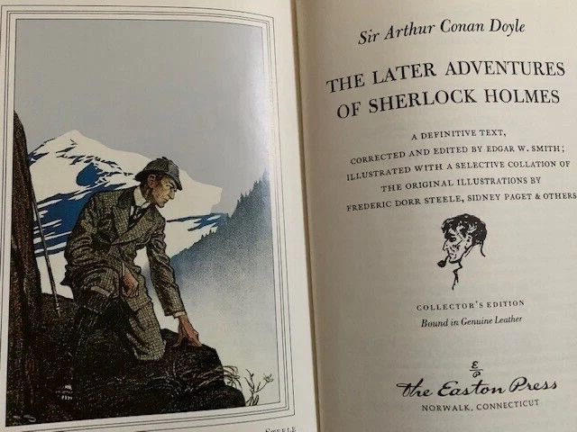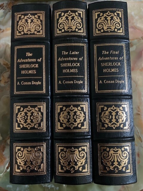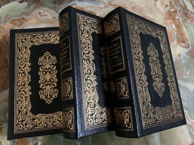 COMPLETE SHERLOCK HOLMES, by Conan Doyle, 3 VOLUMES, Published by The Easton Press, 1995 Size of the book: 9X6.5 inch The Adventures of Sherlock Holmes, Pages 1-764 The Later Adventures of Sherlock Holmes, Pages 765-1222 The Final Adventure of Sherlock Holmes, Pages 1223-1777 Bound in fine genuine leather with 22 karat gold decorations; all page edges gilded with 22K gold; title of gold in raised spine with hubs; sewn-in satin ribbon bookmarks; archival quality acid-free paper; silk moire fabric front and back endpapers; thread-sewn pages for strength and durability. Weight of the 3 volumes: 8 lb,1 oz. Will be shipped via USPS Media Mail with tracking number.