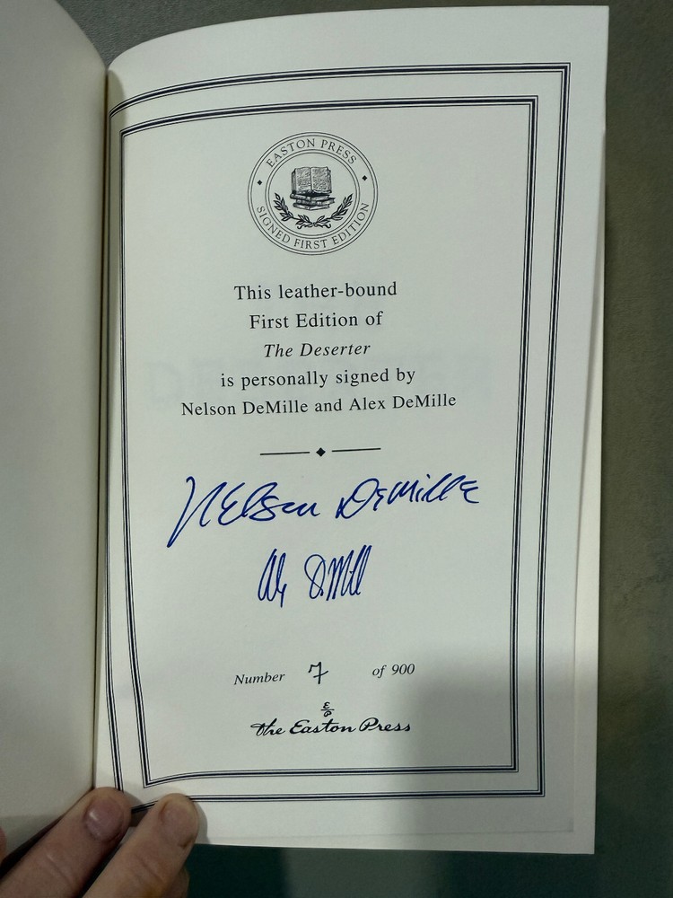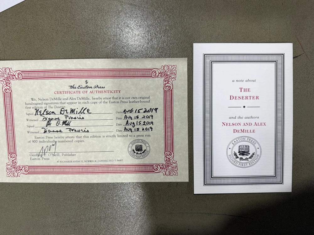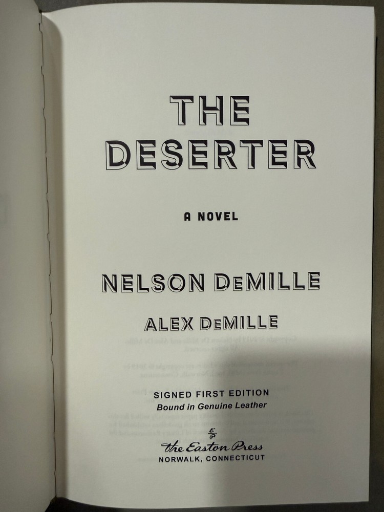 The Deserter by Nelson Demille Signed Easton Press First Editions Excellent Condition with Certificate of Authenticity! New Books get listed daily !!! 100s of Easton Press and Franklin Library books available!! All books get cleaned with a leather cleaner to remove any dust, odor and restore the beauty of leather!! Combined Shipping Discount: USA buyers - every book $1 off International combined shipping: 1 or 2 books - $45 3 or 4 books - $75 5 + books $17 per book 10+ books $13 per book WE SHIP DAILY!! RETURNS: Hassle-Free 30-days return policy and we pay for a return !! Check our Inventory (Link to eBay Store): http://stores.ebay.com/EastonFranklinBooks