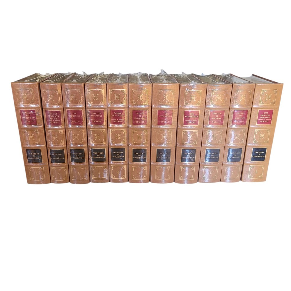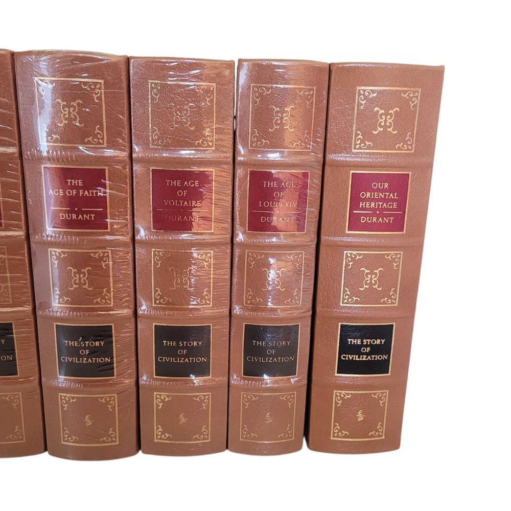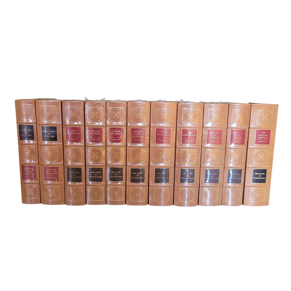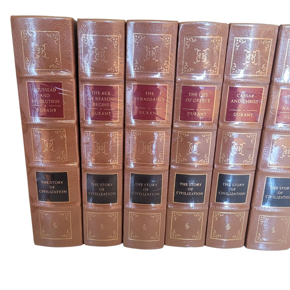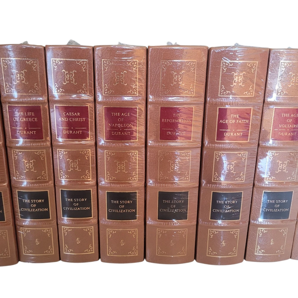 Easton Press The Story of Civilization - Will & Ariel Durant - 11 Vol Set - 10/11 Sealed 📄 Description: This beautifully bound 11-volume set of The Story of Civilization by Will and Ariel Durant was published by Easton Press , known for their high-quality collector’s editions. Bound in genuine leather with gilt accents and satin ribbon markers, these books are heirloom-quality—perfect for the scholar, collector, or classic library builder. 10 of the 11 volumes are still sealed in the original shrink wrap , making this an especially rare offering in this condition. 📚 Included Titles: The Age of Napoleon – Sealed The Life of Greece – Sealed Caesar and Christ – Sealed The Age of Faith – Sealed The Renaissance – Sealed The Reformation – Sealed The Age of Reason Begins – Sealed The Age of Louis XIV – Sealed The Age of Voltaire – Sealed Rousseau and Revolution – Sealed Our Oriental Heritage – Unsealed 🧩 Features: Publisher: Easton Press Edition: Collector’s Leather-Bound Gilded page edges and spine detailing Satin ribbon markers Smyth-sewn bindings Nearly all volumes sealed in shrink wrap One unsealed ( Our Oriental Heritage ), otherwise like new 🛠️ Condition: 10 of 11 volumes factory sealed 1 volume unsealed but in excellent complete condition Stored in a clean, smoke-free environment 📦 Free Shipping & Seller Confidence: Trusted seller with nearly 3,000 positive feedback Fast, careful, and free one-business-day shipping Quick responses and hassle-free service every time Double boxed for safe shipping 🆔 SKU: LR1