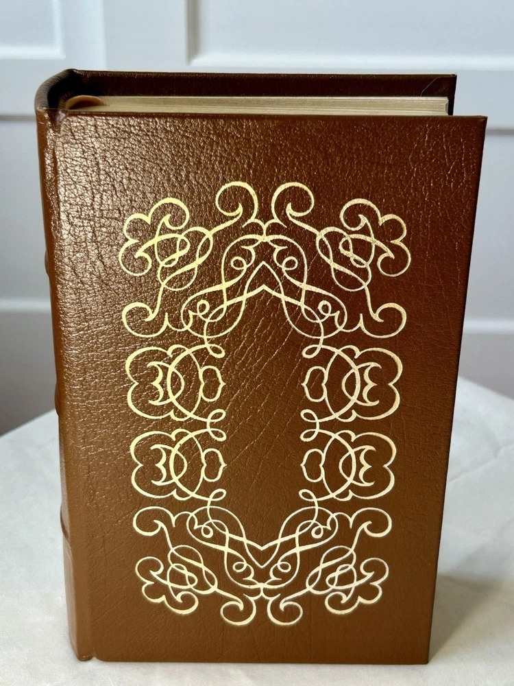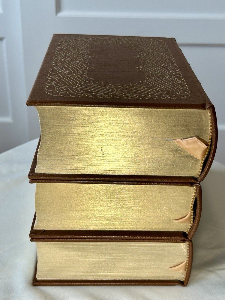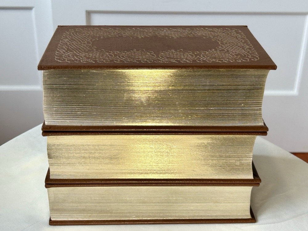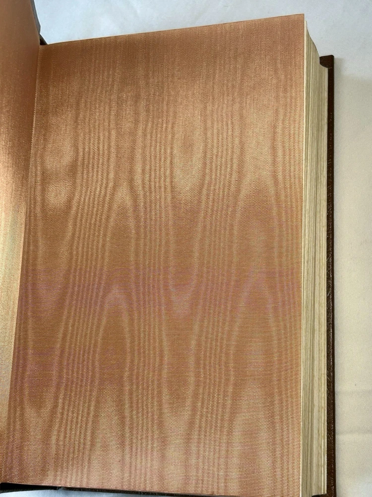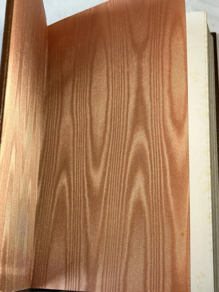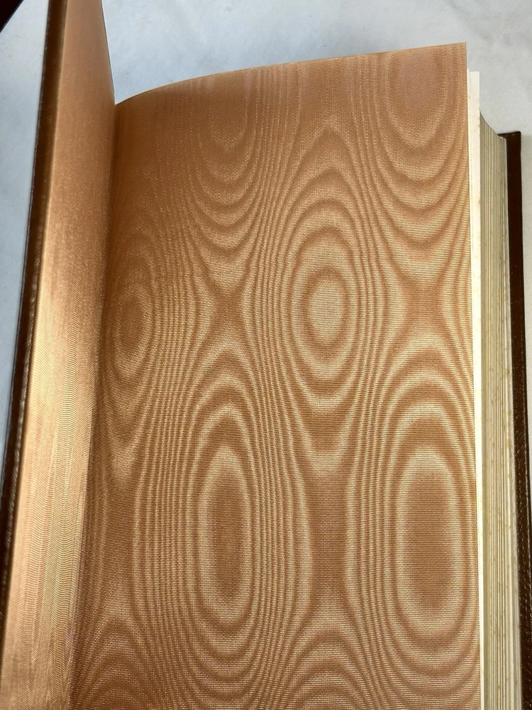 Leather bound, gold foil embossing on front, back and spine, bound in silk ribbon bookmark, satin moire endsheets, hubbed spine, archival paper, gilded edging and a durable sewn binding. Never read and in very good condition. Covers, leather, gilded edges & foil are all in good condition. No affixed bookplates or other personalizations. No marks, writing or other defects. Your books will be individually bubble wrapped and packed securely in a box to arrive to you in perfect condition.