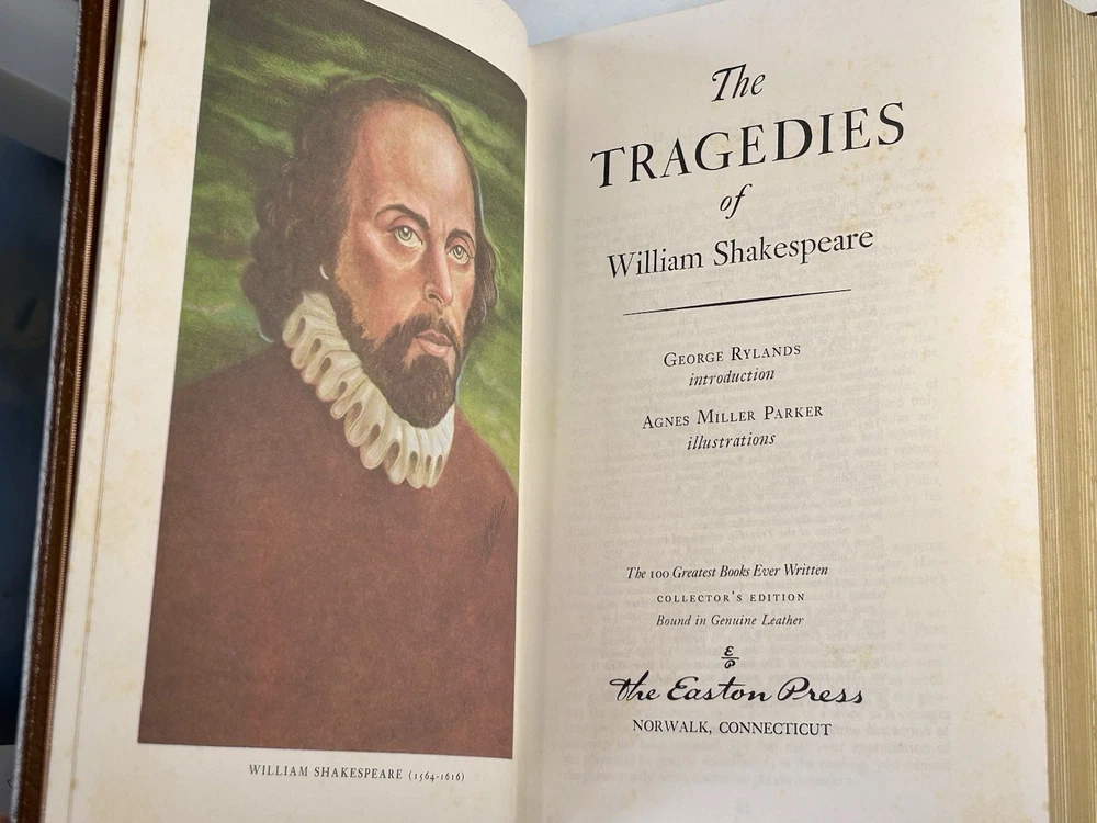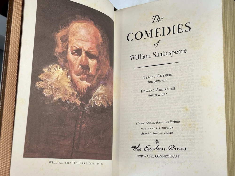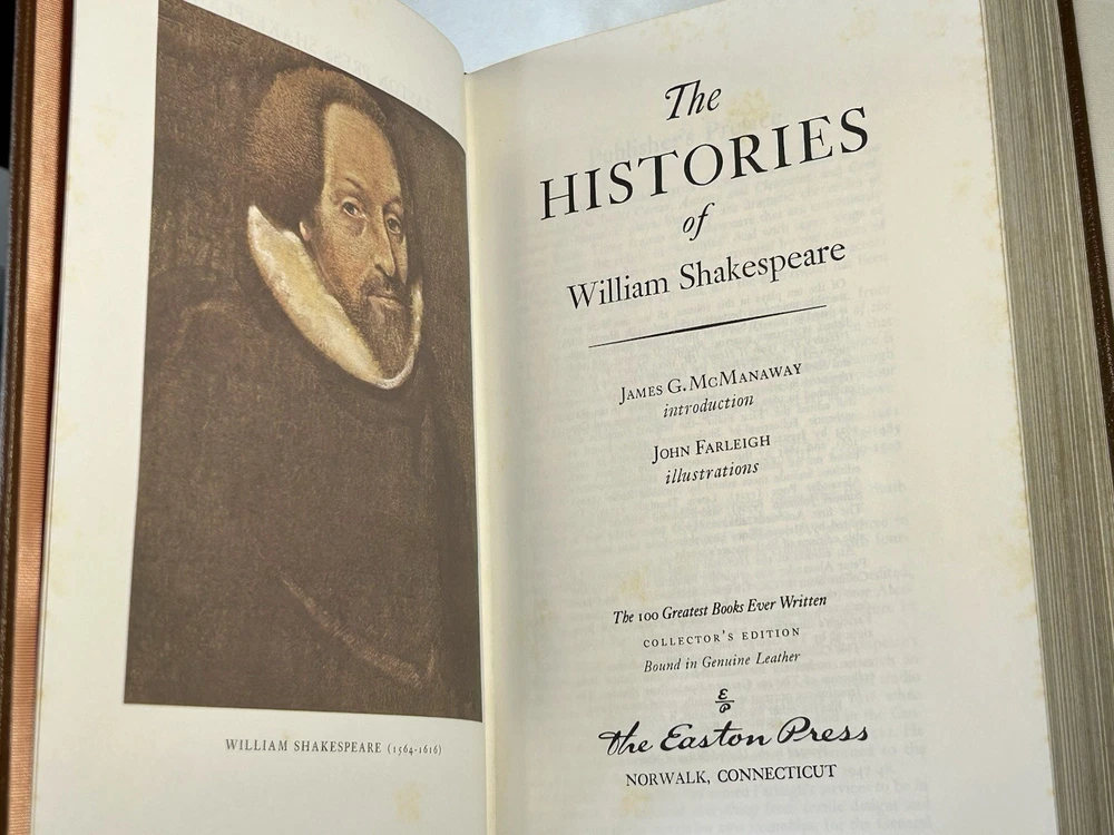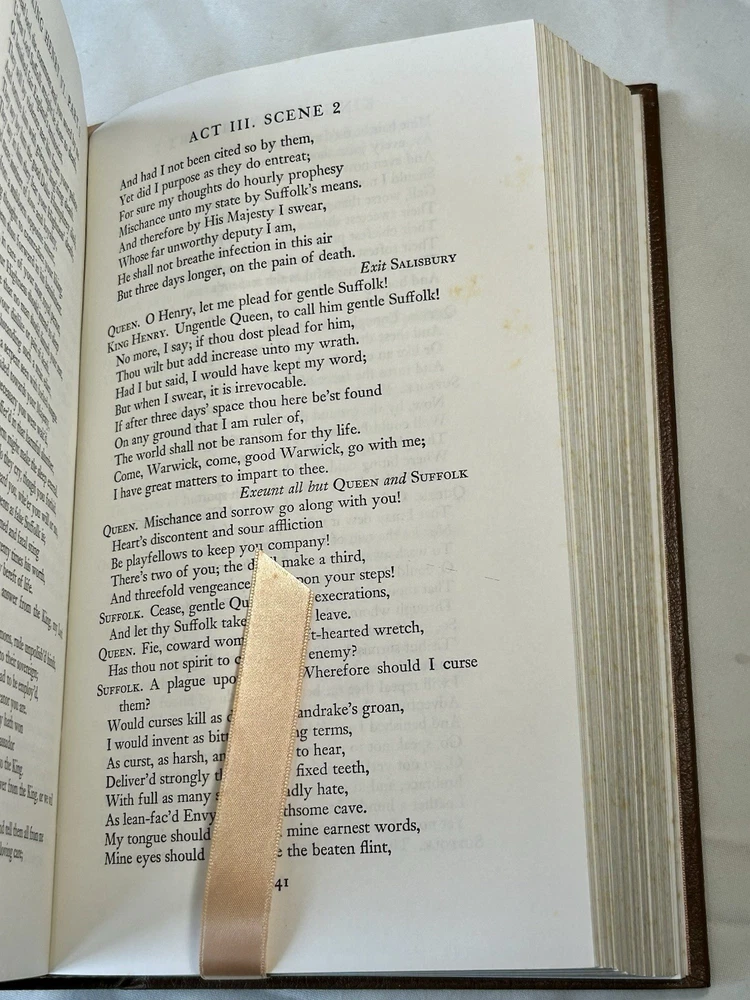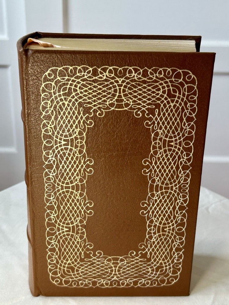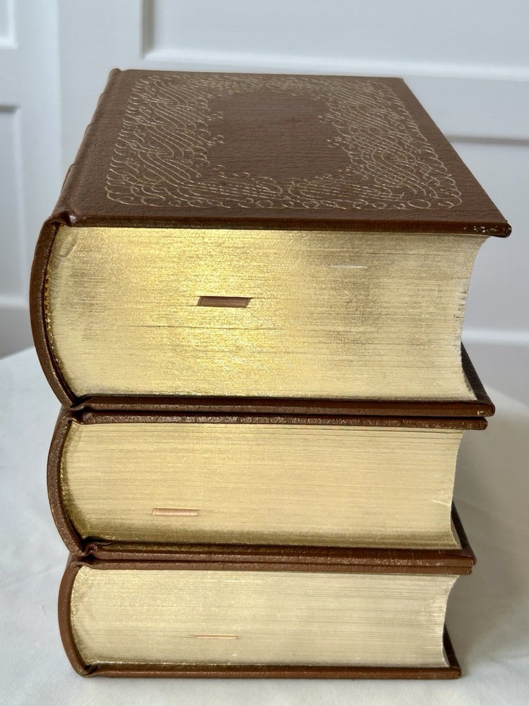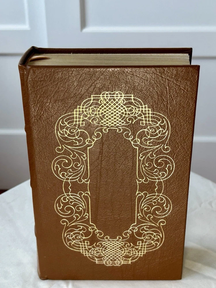 Leather bound, gold foil embossing on front, back and spine, bound in silk ribbon bookmark, satin moire endsheets, hubbed spine, archival paper, gilded edging and a durable sewn binding. Never read and in very good condition. Covers, leather, gilded edges & foil are all in good condition. No affixed bookplates or other personalizations. No marks, writing or other defects. Your books will be individually bubble wrapped and packed securely in a box to arrive to you in perfect condition.