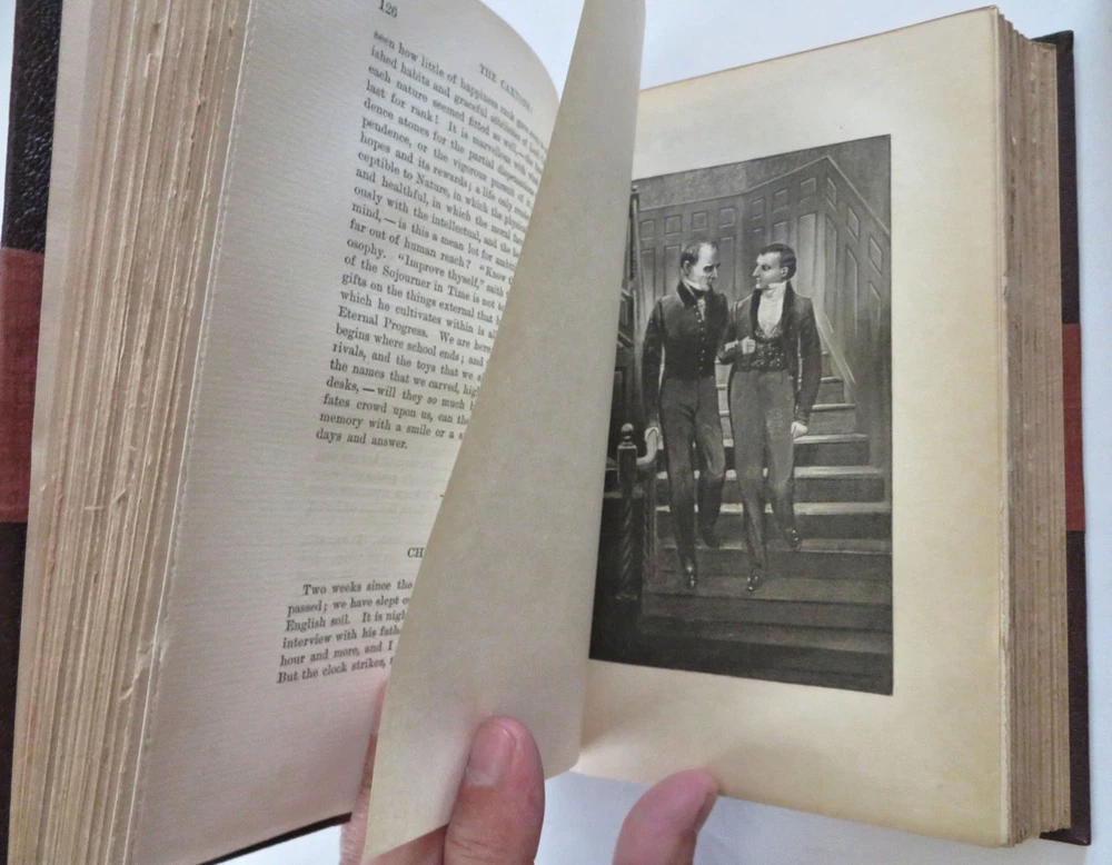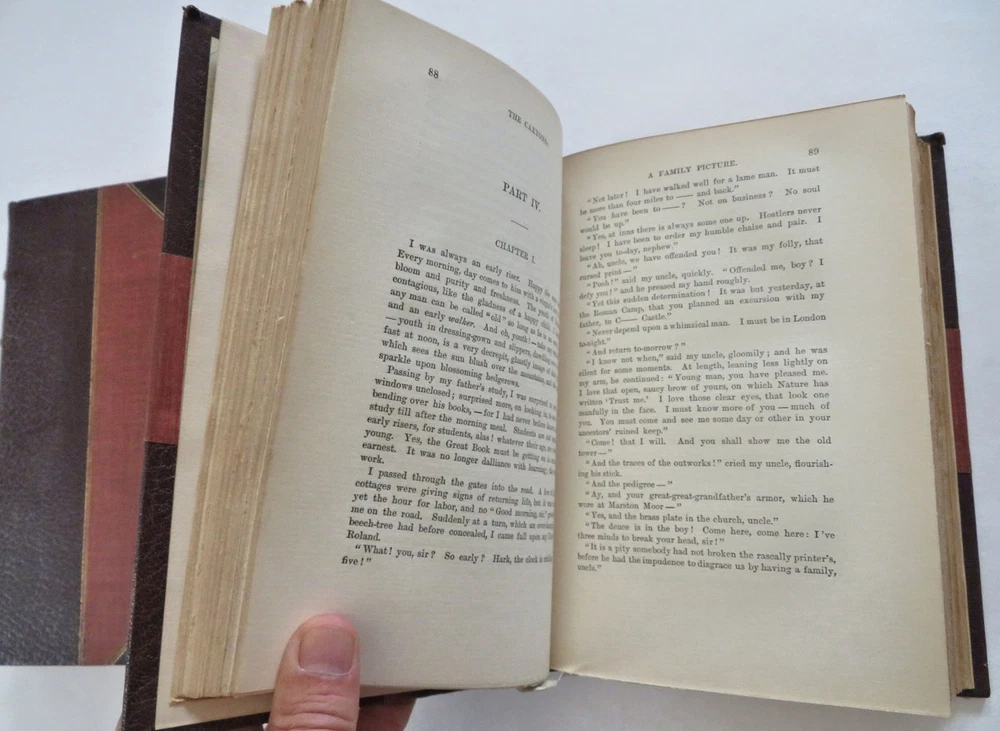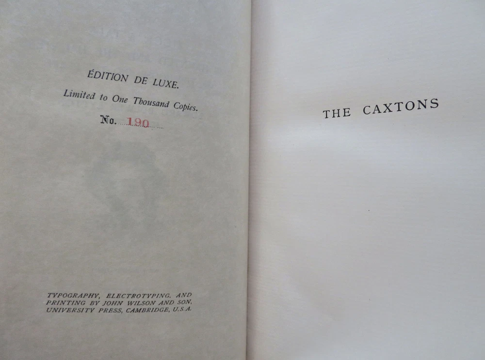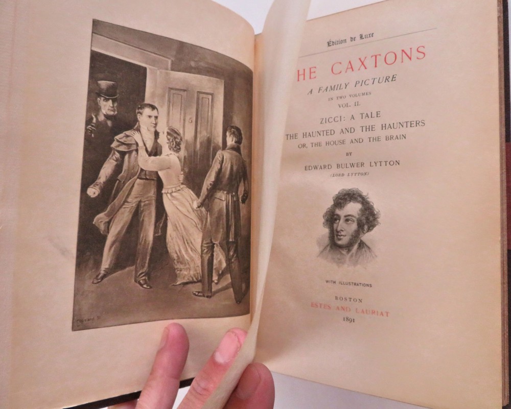 Edward Bulwer Lytton 1892 The Caxtons lovely limited edition 2 vol. leather set Edward Bulwer Lytton 1892 The Caxtons lovely limited edition 2 vol. leather set (Old Books, 19th Century Books, Leather Books, Fiction, Literature, Edward Bulwer Lytton, Illustrated Books, Decorative Leather Sets). The Caxtons: A Family Picture by Edward Bulwer Lytton. Edition de Luxe published 1892, Boston by Estes and Lauriat. 2 volumes, each c. 450 pages. Text in English. Frontispiece in each volume protected by original tissue guard. Illustrated w/ numerous plates. Attractive antiquarian 1/2 leather bindings, raised bands, gilt title lettering & compartment decorations, deckled edges. Limited edition #190 of 1,000. Beautiful early owners custom book plate to pastedown. Set is physically old and shows some signs of handling and time. Bindings gently age worn but still appealing, leather and joints slightly rubbed with small scuff spots on raised bands, but still supple, set remains overall very attractive as an object. Text block paper is gently age toned as typical, internally each book remains clean, tight and sound. A set which has been taken care of but may/ does not look like new. Still attractive on the shelf. Set displays a pleasing and unique age patina and is in rather nice antiquarian condition, any age flaws seem easy to overlook or forgive. Please review photos for more detailed attempt to present this set as it survives. We often over-describe any flaws that many sellers would not even bother to mention since most people would overlook them as minor and unworthy of comment. Many people tell us the books they receive from us are nicer in person than they appears on the screen. We want you to be clear about what you are buying, so we take numerous photos and try to describe it openly and honestly. Books Measure c. 9" H x 6" W. [B13845].