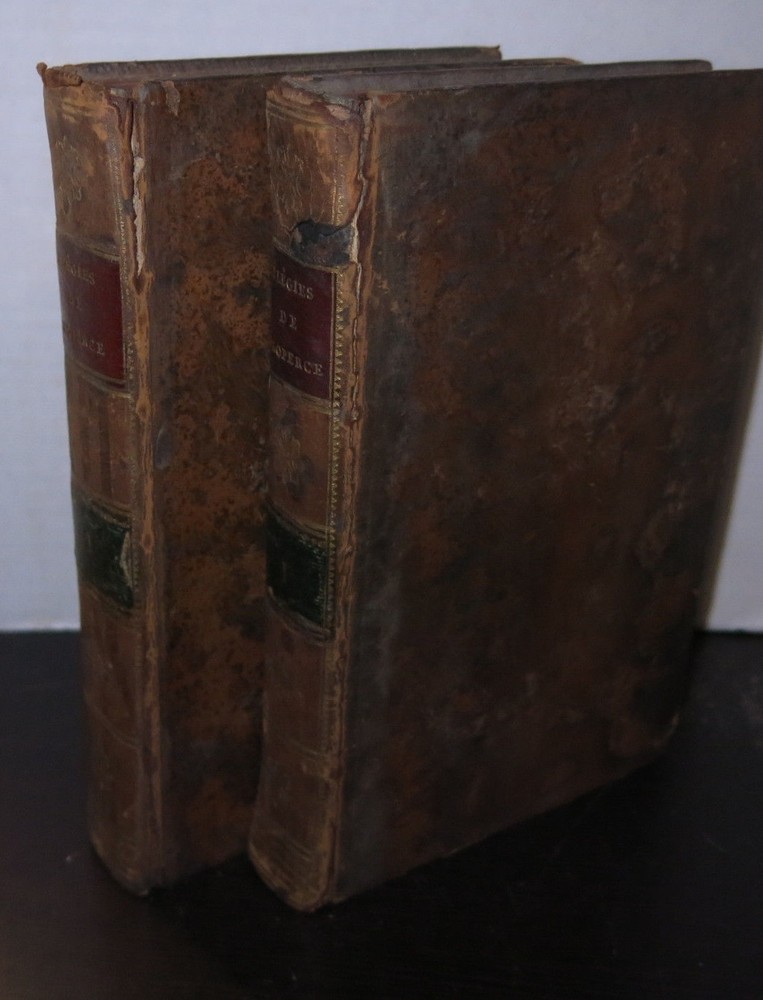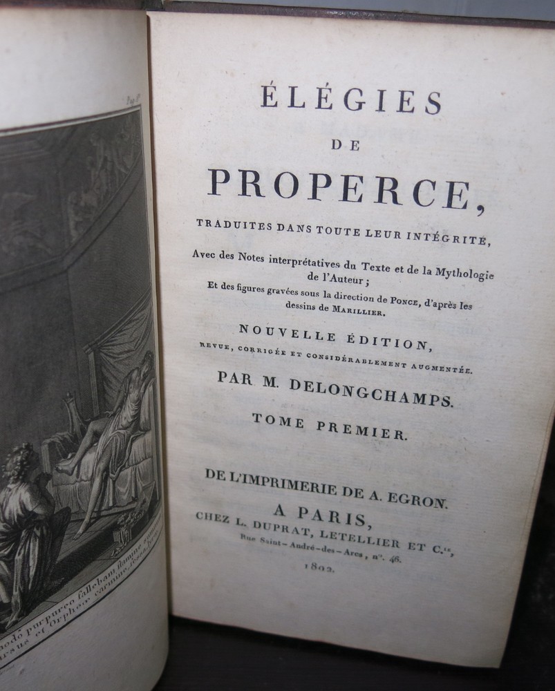 You are bidding on Elegies de Properce, Traduites dans Toute Leur Intergrite, Nouvelle Edition , Par M Delongchamps, printed 1802 by Chez Dufrat, Paris. Two 8vo volumes, uniformly bound in full leather with red and black spine labels. First thus edition of this collection of elegies by Propertius. Small piece of leather missing from upper spine of Vol I, splitting to spine joints, but a solid and clean set of a scarce title. Please email any questions and thanks for looking!