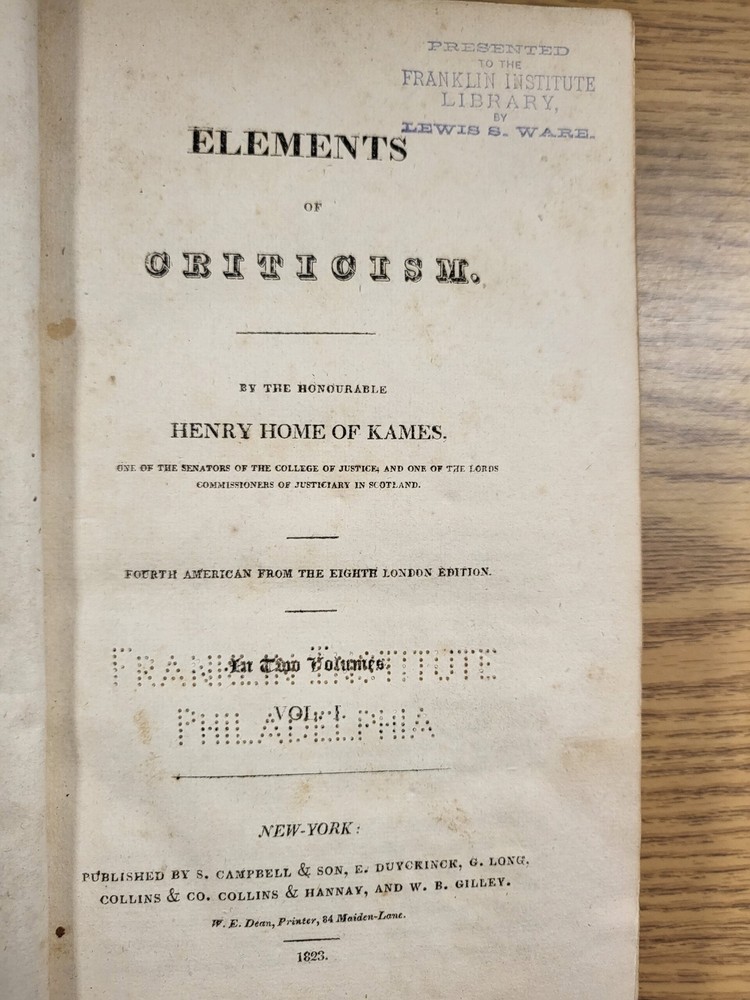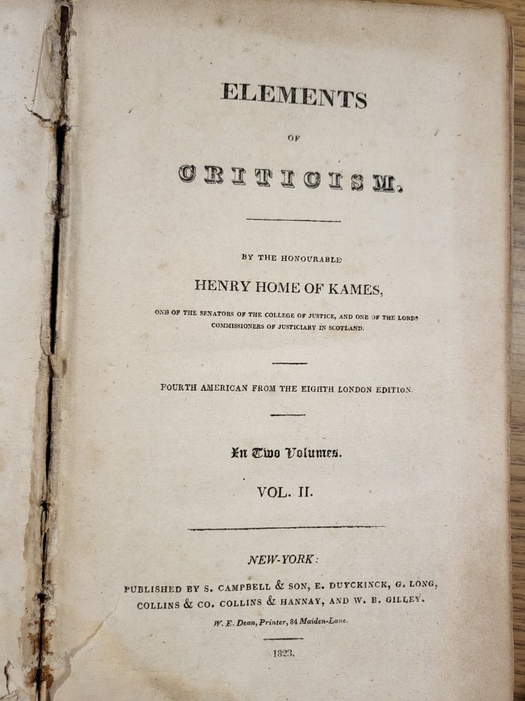 HGG Books presents ... Elements of Criticism 2 volume complete set Author: Henry Home of Kames Publisher: S Campbell and Son et al Release Date: 1823 Seller Category: Philosophy Qty Available: 1 Condition: Collectible: Acceptable Sku: elementscriticism Notes: Elements of Criticism by Henry Home of Kames, two volume complete set. Published in NY 1823Pages clean with minor toning, text block bindings solid, volume one is ex-library with usual markings, volume 1 displays heavy scuffing and red rot, volume 2 leather supple, both spine held with binding tape Don't forget to check out other great deals in our eBay Store!!