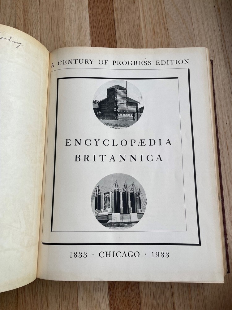 Encyclopaedia Britannica, 1933, A Century of Progress Edition, Complete Set (24 Volumes + Brittanica Book of the Year 1938 and 1939). Some wear on the binding from removing the books from a shelf. Otherwise in great condition.